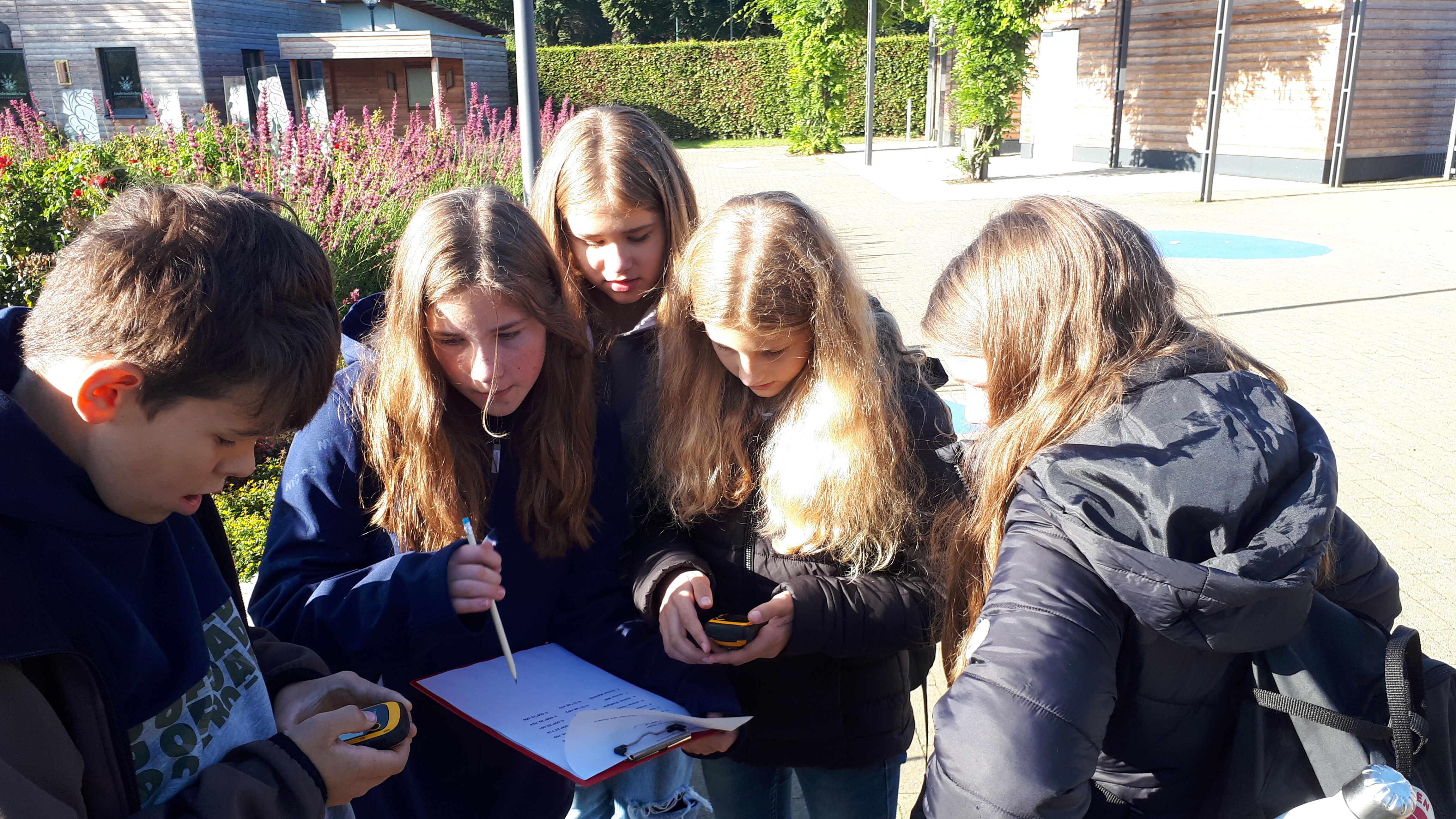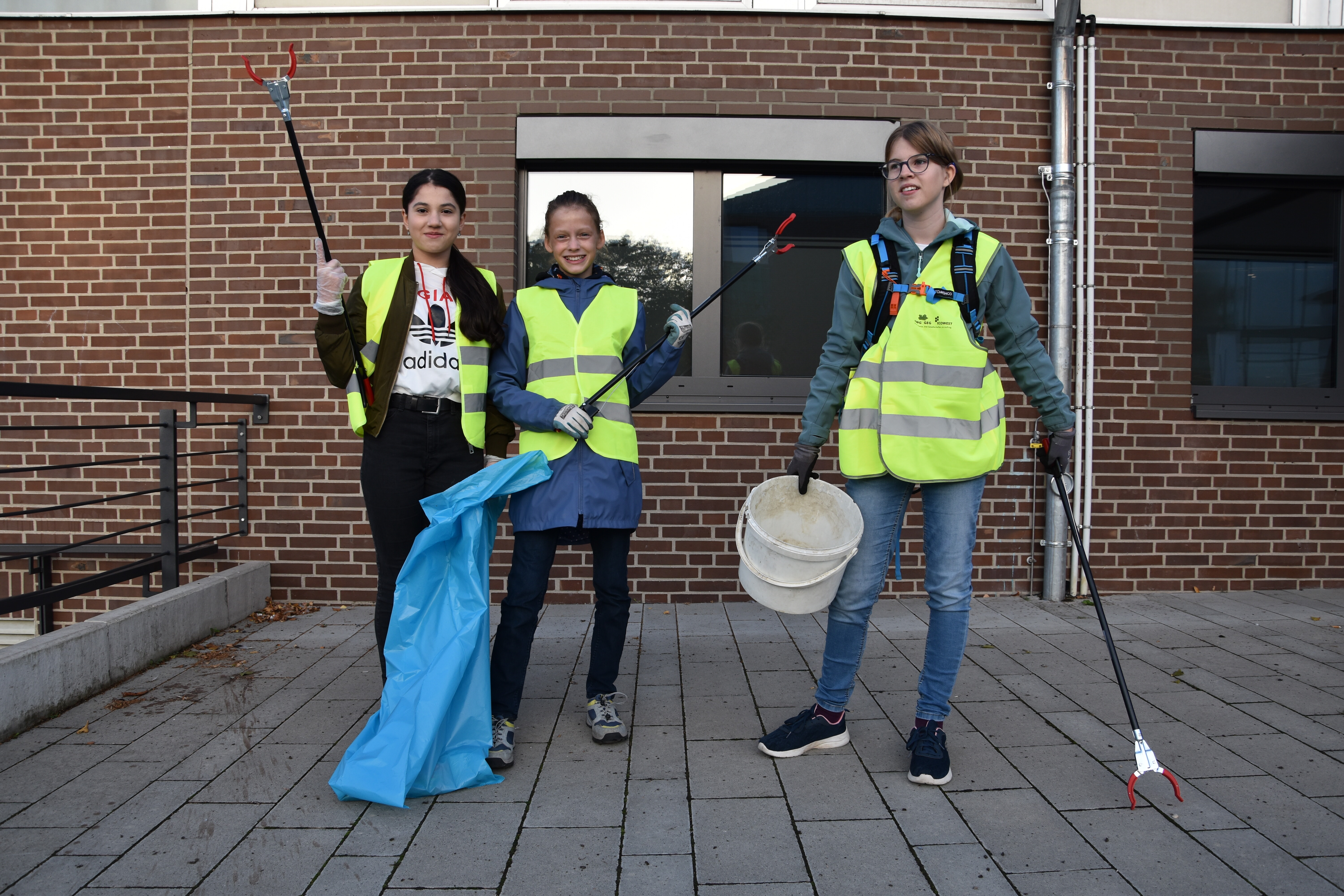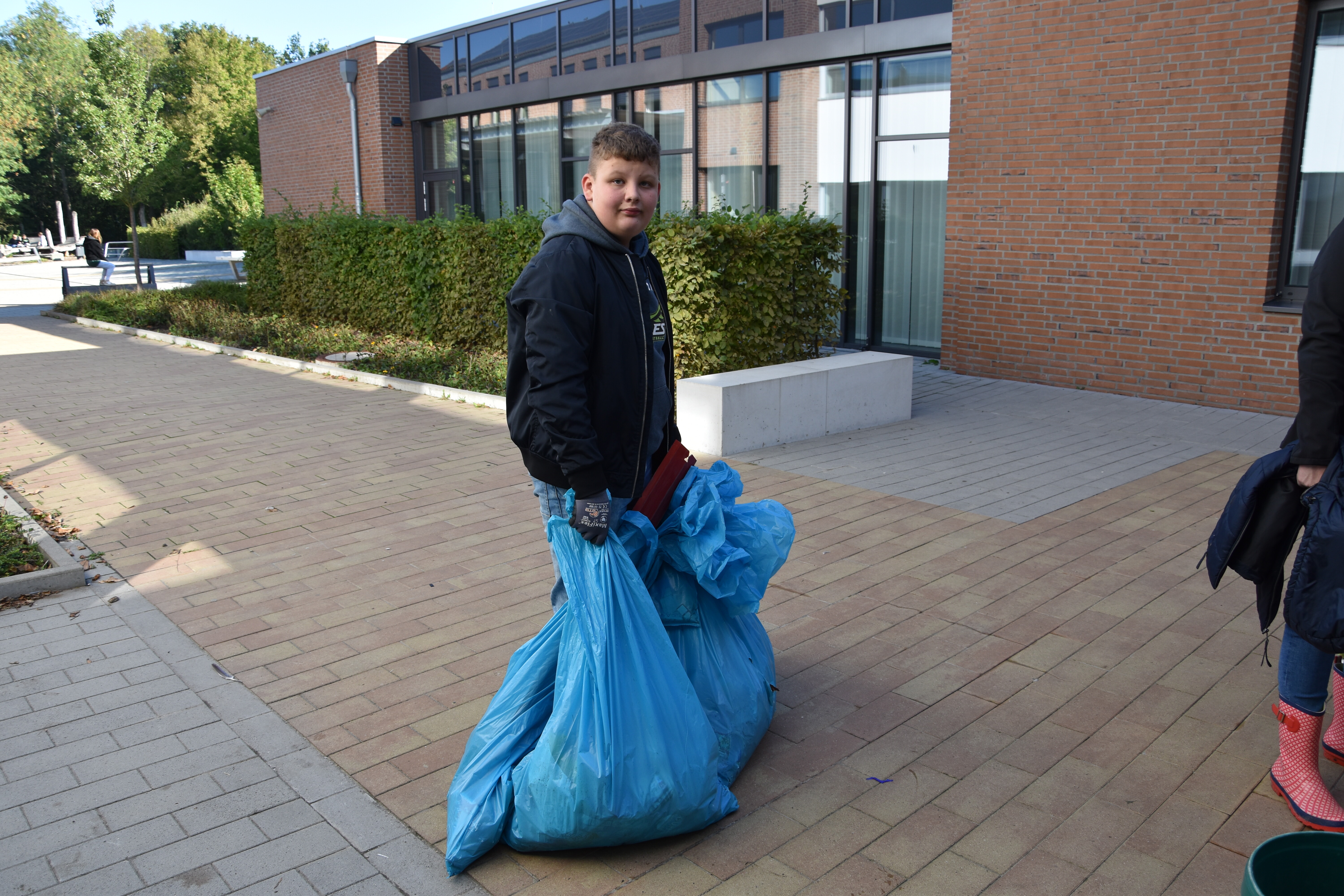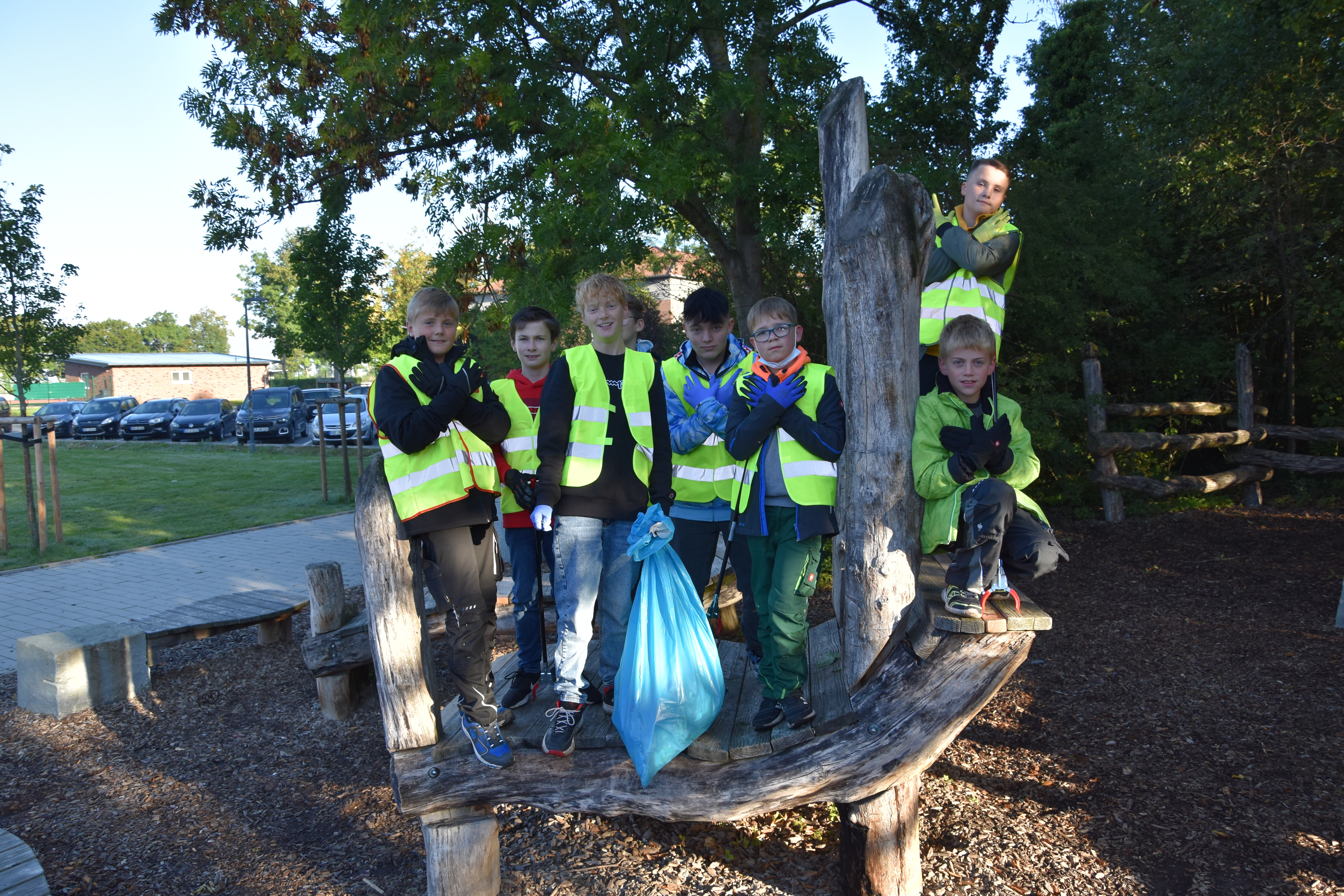 Rund um die Schule gab es viele aktive Schüler*innen zu sehen. Auf der Suche nach Entsorgungsmöglichkeiten im Ortsteil Wadersloh durchstreiften einige Siebener und Achter den Ort in Form einer Foto-Safari. Gleich zwei Workshop-Gruppen entsandten eine Menge Teams, um das Schulgelände und umliegende Bauernschaft-Straßen von Müll zu befreien. Zwei Gruppen verließen das Schulgelände sogar mit dem Bus. Die eine hatte das Betriebsgelände der AWG in Ennigerloh zum Ziel, wo sie in der hauseigenen Wertstoffwerkstatt an Miniaturen von Mülltrennungsmaschinen die großen Prozesse hautnah nachempfinden konnten. Eine andere Gruppe fuhr zum Klimapark nach Rietberg, wo sie an einer GPS-Rallye mit klimatischen Inhalten teilnahmen.