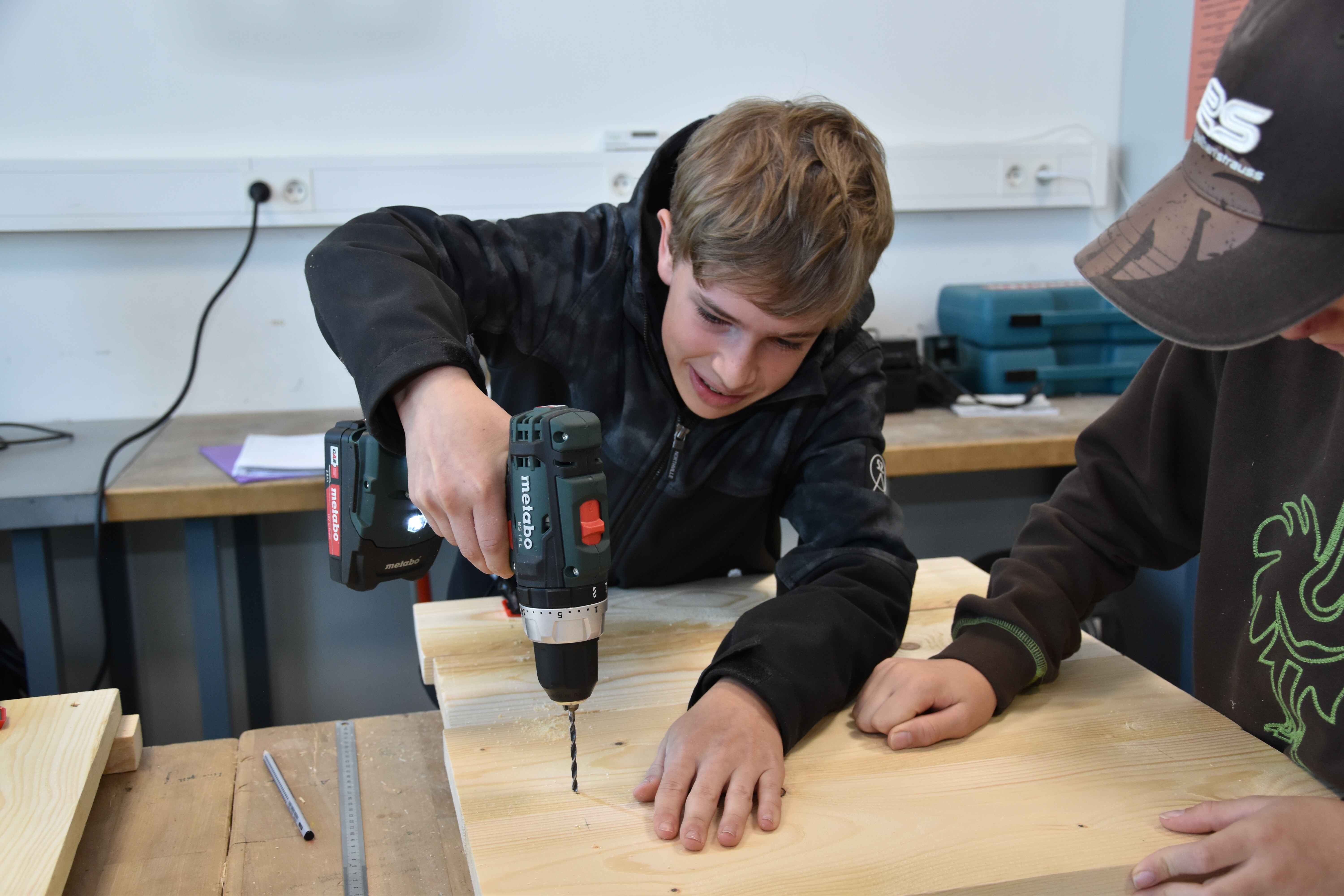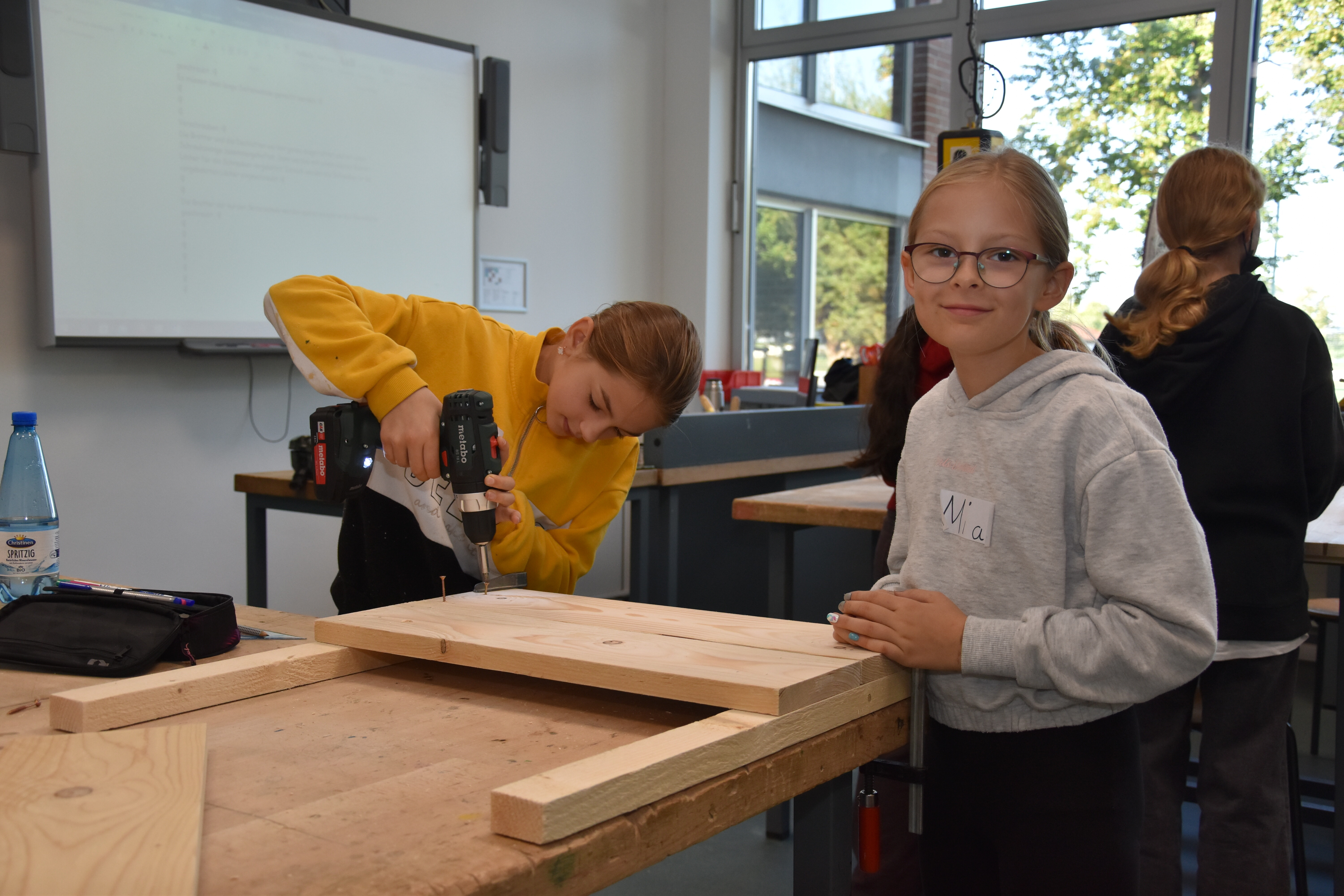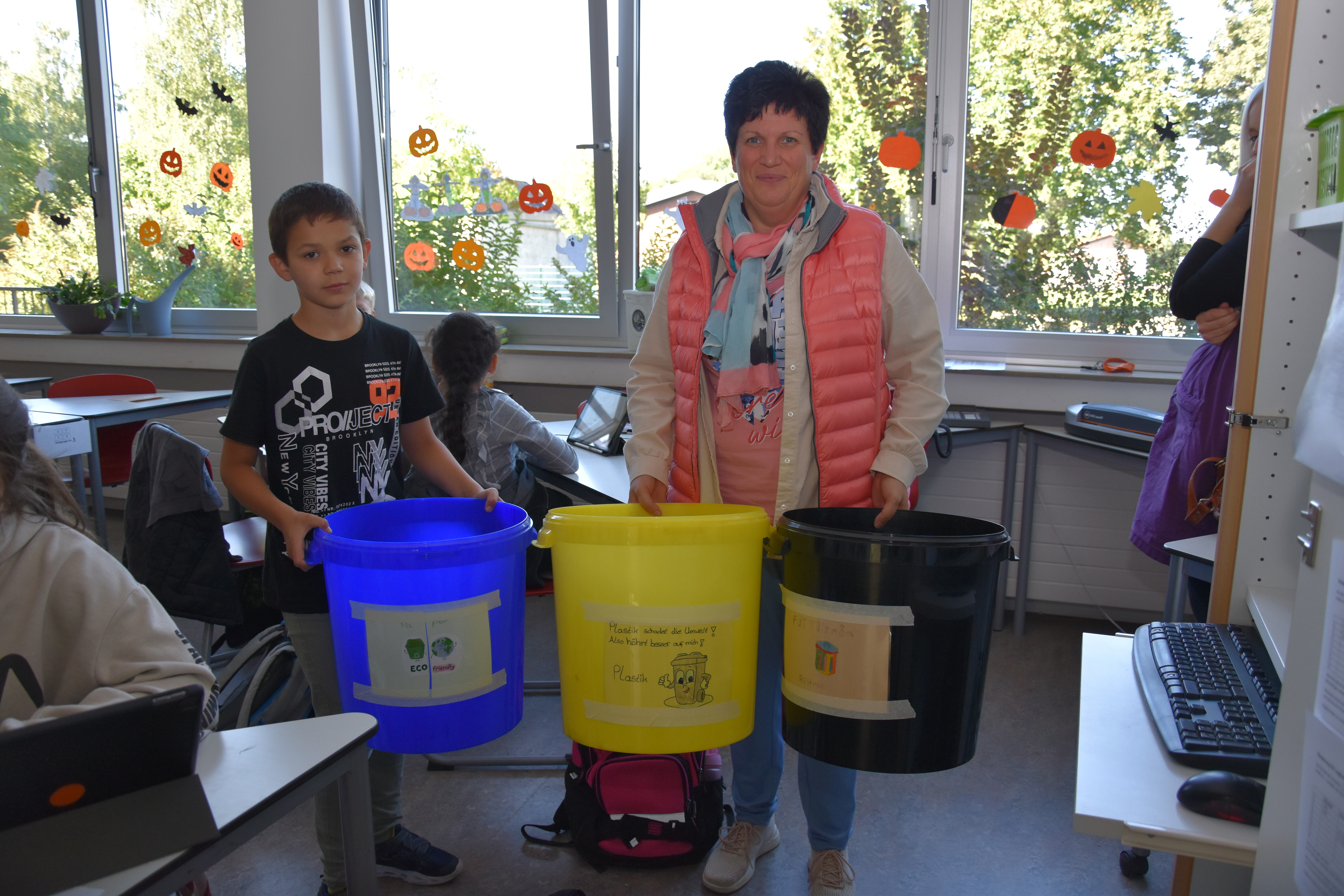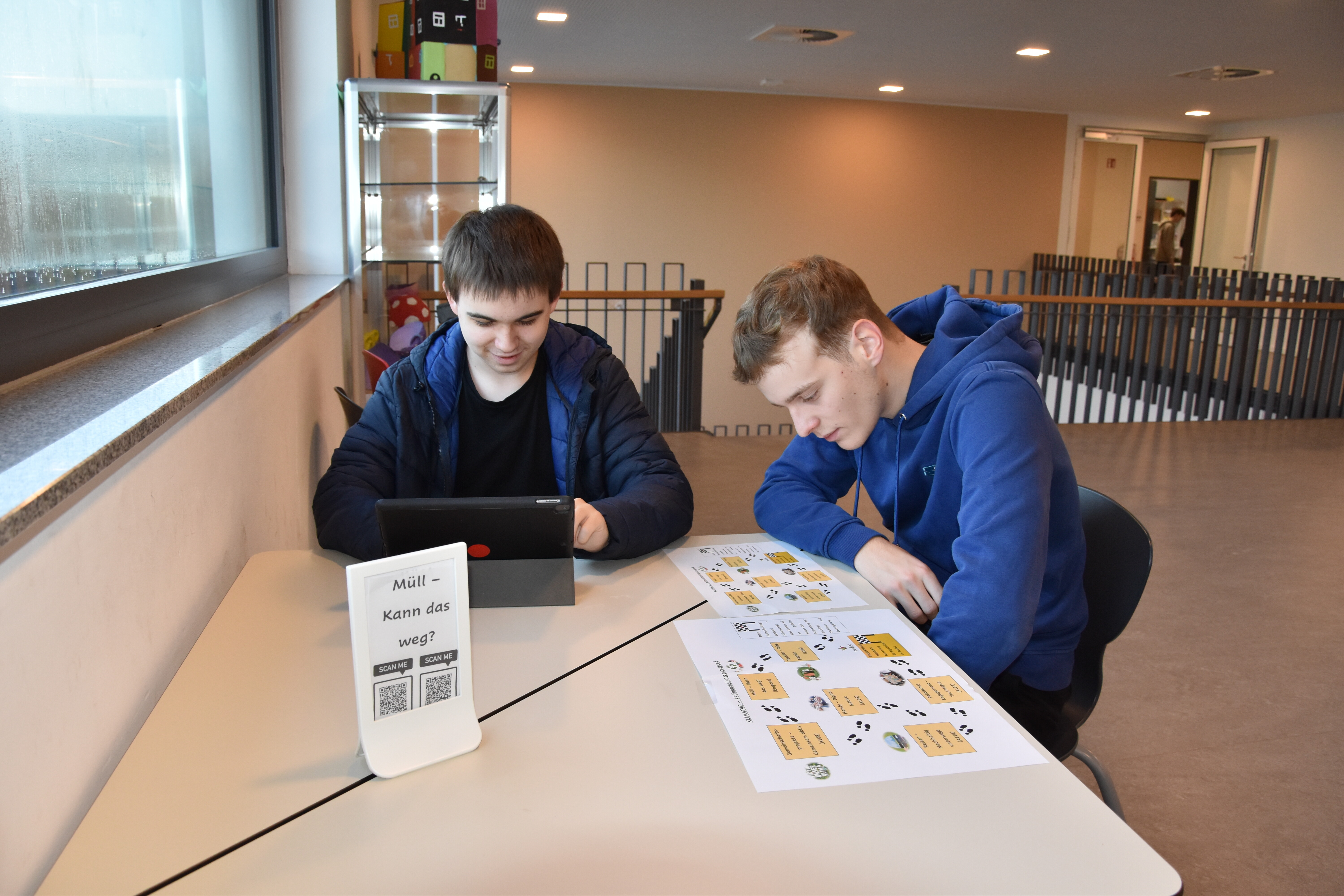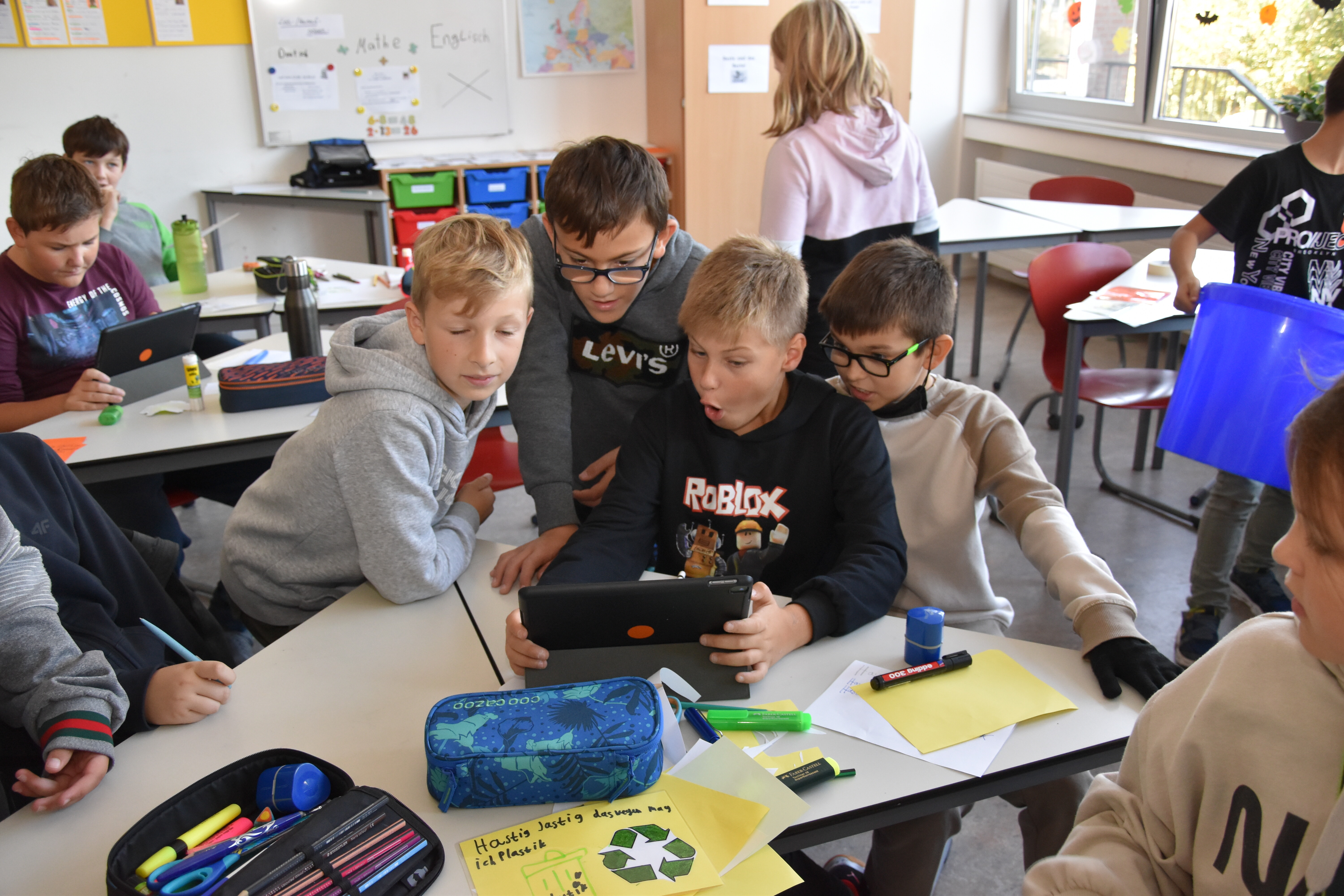 Rund um die Schule gab es viele aktive Schüler*innen zu sehen. Auf der Suche nach Entsorgungsmöglichkeiten im Ortsteil Wadersloh durchstreiften einige Siebener und Achter den Ort in Form einer Foto-Safari. Gleich zwei Workshop-Gruppen entsandten eine Menge Teams, um das Schulgelände und umliegende Bauernschaft-Straßen von Müll zu befreien. Zwei Gruppen verließen das Schulgelände sogar mit dem Bus. Die eine hatte das Betriebsgelände der AWG in Ennigerloh zum Ziel, wo sie in der hauseigenen Wertstoffwerkstatt an Miniaturen von Mülltrennungsmaschinen die großen Prozesse hautnah nachempfinden konnten. Eine andere Gruppe fuhr zum Klimapark nach Rietberg, wo sie an einer GPS-Rallye mit klimatischen Inhalten teilnahmen.