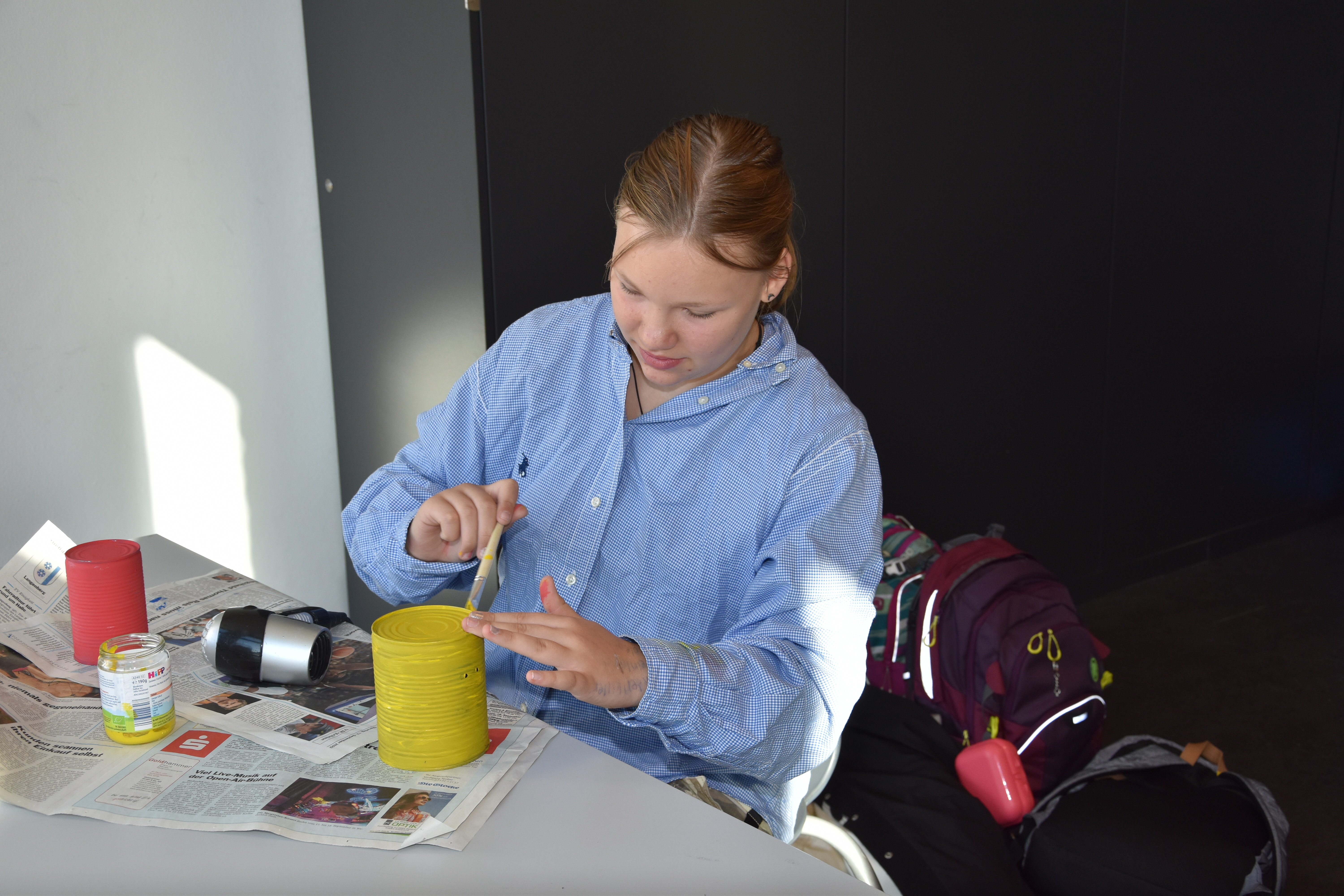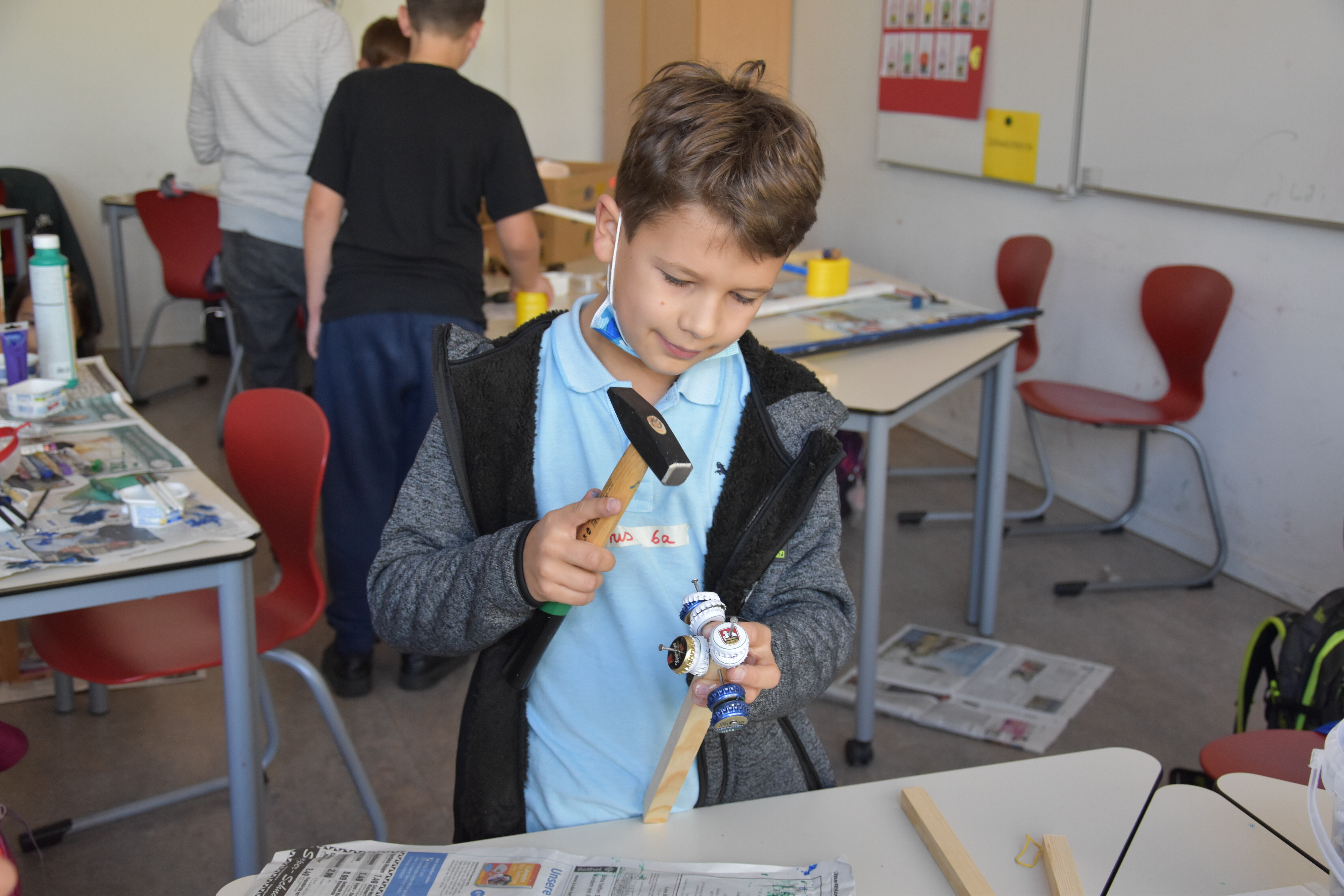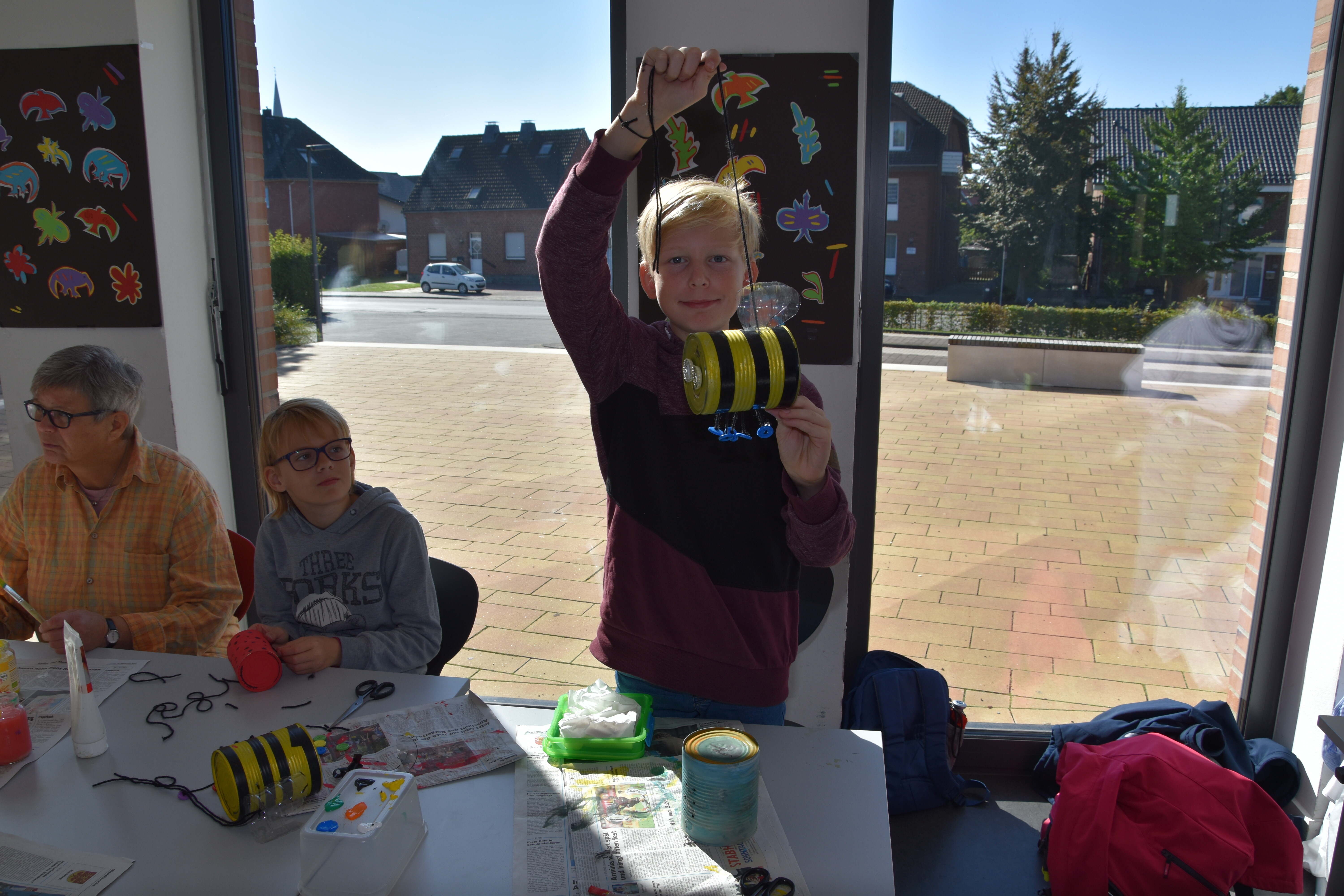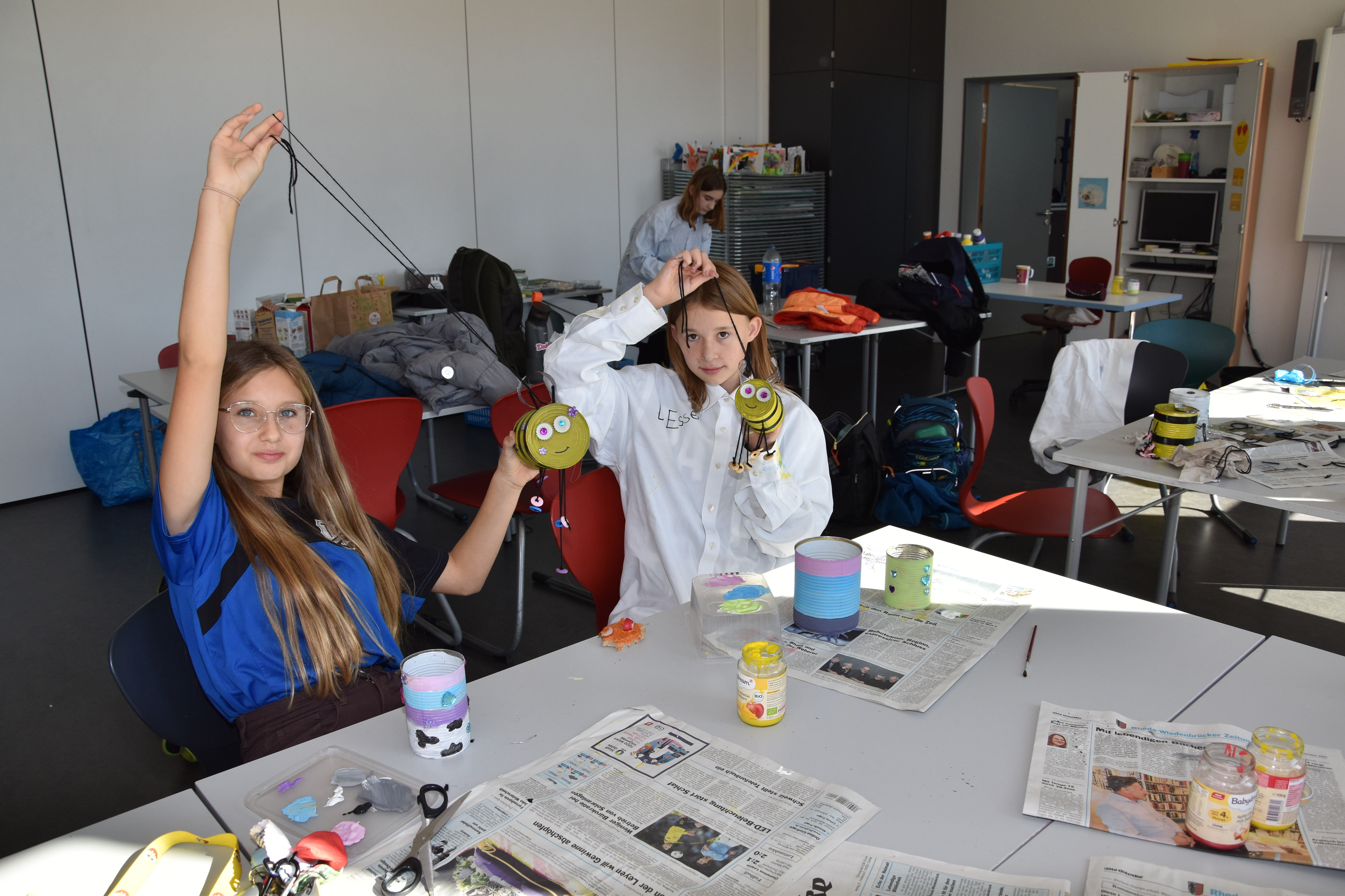 Insgesamt standen 15 Workshops für die Schülerinnen und Schüler der Jahrgänge 5 bis 8 bereit. Die Lehrerinnen und Lehrer der Sekundarschule hatten sich im Vorhinein ein vielfältiges Programm ausgedacht, in dem sowohl die praktischen als auch die theoretischen Fähigkeiten der Schüler*innen gefordert waren. Kreativität wurde den ganzen Vormittag lang großgeschrieben, sei es beim Basteln von Instrumenten aus Müll oder Obstnetzen aus Stoffresten, dem Upcyceln von alten Konservendosen zu lustigen Deko-Bienen oder dem Gestalten von Slogans für die Schulmülltonnen. Praktische Tipps für ein nachhaltiges Leben gab es auch in vielseitiger Form: Der Schulgarten ist jetzt um eine Wurmkiste reicher, in der Küchenabfälle auf ganz natürliche Art und Weise zu Kompost und schließlich nährstoffreicher Blumenerde wird. Schüler*innen, die diesen Workshop besuchten, kennen jetzt übrigens auch den Unterschied zwischen Regen- und Kompostwürmern.