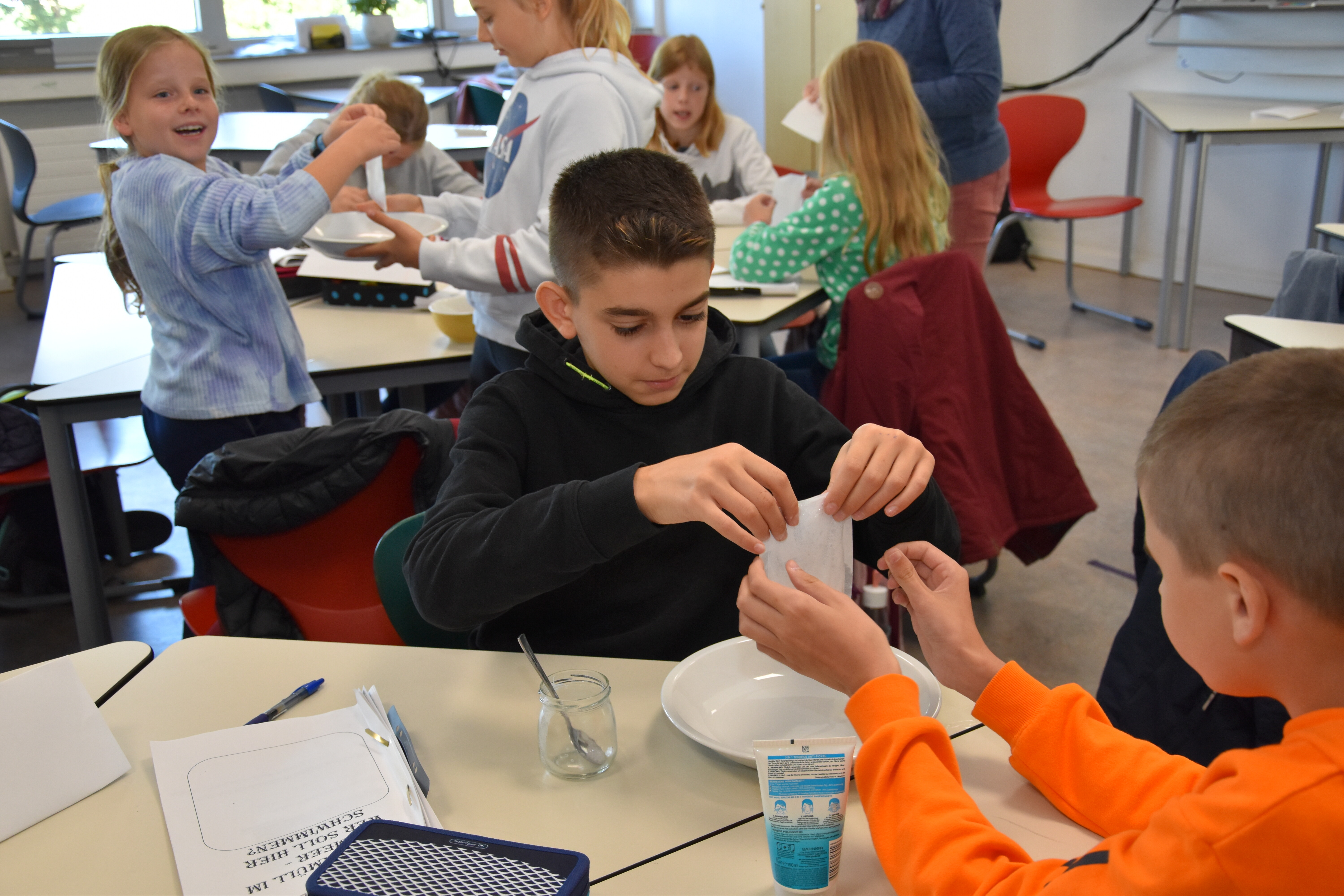 Neben den vielen, eigens von den Lehrer*innen der Sekundarschule erdachten und durchgeführten, Workshops waren auch einige externe Partner zu Gast. Bei den Klima Teens von Energy4Climate ging es um Plastikmüll. Innerhalb kleiner Experimente wurden verschiedene Aspekte rund um das Thema erfahrbar gemacht. Die neunten Jahrgänge hatten ein eigenes Programm. Während ein Großteil der Stufe sich mit einer interaktiven Lernlandkarte beschäftigte, bekam jeweils eine Klasse Input zum Thema alternative Energien. Hierfür besuchte uns eine Referentin der Deutschen Umwelt-Aktion e.V. aus Münster und gab ihre Expertise an die Schüler*innen weiter.