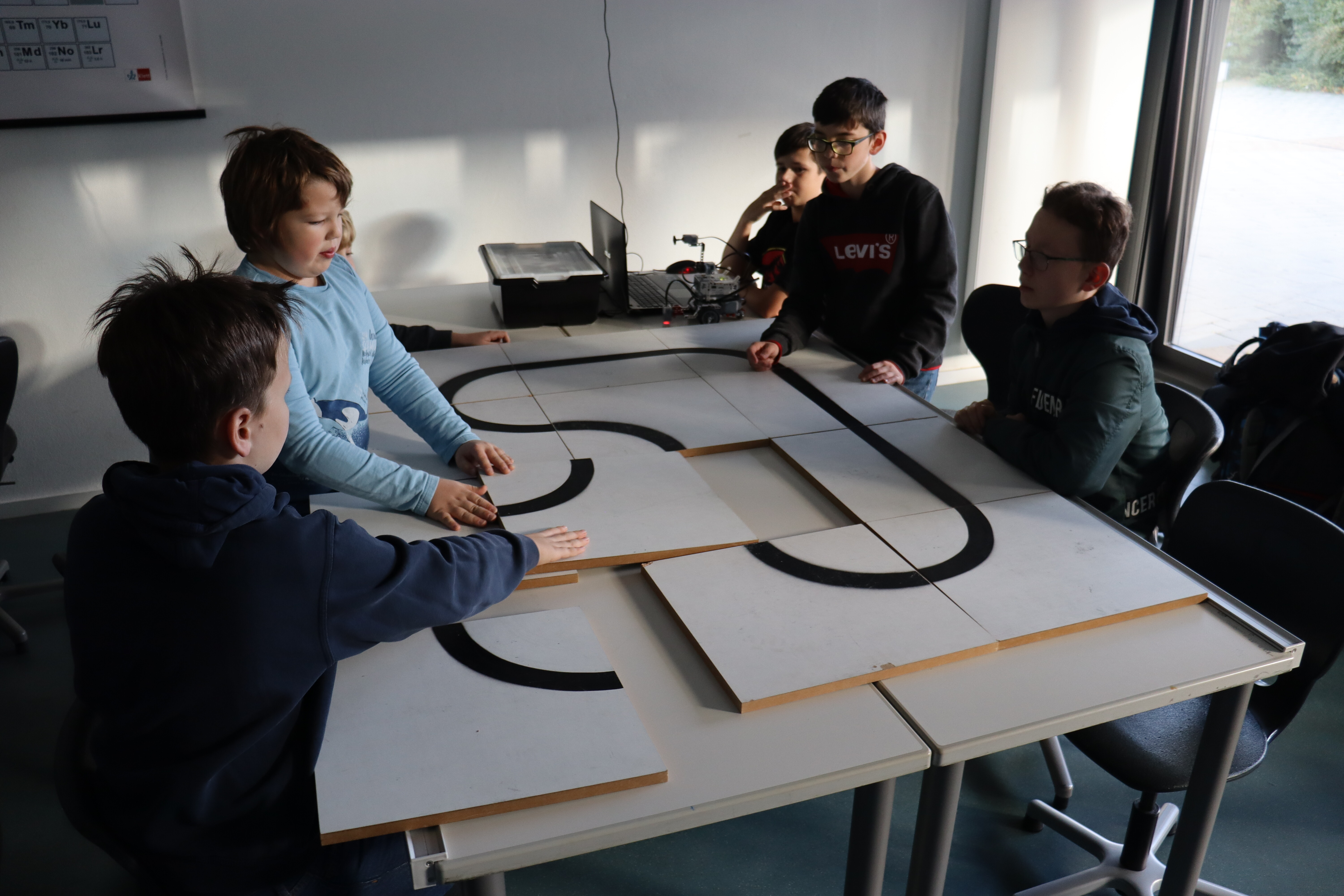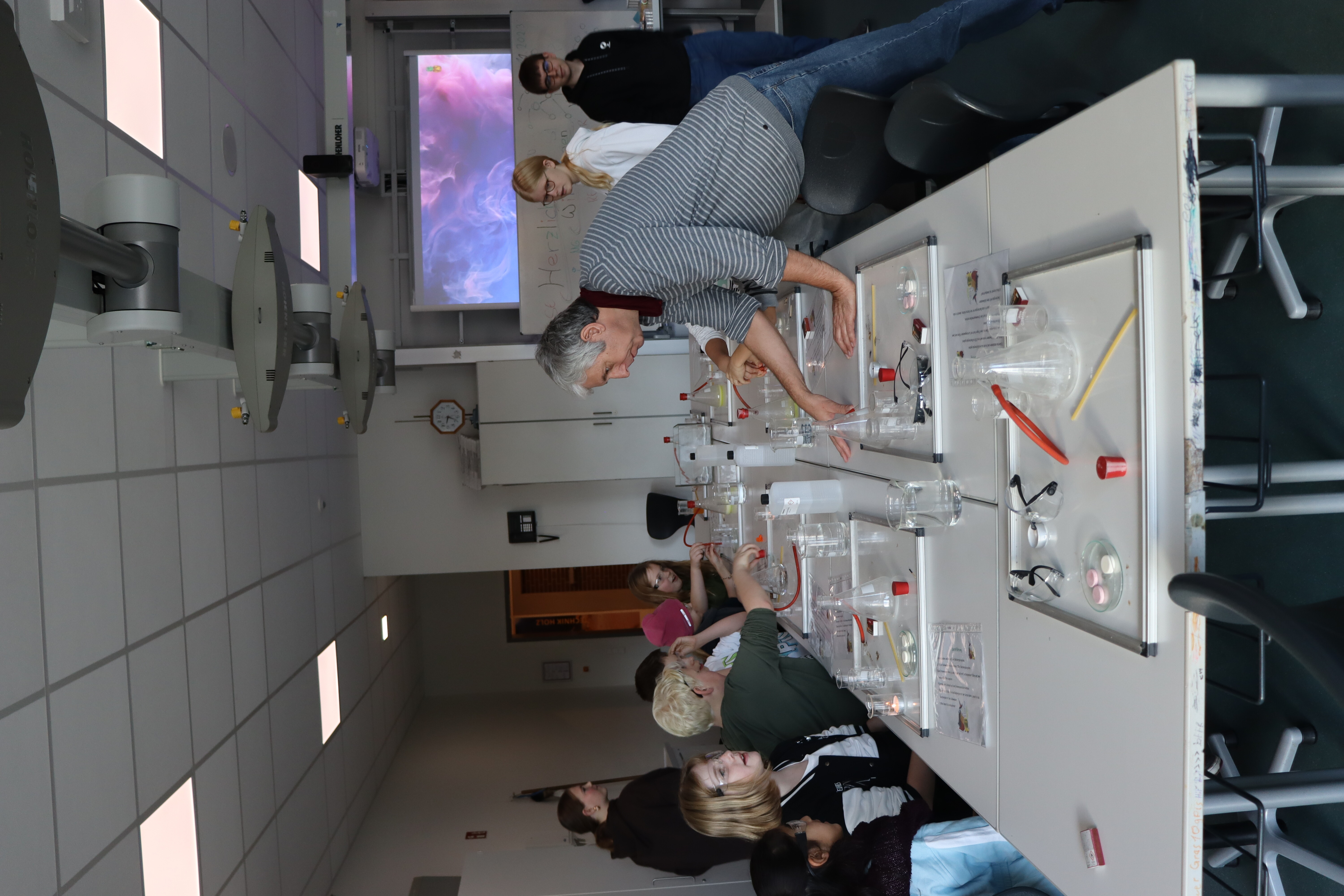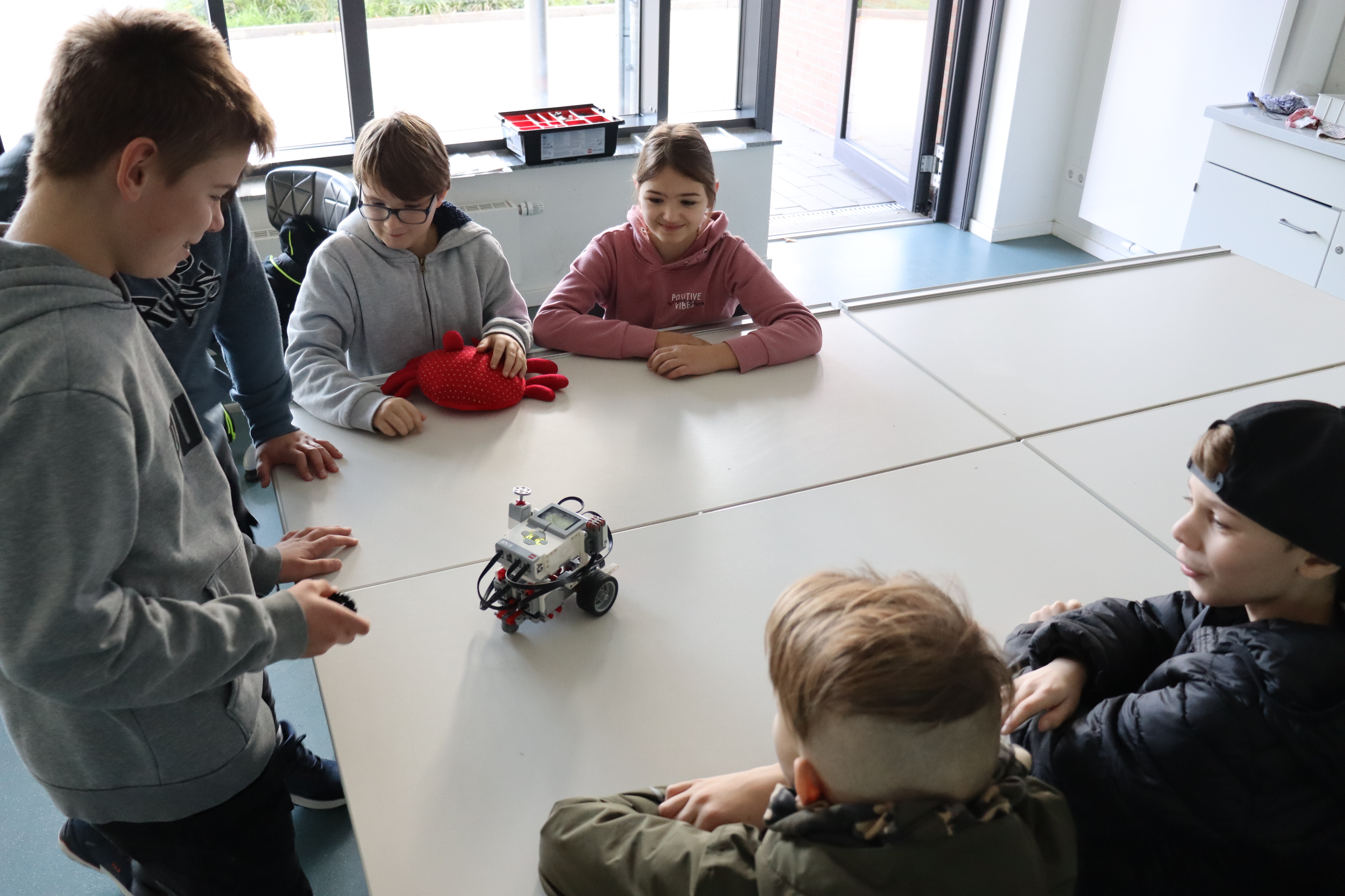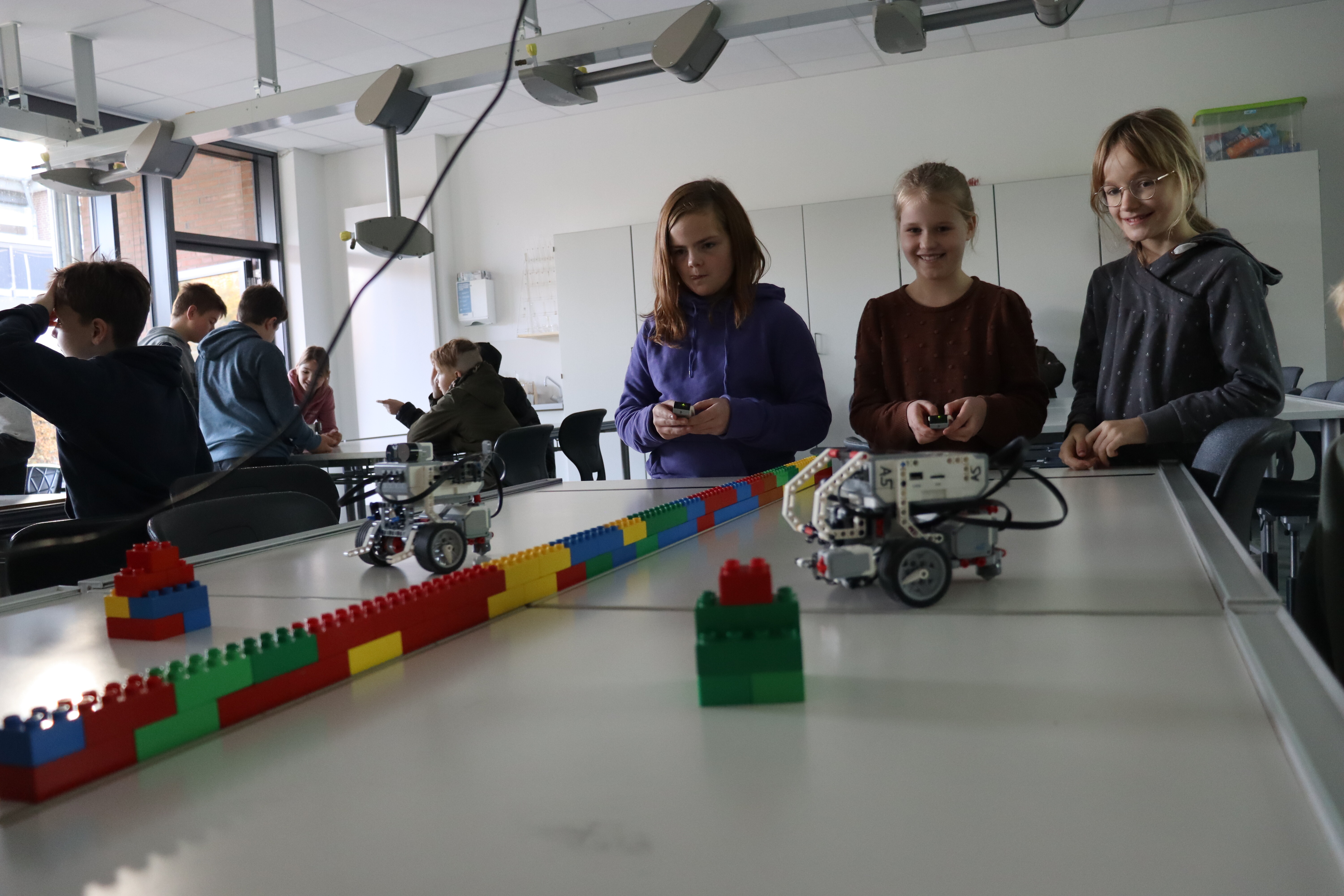 Durch 10 SchülerInnen des 9.Jahrgangs werden die GrundschülerInnen durch die SKW geführt und lernen die Fächer Englisch, Informatik, Hauswirtschaft, Chemie und die Robotik-AG näher kennen.