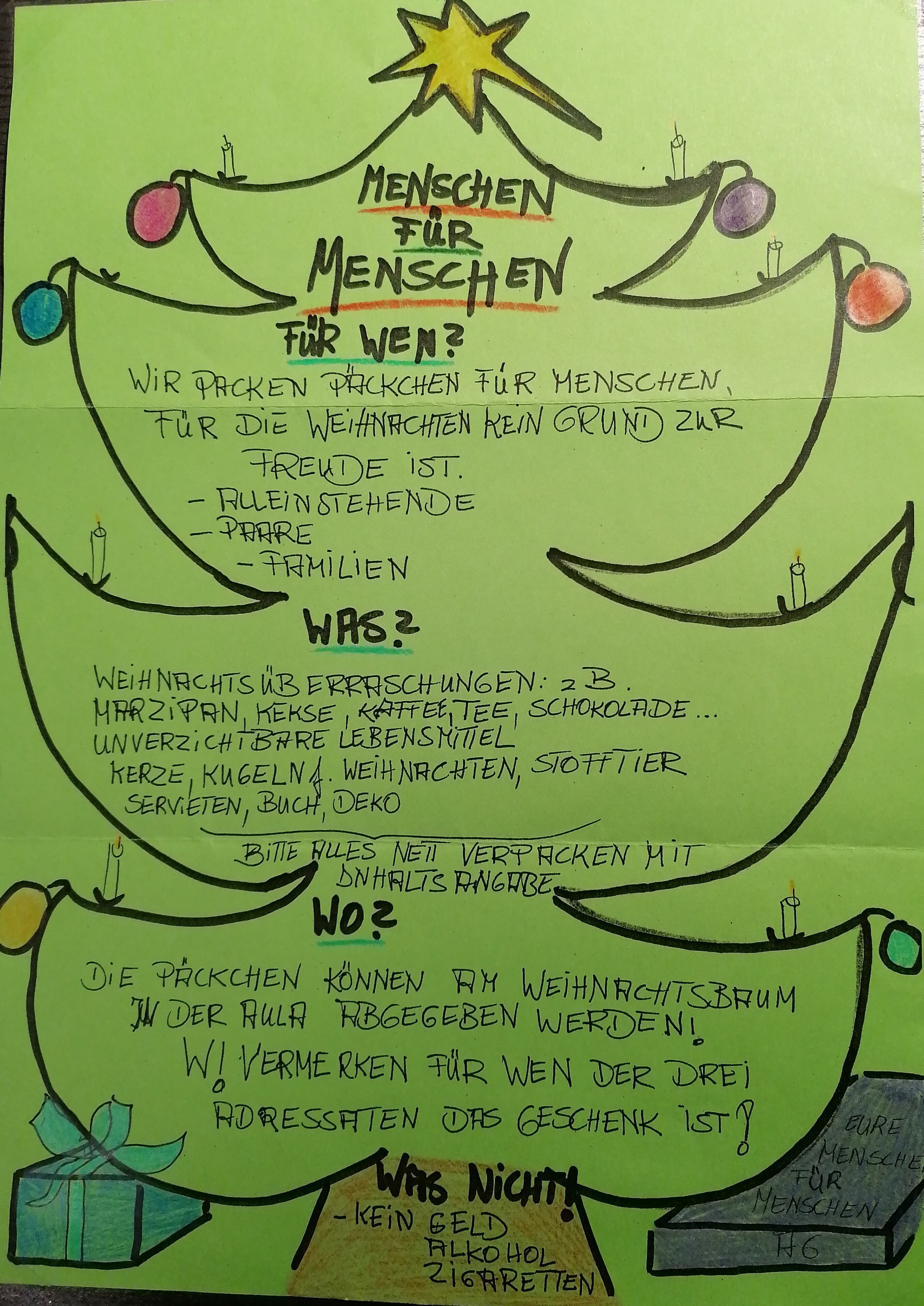 Die AG möchte Päckchen für Alleinstehende, Paare und Familien packen und diese in den großen Pausen am Weihnachtsbaum in der Mensa sammeln. Verteilt werden diese Päckchen dann anonym in der letzten Woche vor Weihnachten über den Ortsverein der Caritas.