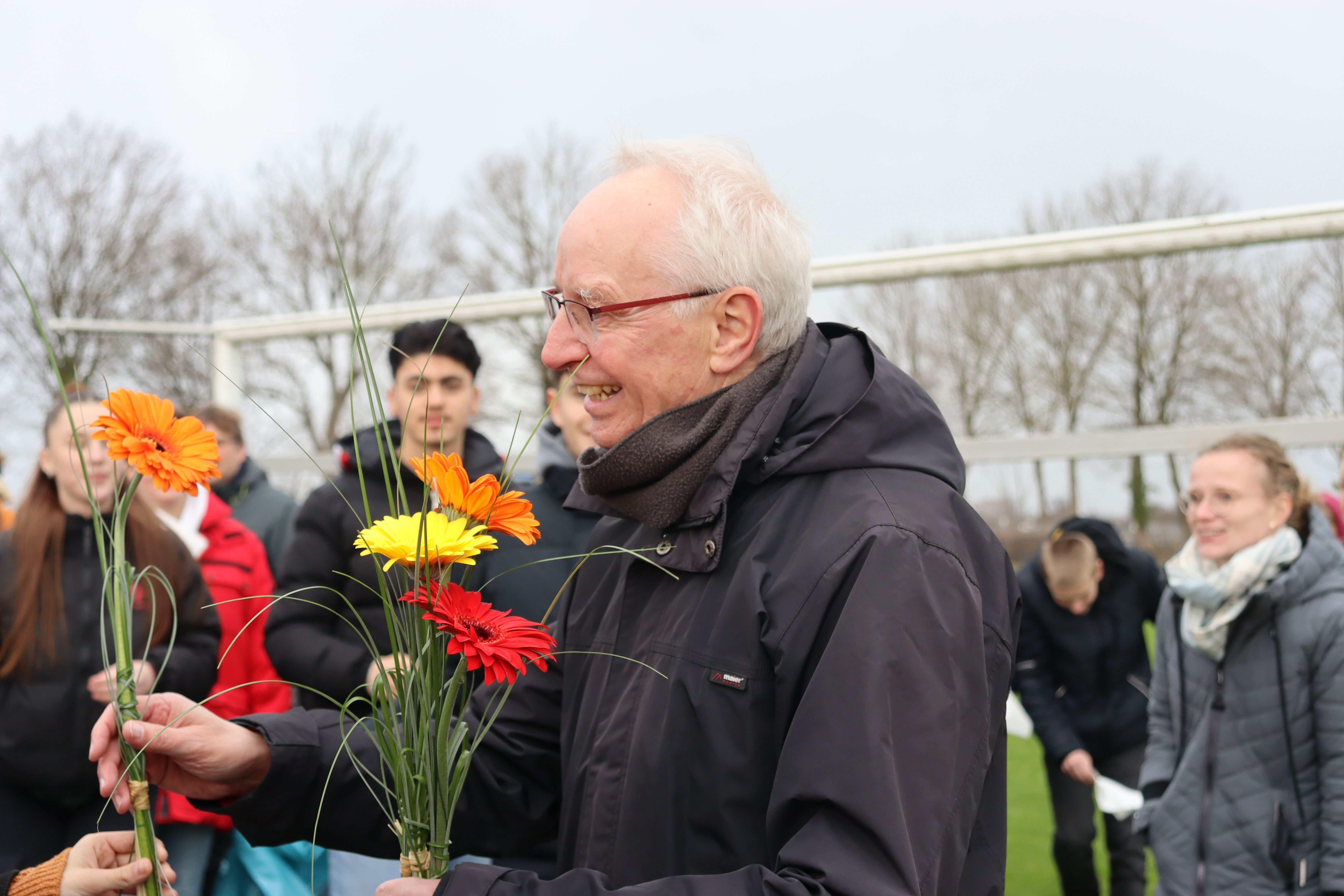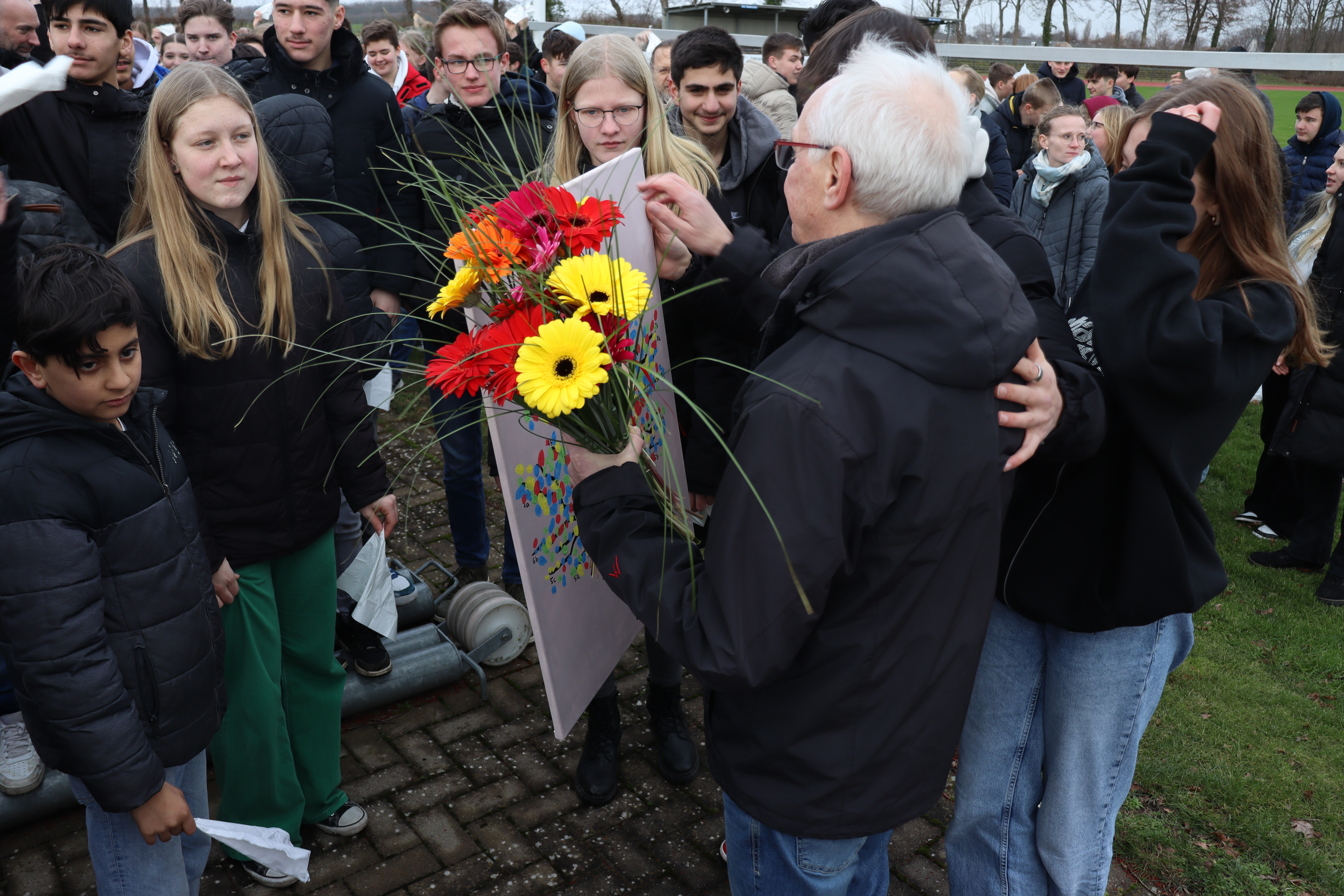 Die KlassensprecherInnen überraschten Herrn Großbröhmer mit Blumen, der völlig überrascht, aus dem Grinsen nicht mehr herauskam.