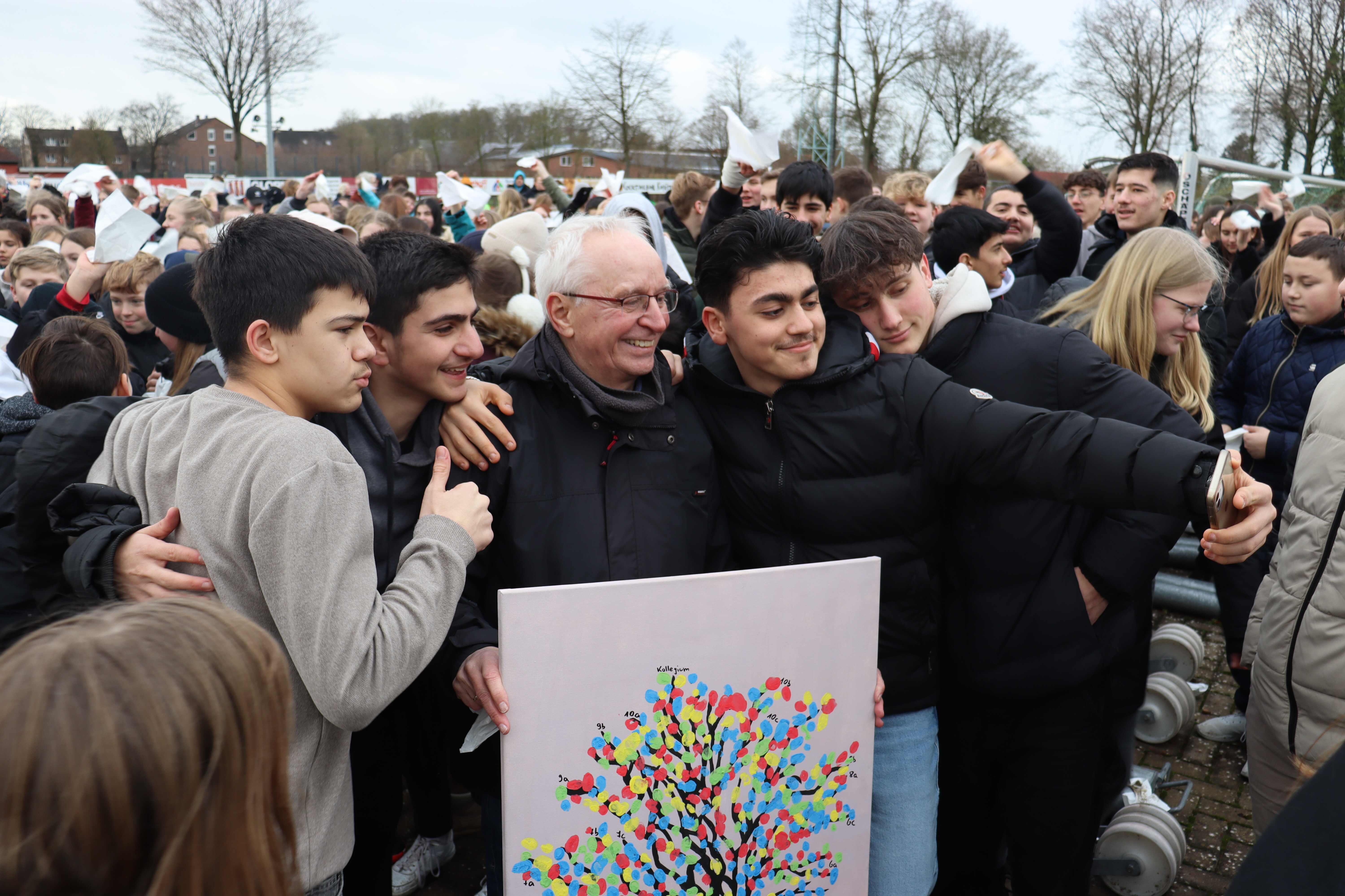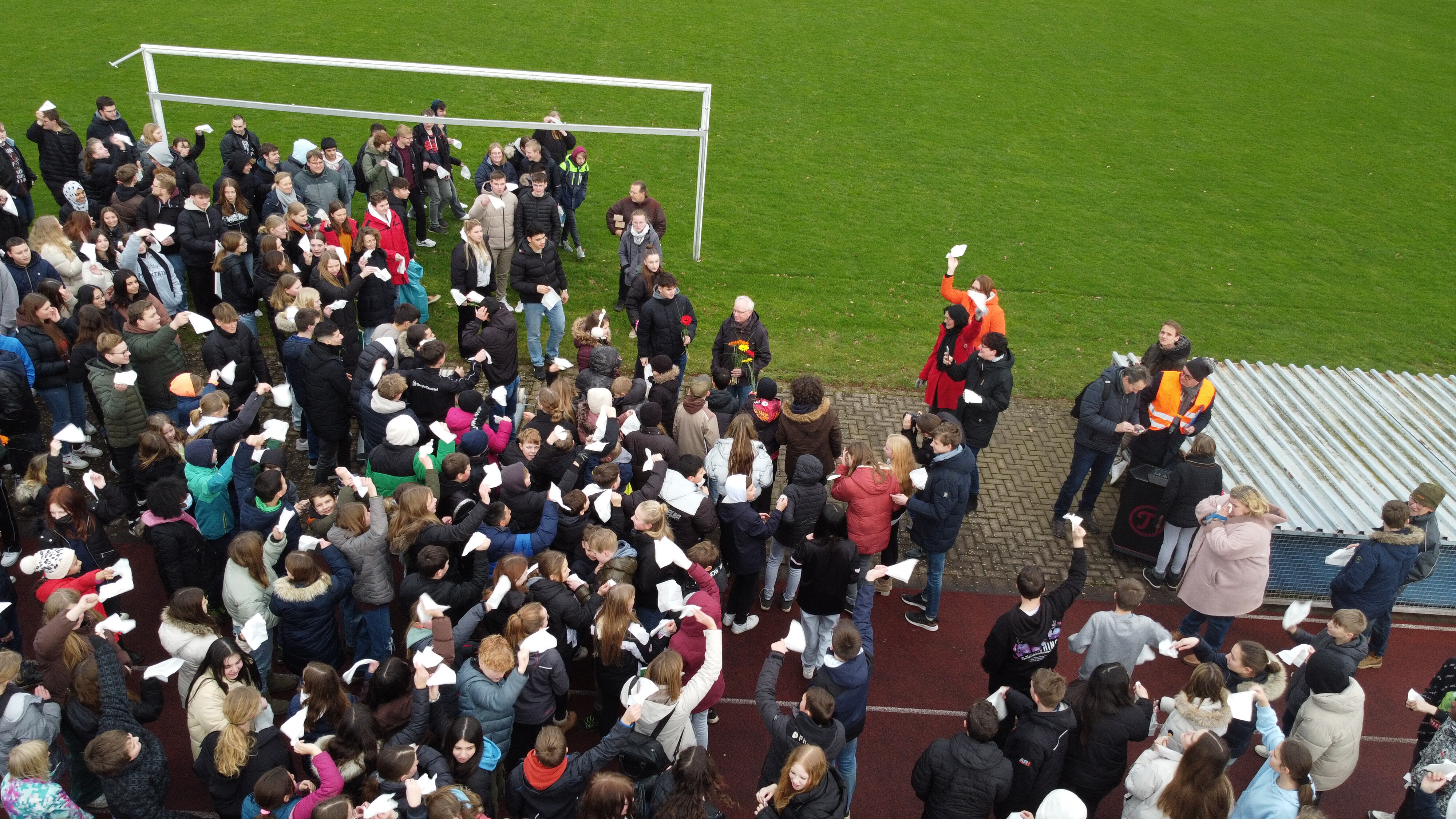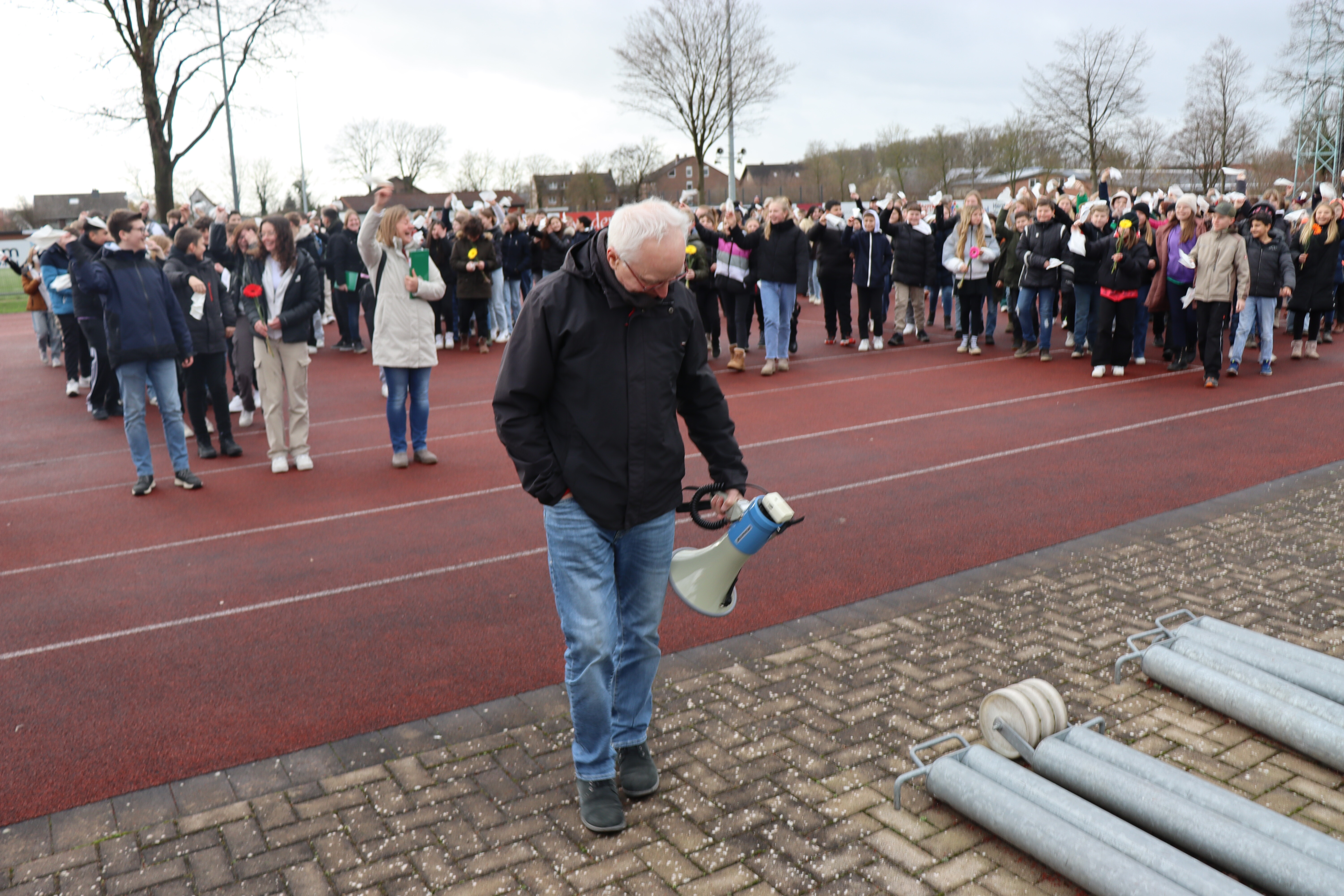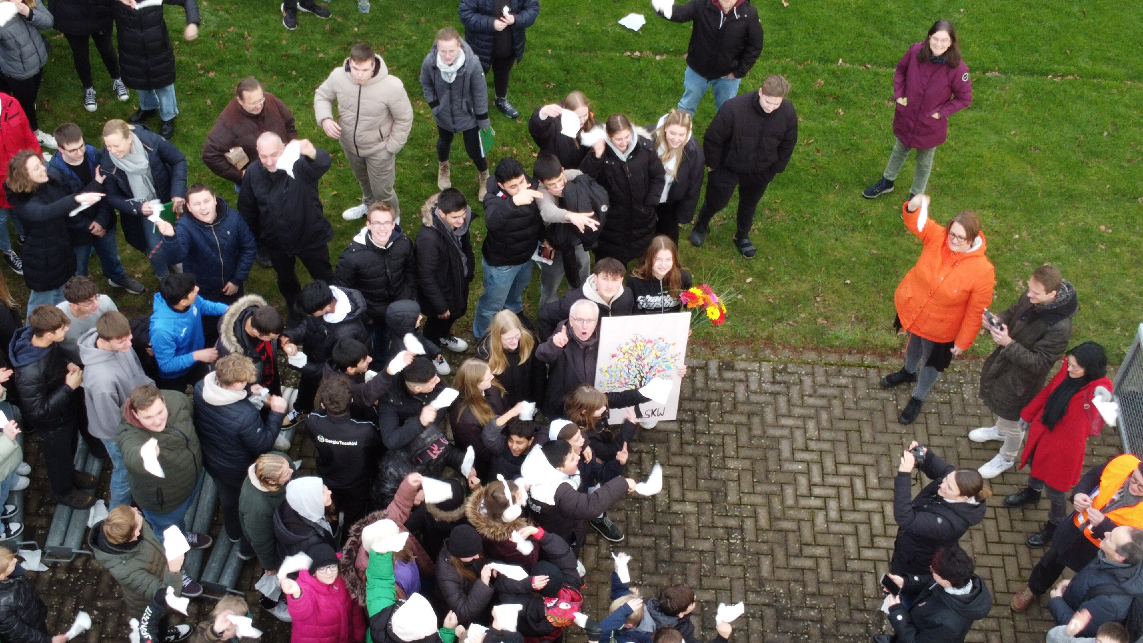 Herr Großbröhmer übernahm ein letztes Mal das Kommando und wollte den Probealarm gerade abmoderieren, als plötzlich alle SchülerInnen der SKW auf ihn zugestürmt kamen, mit weißen Taschentüchern winkten und das Lied "An Tagen wie diesen" von den Toten Hosen aus der Box schallte.