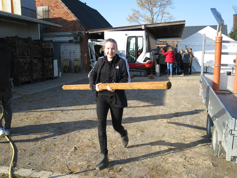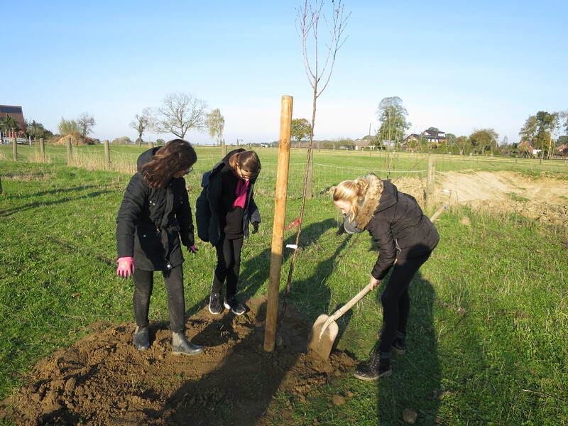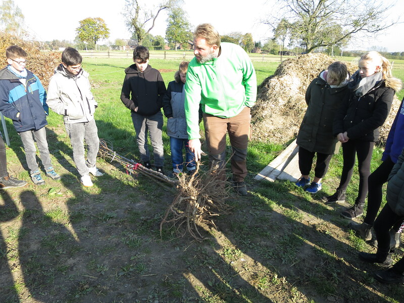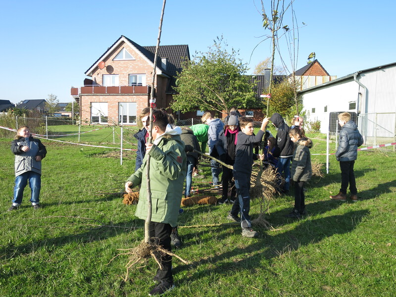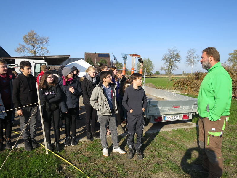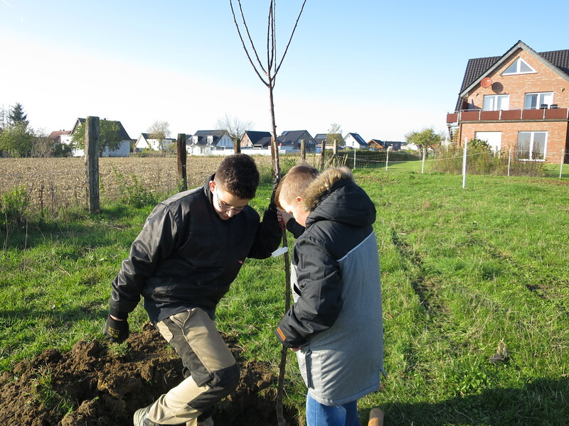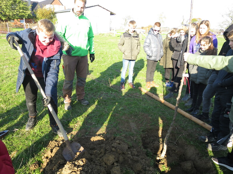 Nach der 6.Stunde am Donnerstag machte die Klasse sich auf den Weg. Frank Eilhard und Jessica Jemella hatten schon einige Vorarbeit geleistet z.B. die Pflanzlöcher mit dem Bagger ausgehoben und die Wurzeln der Bäume beschnitten. Nach einer Begrüßung gabe es eine Einführung durch Herrn Eilhard. Die Schülerinnen und Schüler erfuhren, wie man Wurzeln beschneidet, wie tief der Baum in das Loch eingeplanzt wird, wie und in welche Windrichtung der Holzpfahl zur Befestigung neben den Baum gesetzt werden muss und wie der Baum richtig an den Pfahl angebunden wird. Und dann ging es auch schon los.