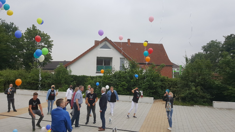 Im Gepäck: Luftballons, Geschenke und eine tolle Erinnerungstafel.