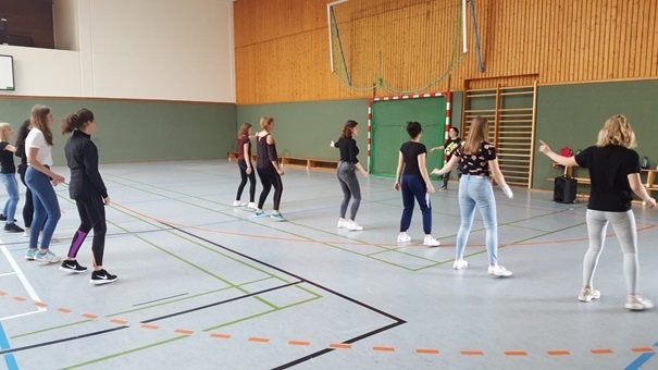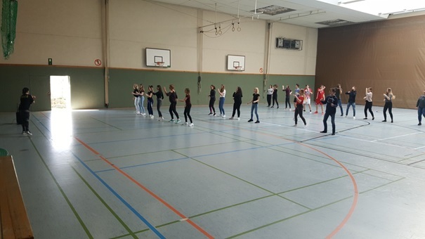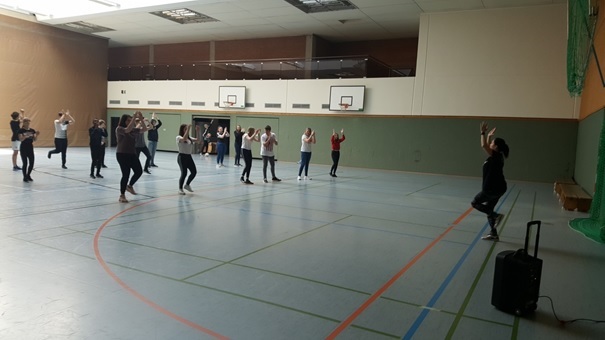 Am heutigen Montag gab es für alle Schülerinnen und Schüler der Spanischkurse aus den Jahrgangsstufen 8 – 10 die Möglichkeit an einem Zumba - und Salsationkurs unter der Leitung der Trainerin Sandra Villa Gonzalez teilzunehmen. Insgesamt 46 Schülerinnen und Schüler lernten, aufgeteilt in zwei Kurse, in 45 Minuten Choreografien zu Liedern wie Despacito von Luis Fonsi oder Taki Taki von DJ Snake (ft. Cardi B, Selena Gomez, Ozuna).