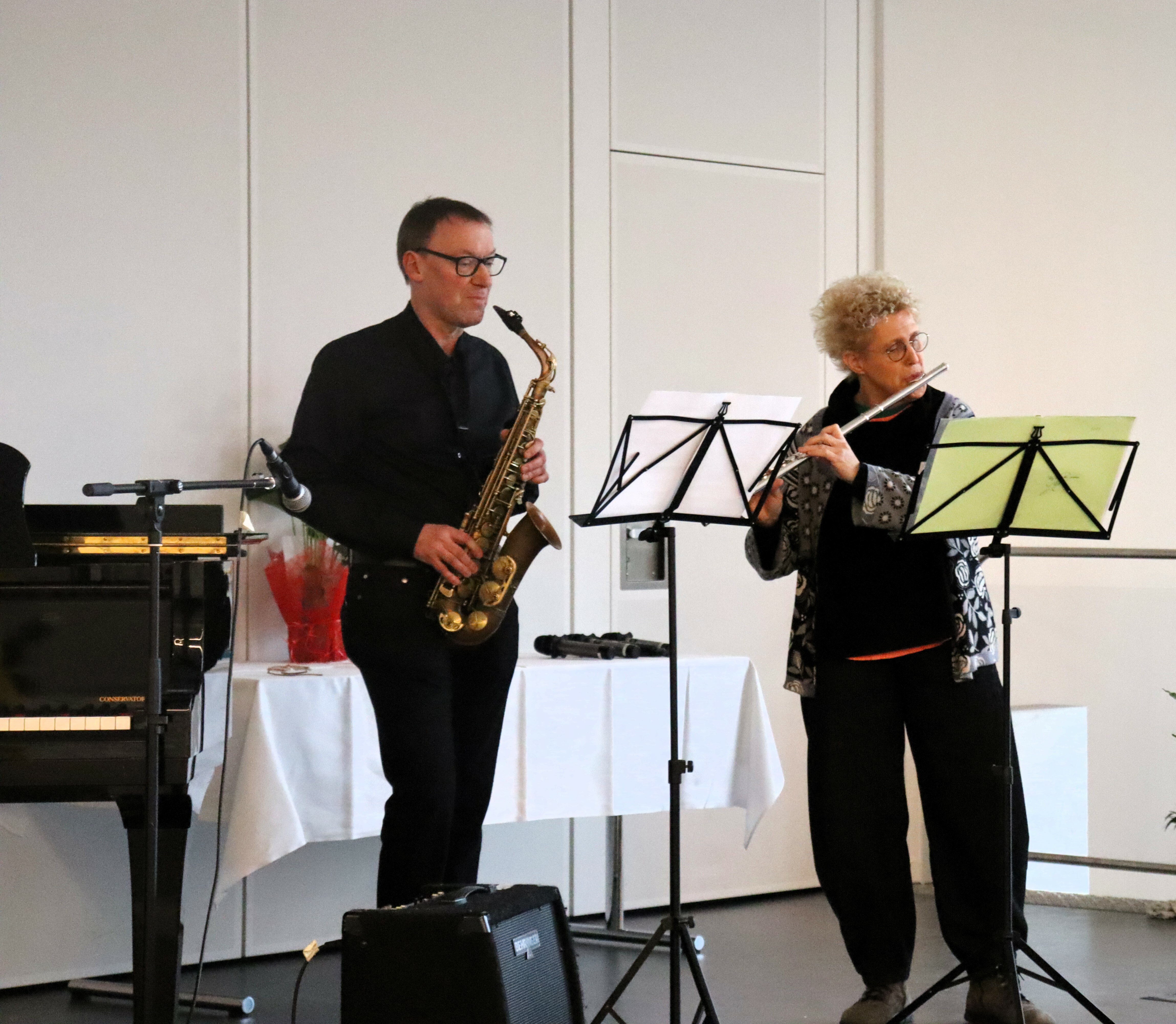 Die Feierlichkeiten starteten mit einem musikalischen Entrée durch den stellvertretenden Schulleiter Dr. Rudolf Bonna am Klavier und die Musiklehrkräfte Ruth Wegener (Querflöte) und Dieter Brokemper (Saxophon).