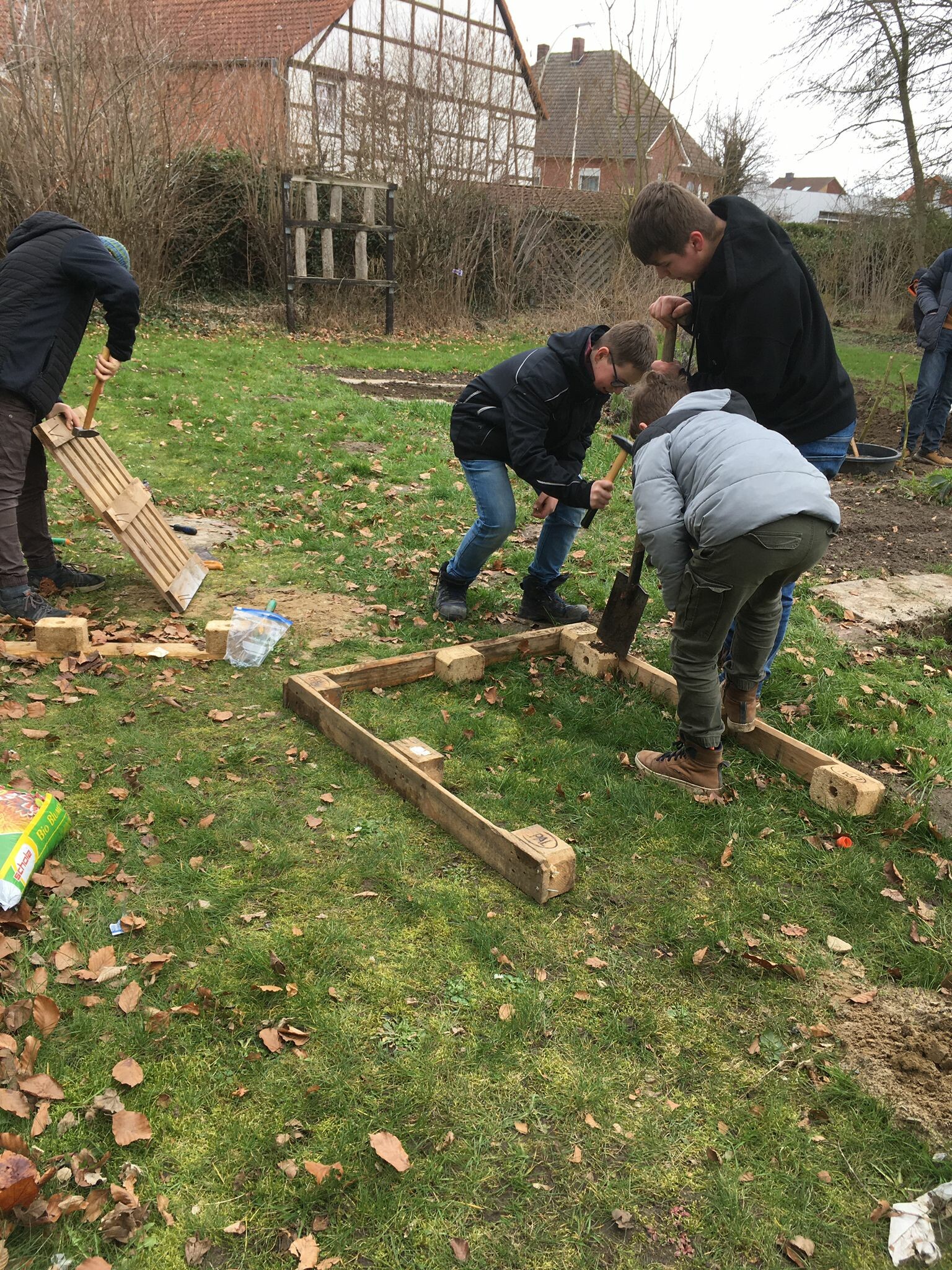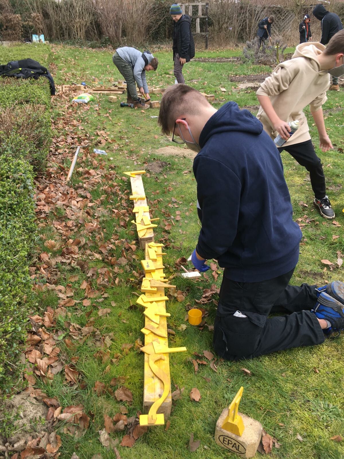 Sie bauen eine Kartoffelpyramide, haben Pflanzschilder für die Beete gebaut und heute lackiert.