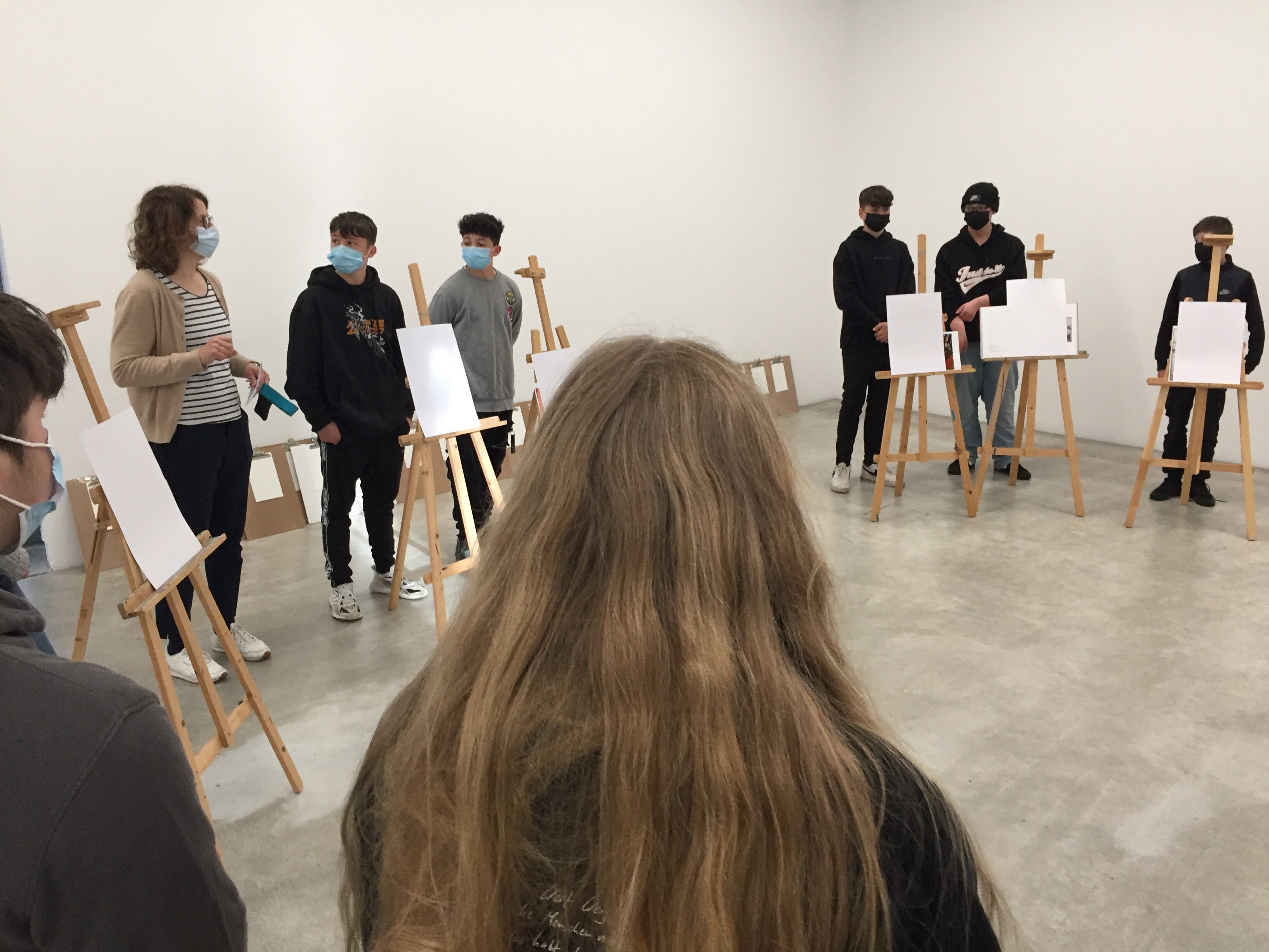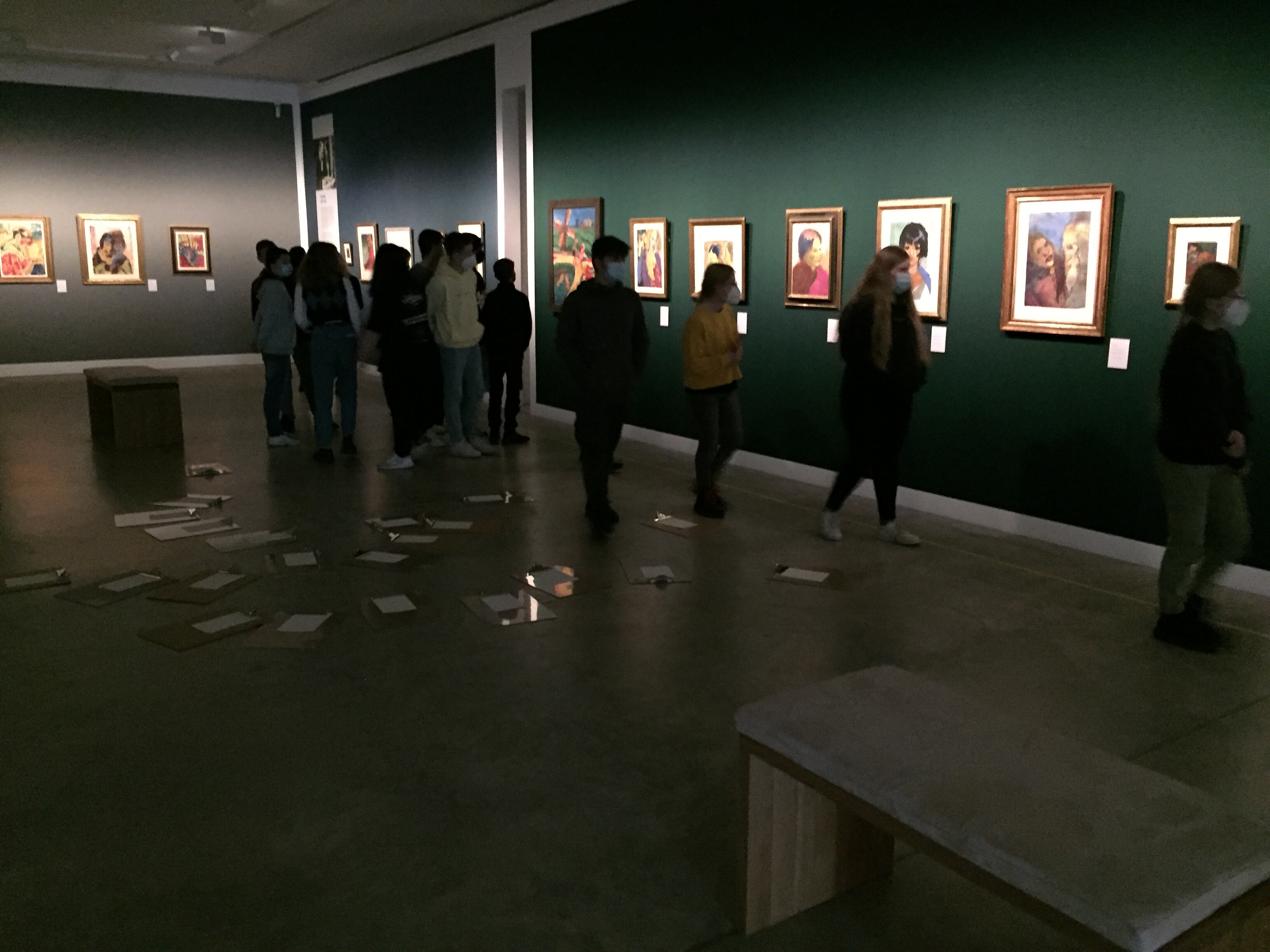 Derweil diese trocknen mussten, besuchte die Klasse nun die Ausstellung. Welche Gefühle wollten die Künstlergruppe ausdrücken und warum benutzten sie so merkwürdige Perspektiven? Diesen Fragen gingen die Schülerinnen und Schüler mit Hilfe von Gefühlskarten und ihrem Handy auf die Spur. Abschließend skizzierte die Gruppe ihr ausgewähltes Lieblingsbild, welches sie im Atelier farblich bearbeiten durften.