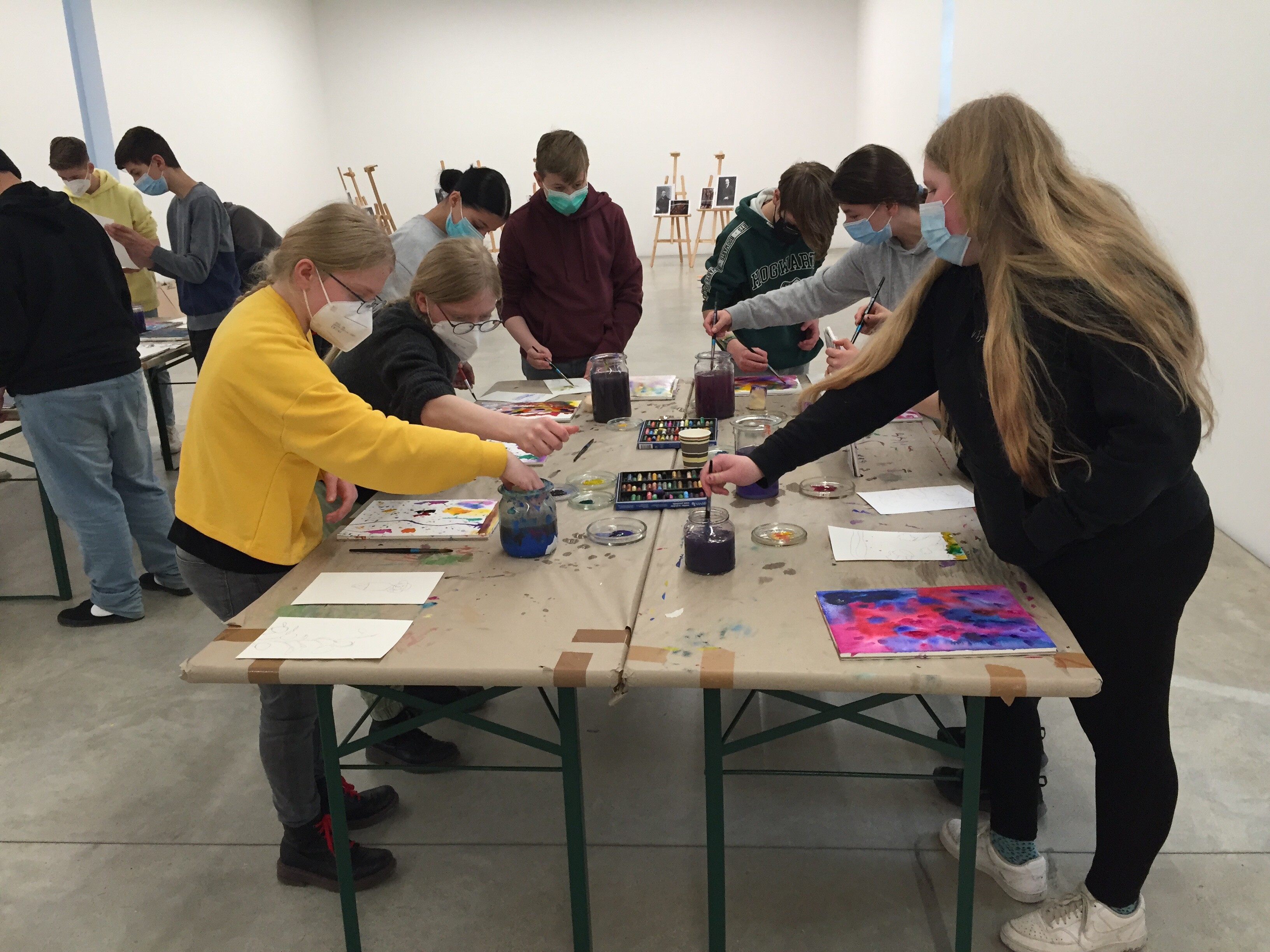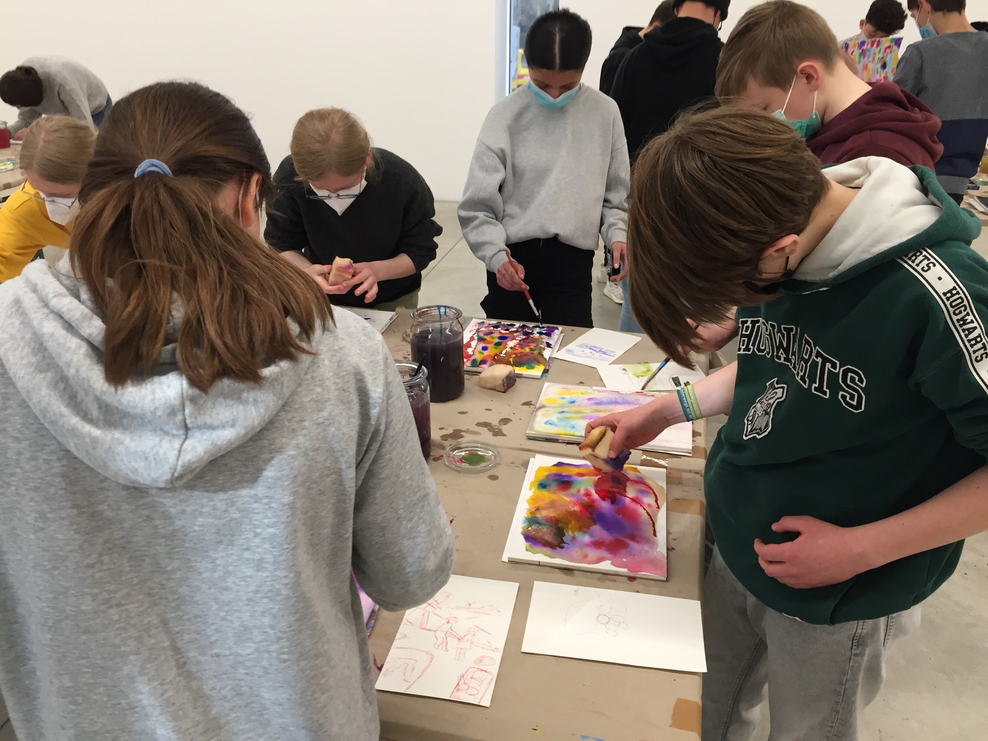 Die Neugierde war geweckt, sobald die Klasse das Atelier betrat und erste Erfahrungen mit der Aquarelltechnik machte, in die sie von der Workshopleiterin Frau Mengelkamp eingeführt wurden.