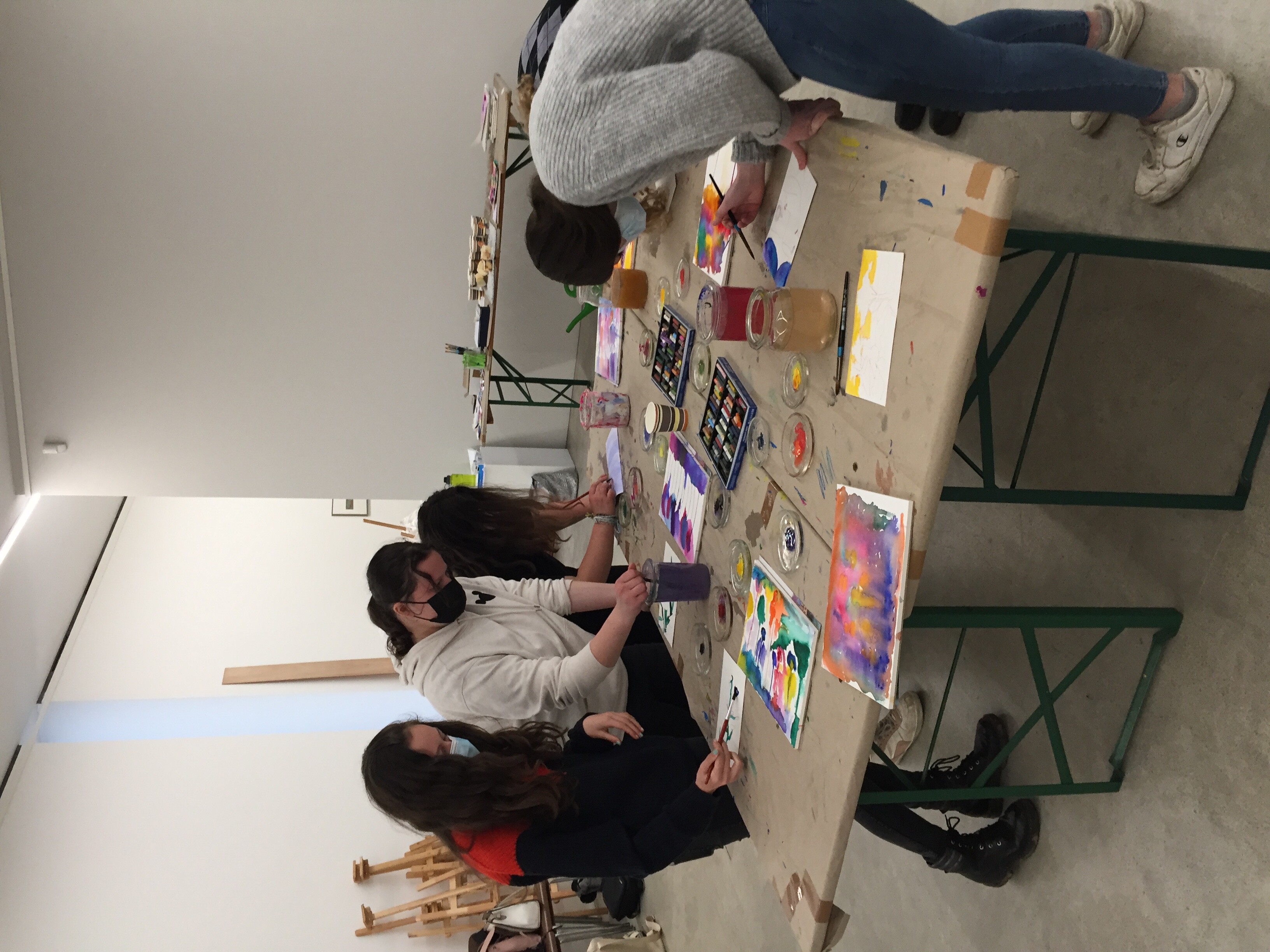 Anschließend ging es wieder ans praktische Arbeiten und die Klasse durfte ihr vorbereitetes Aquarellpapier bemalen. Durch das Experimentieren mit den Farben entstanden sehr unterschiedliche und farbintensive Bilder.