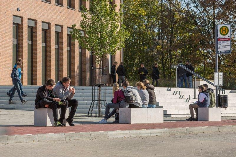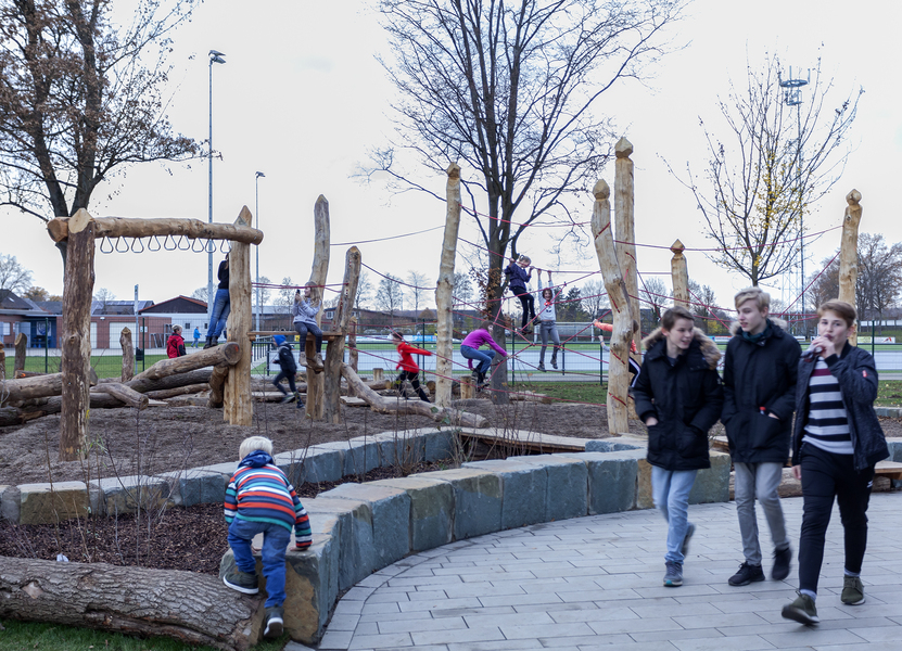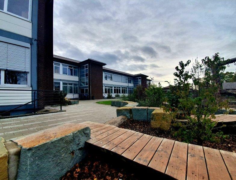 Der Schulhof für die Klassen 5-7 wurde mit Schülern und der Idenwerkstatt Lebens(t)Raum gemeinsam geplant und im September 2018 durch die Mithilfe vieler Eltern, Schüler und Lehrer gebaut. Die 8.-10. Klassen haben einen eigenen Bereich, der weitläufig und offen wie ein Campus angelegt ist. Auch hier gibt es selbstgebaute Bänke und Hängematten, die während der Projektwoche im November 2018 von den Schülern gebaut wurden.