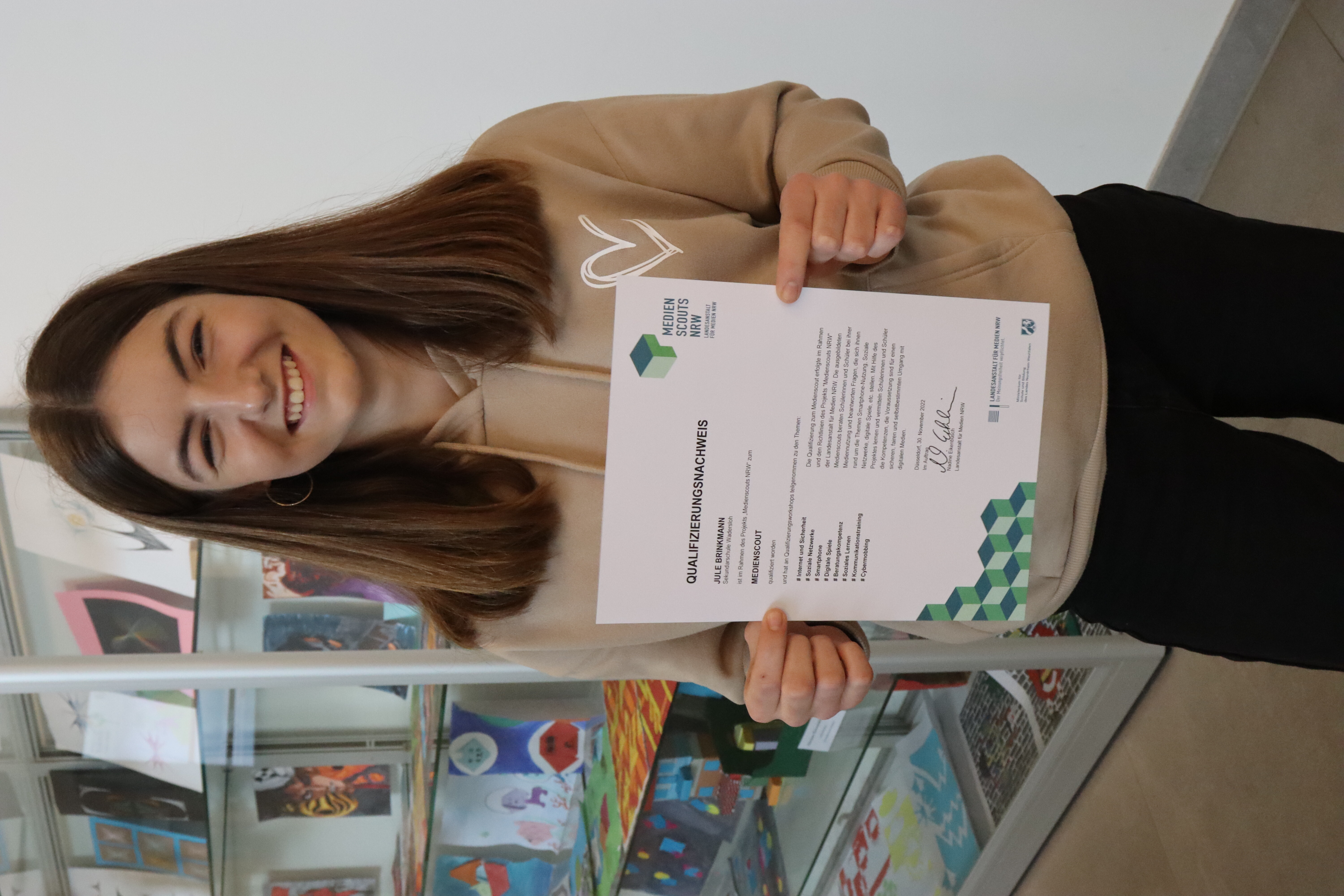 Die Qualifizierung zum Medienscout erfolgte im Rahmen und den Richtlinien des Projekts „Medienscouts NRW“ der Landesanstalt für Medien NRW. Die ausgebildeten Medienscouts beraten Schülerinnen und Schüler bei ihrer Mediennutzung und beantworten Fragen, die sich ihnen rund um die Themen Smartphone-Nutzung, Soziale Netzwerke, digitale Spiele, etc. stellen. Mit Hilfe des Projektes lernen und vermitteln Schülerinnen und Schüler die Kompetenzen, die Voraussetzung sind für einen sicheren, fairen und selbstbestimmten Umgang mit digitalen Medien.