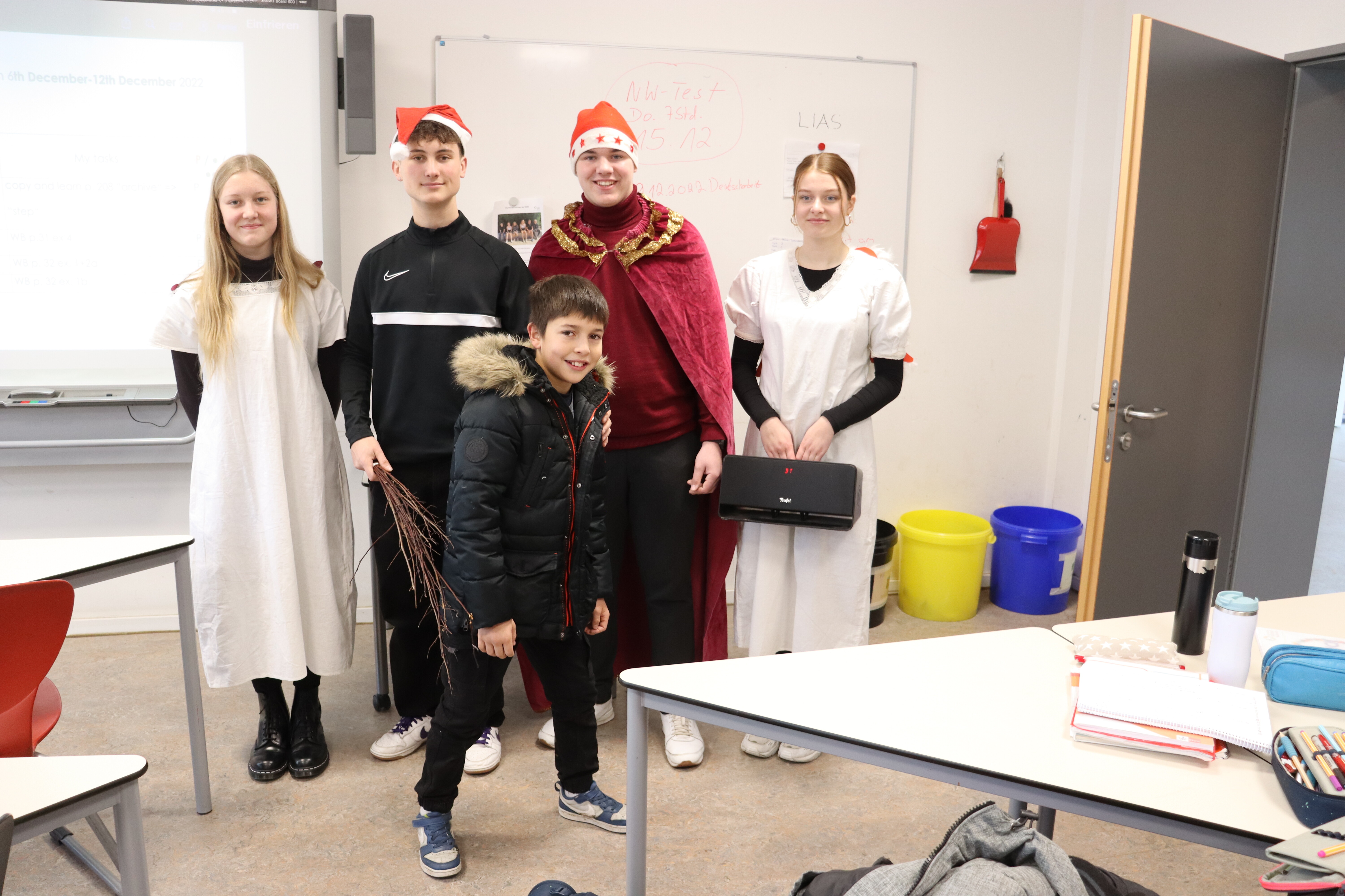 Plötzlich klopfte es am Klassenraum der Klasse 6b und der Nikolaus stand im Raum. Dabei hatte er seinen Gehilfen Knecht Ruprecht, 2 Engel, 2 Weihnachtselfen, eine Musikbox, Liedertexte und natürlich viel Schokolade.