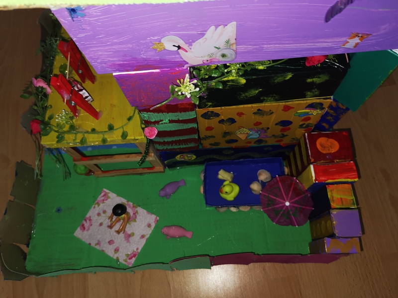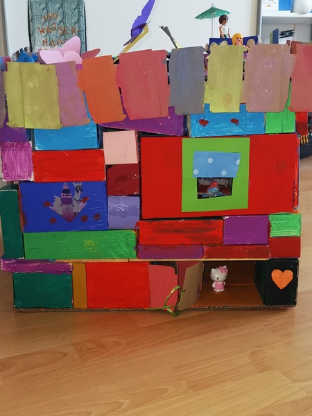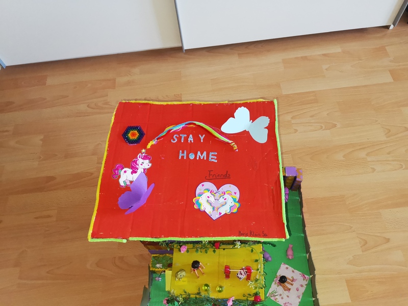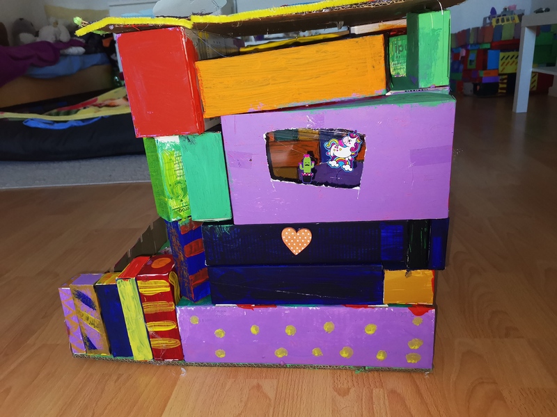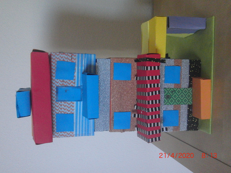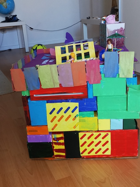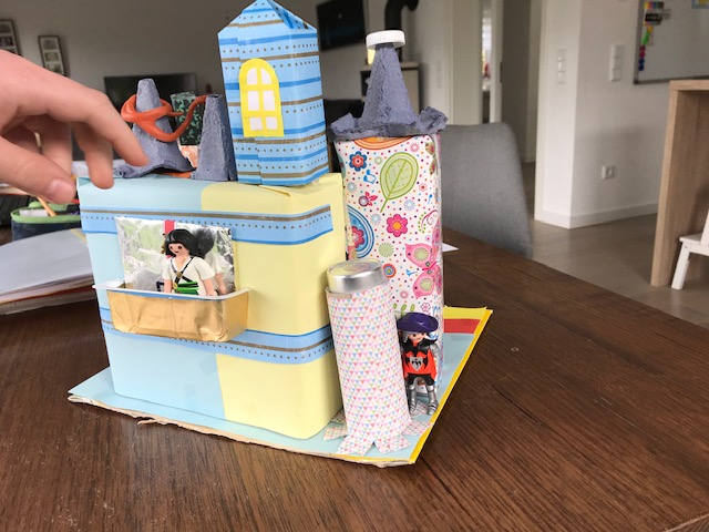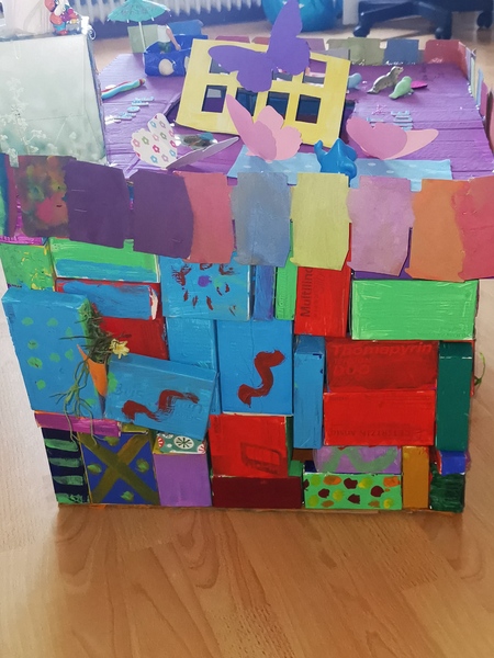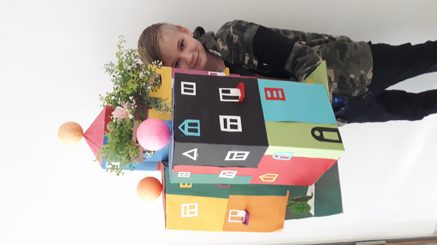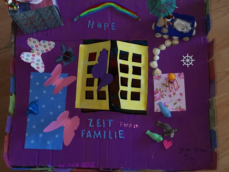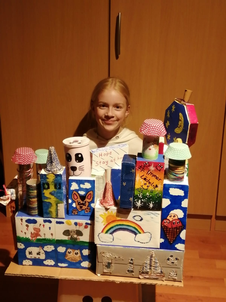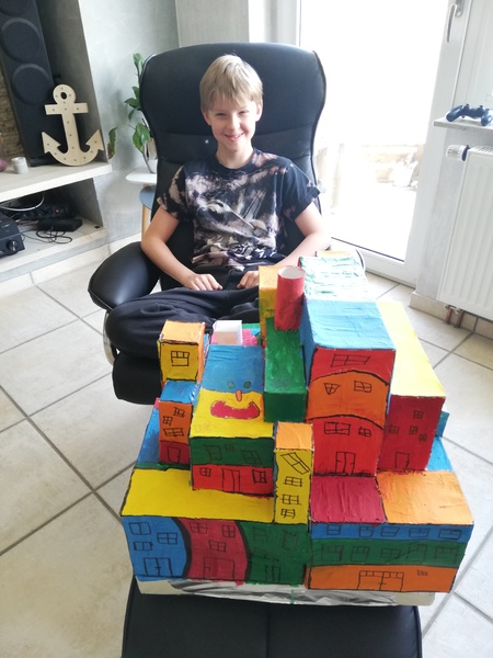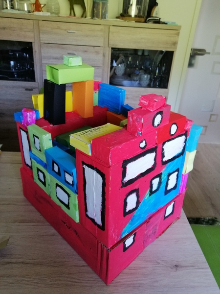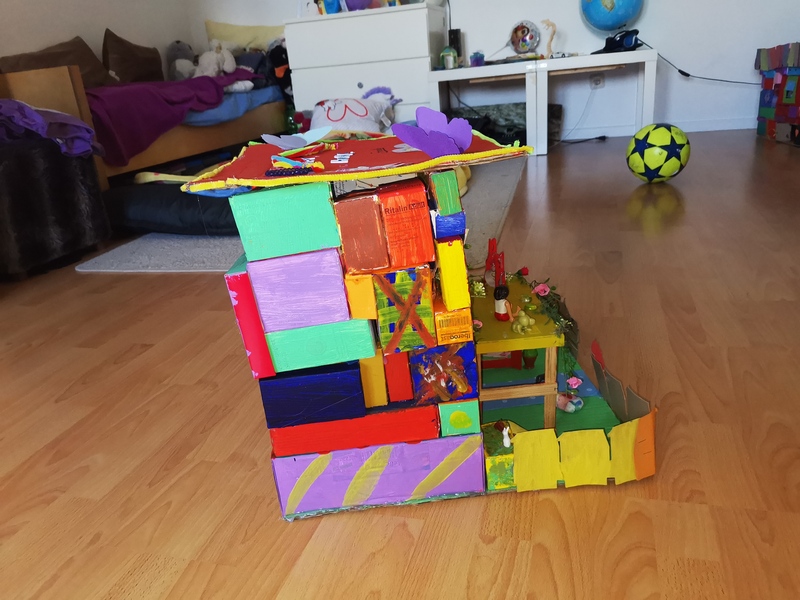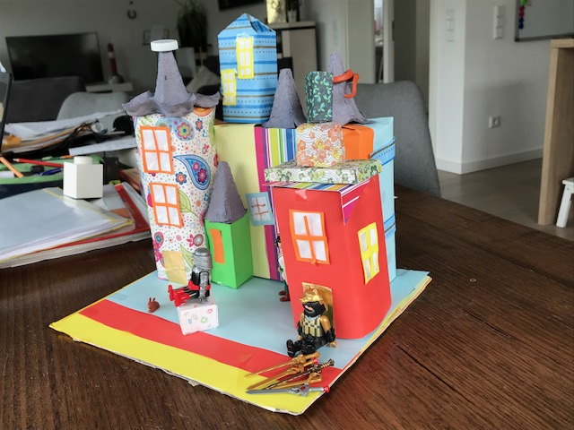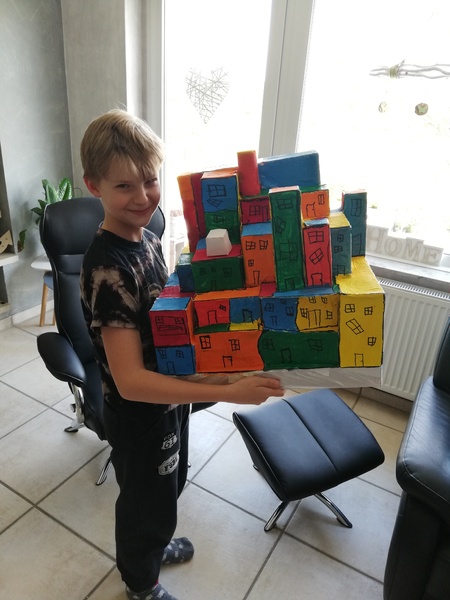 In der fünften Klasse steht in Mathe Geometrielehre auf dem Programm. Im Homeschooling, um die Kinder zu motivieren Würfel und Quader zu basteln, hat sich Frau Wüstneck, die in der 5 a sowohl Mathe als auch Kunst unterrichtet, ein internes Wettbewerb ausgedacht. Die Kinder der Klasse 5a sollen ein Haus nach dem Vorbild von einem Wiener Künstler Friedenreich Hundertwasser bauen.