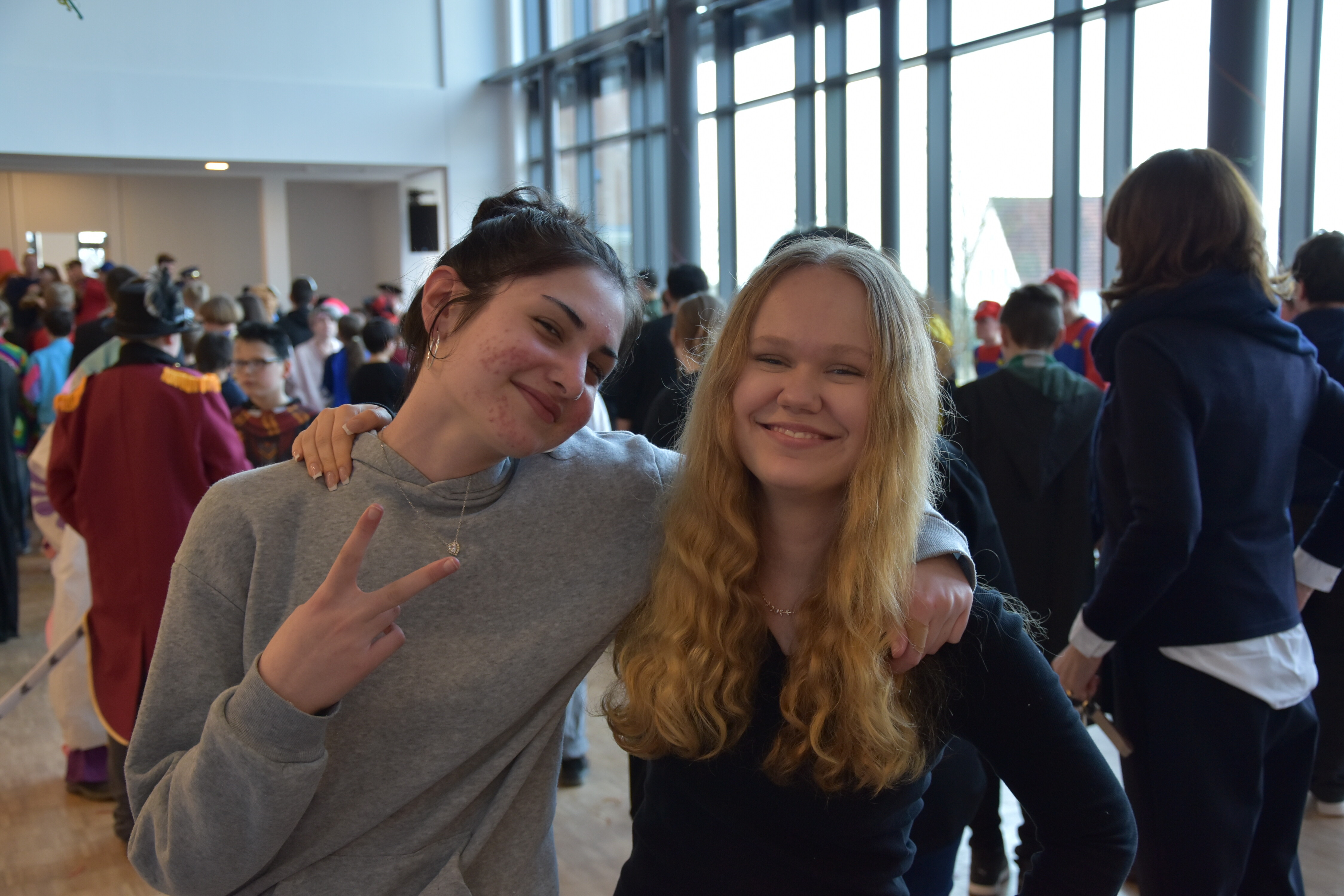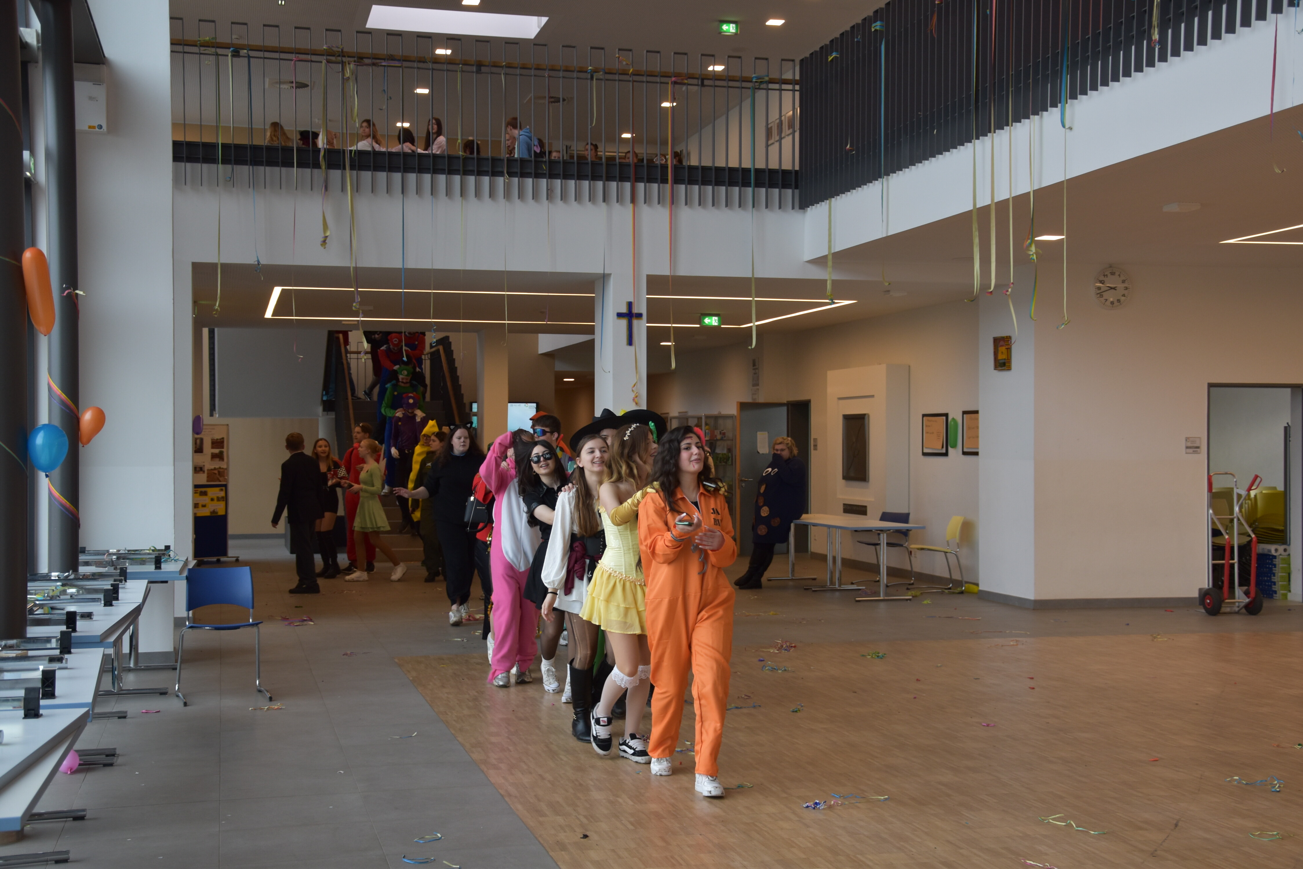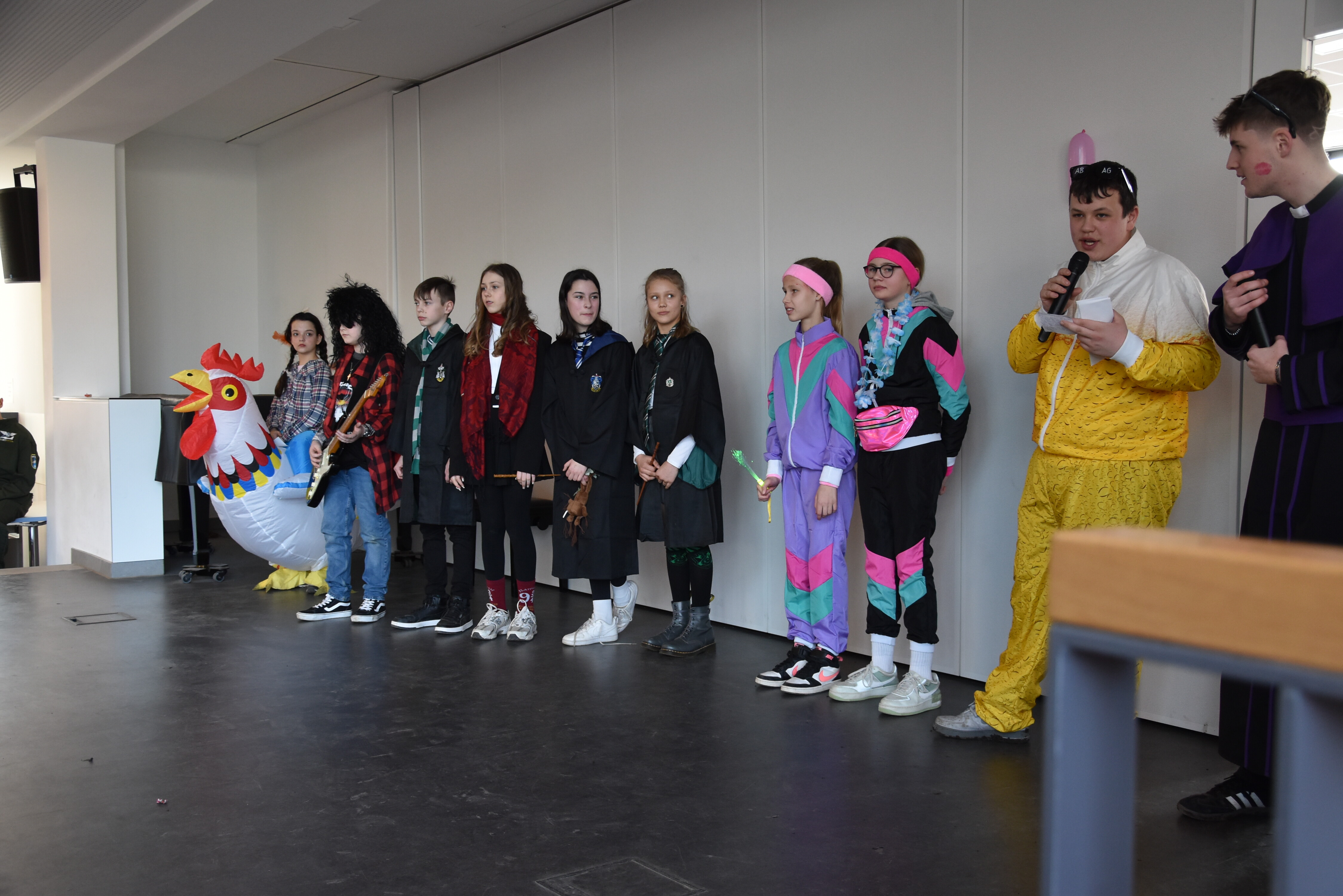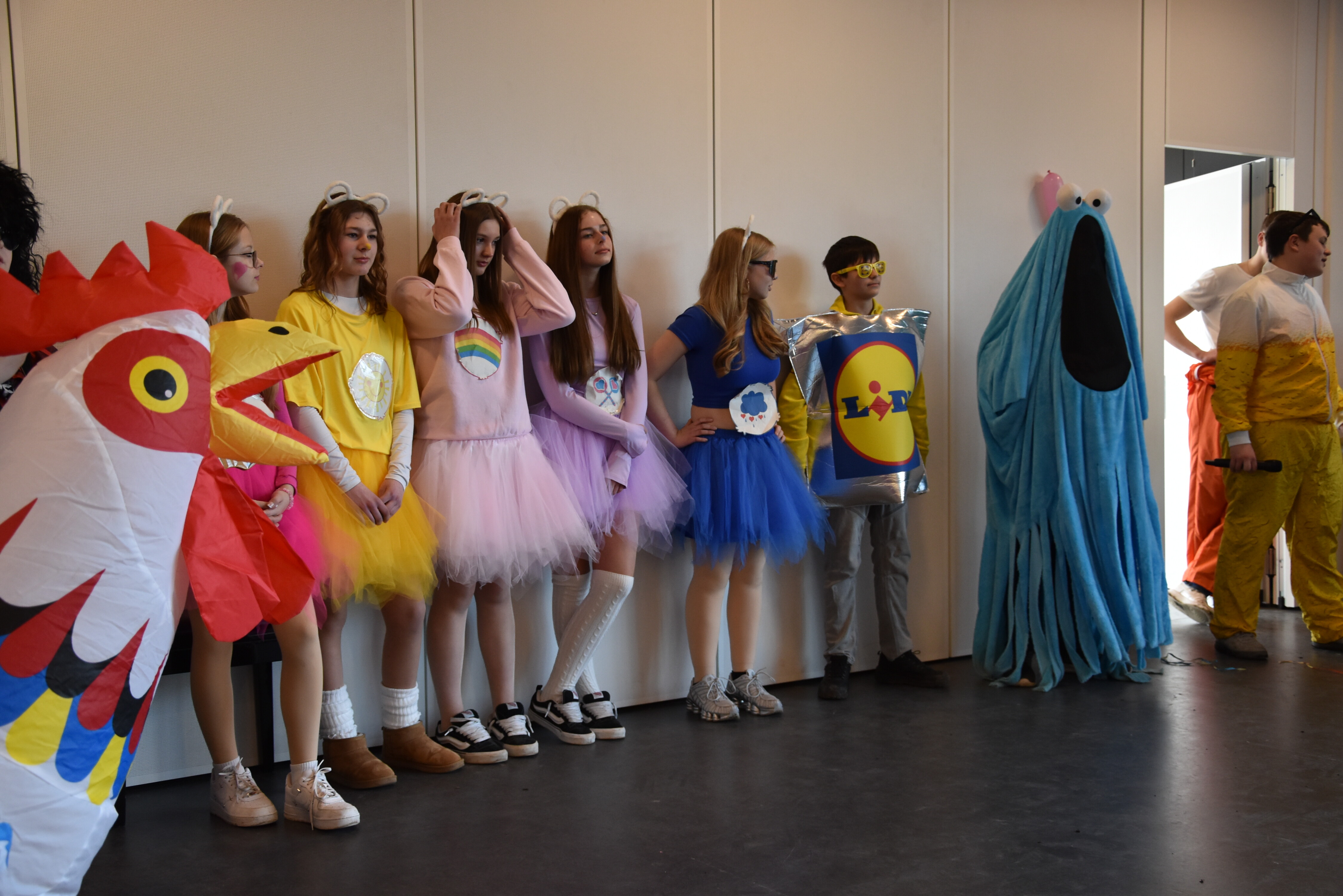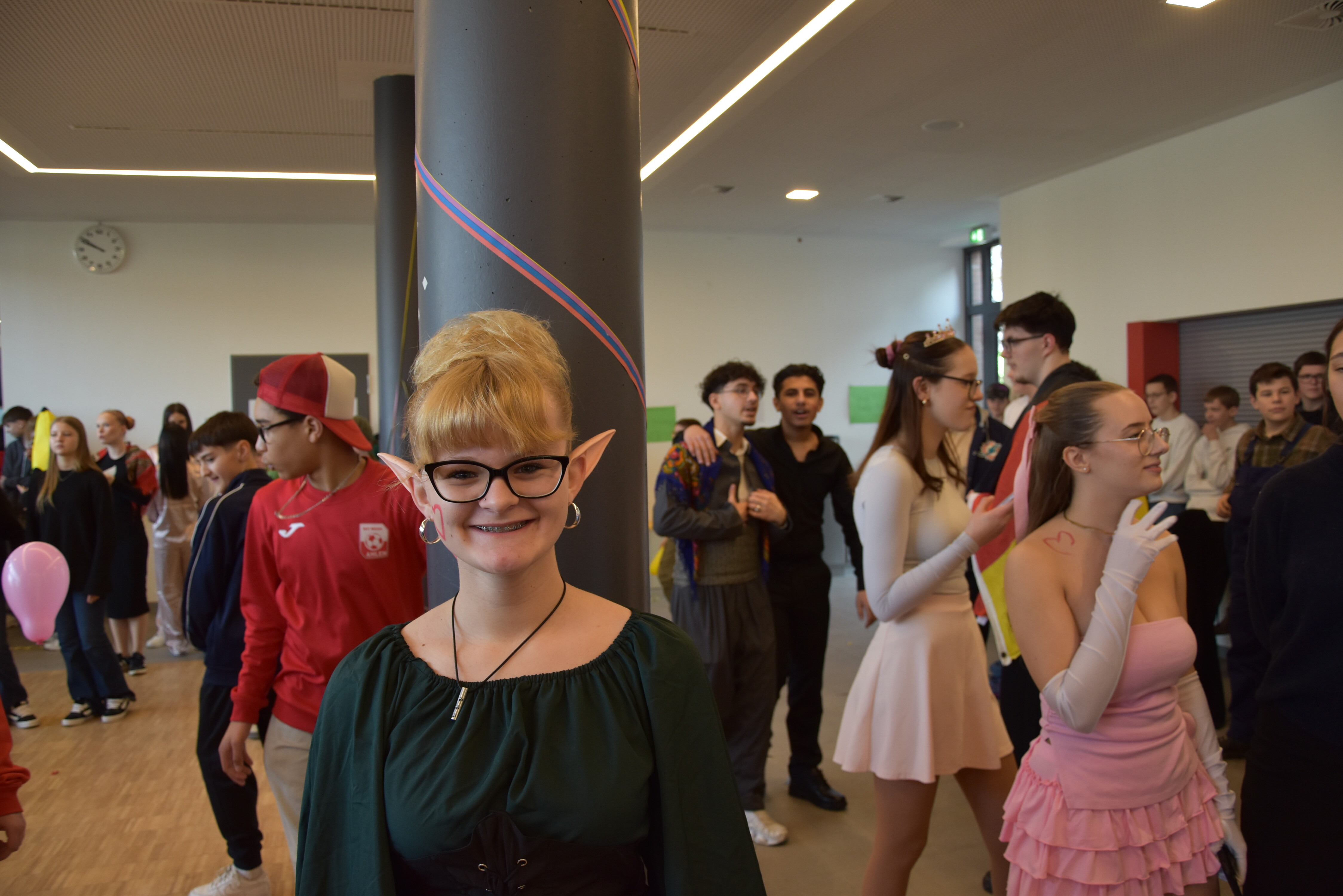 An unserer Schule gibt es so einige Traditionen, eine davon ist, dass man an Weiberfastnacht kräftig Karneval feiert. Jedes Jahr planen die 10. Klassen einen bunten Vormittag für alle Schüler und Schülerinnen mit Musik, Kostüm-Wettbewerb und allem, was man braucht, um in Karnevalsstimmung zu kommen. Auch dieses Jahr füllte sich die Mensa mit allerlei bunt verkleideten Kindern und Jugendlichen, die das Angebot der 10. Klassen gern und lautstark annahmen. Angefangen wurde der Schultag mit der Prämierung des besten Klassenkostüms. Nach der ersten Pause wurden die Schüler und Schülerinnen dann in einer nicht enden wollenden Polonaise in die Mensa geleitet, wo die Party mit Kostümprämierung und allerlei Unterhaltung dann bis zur zweiten Pause fortgesetzt wurde.