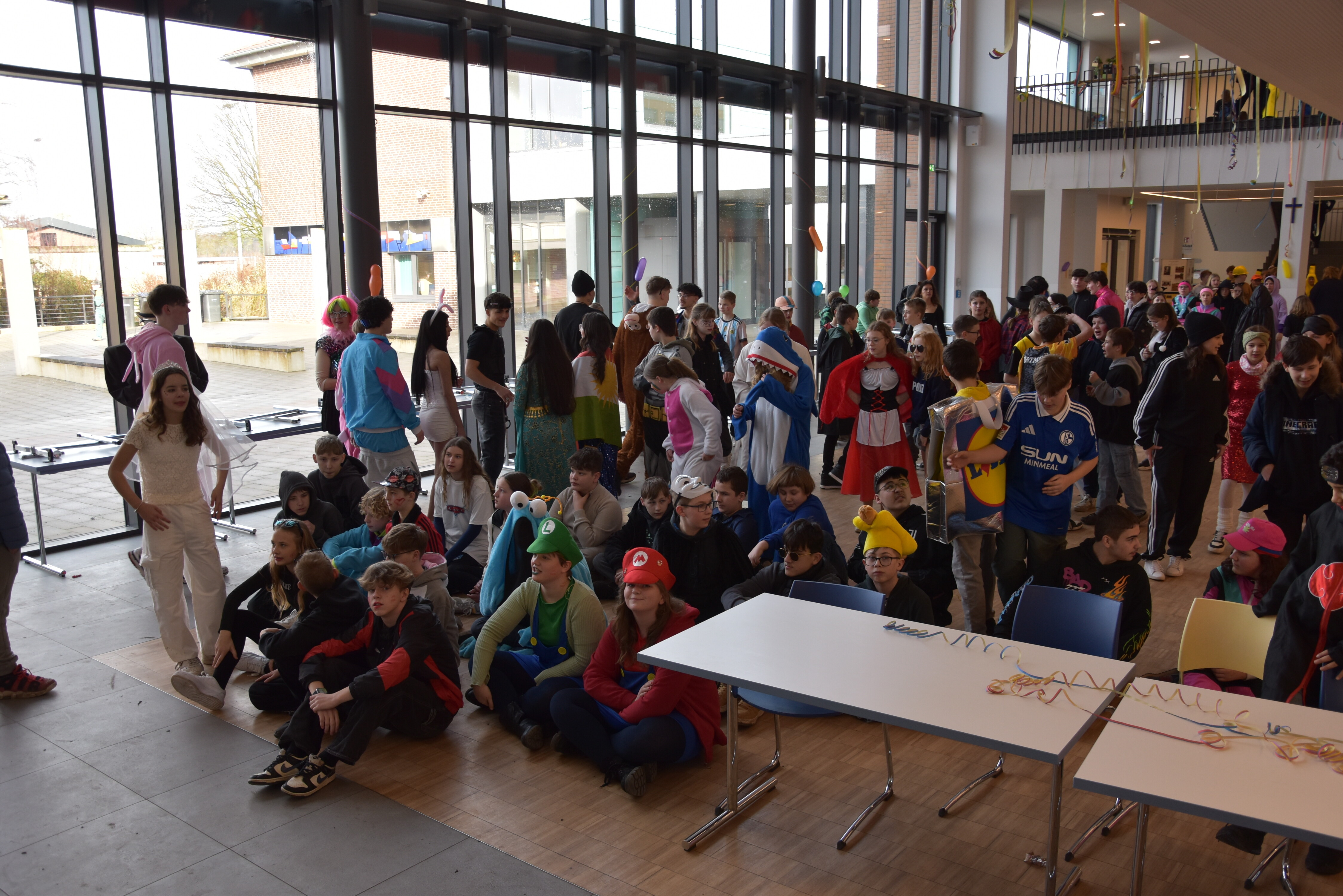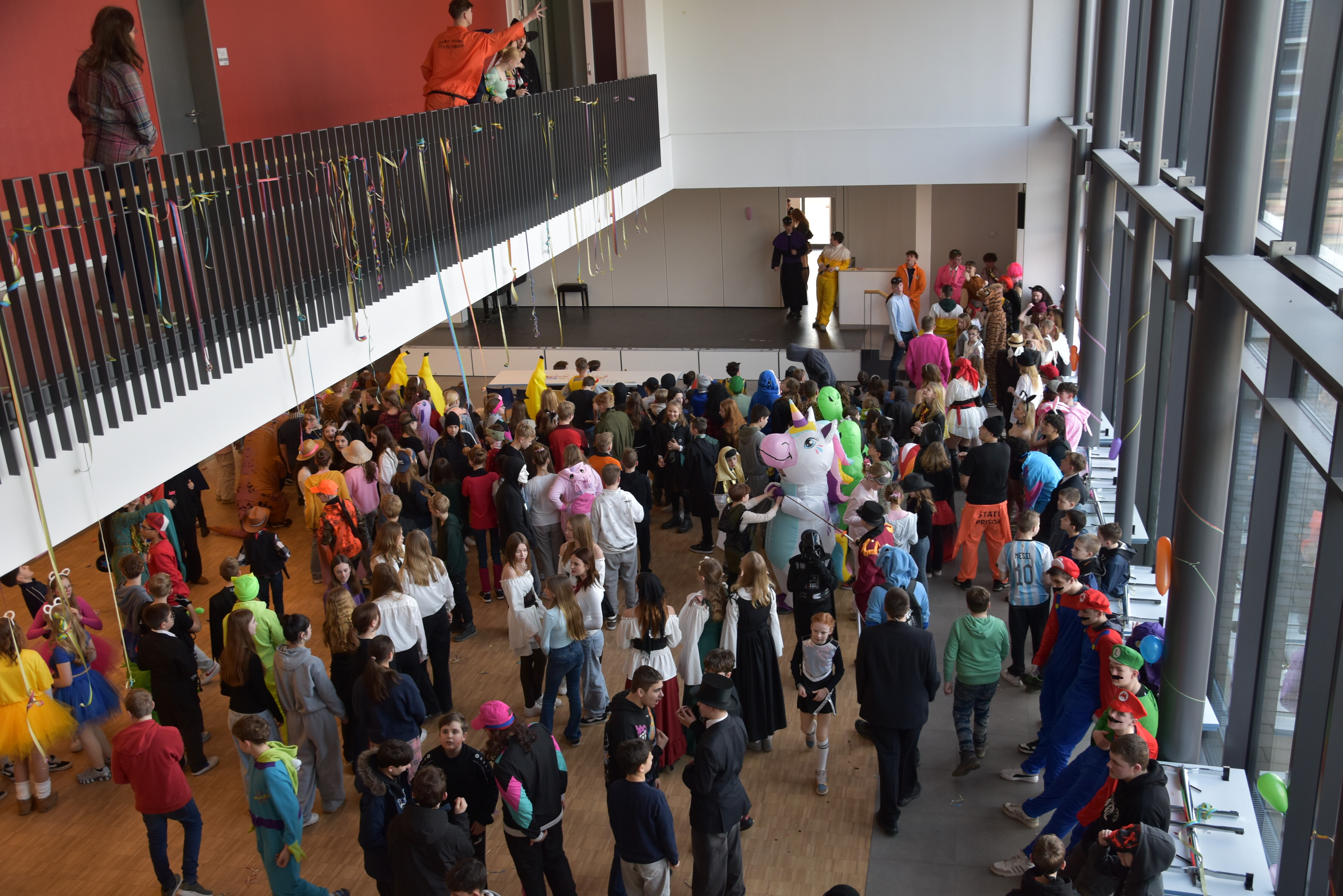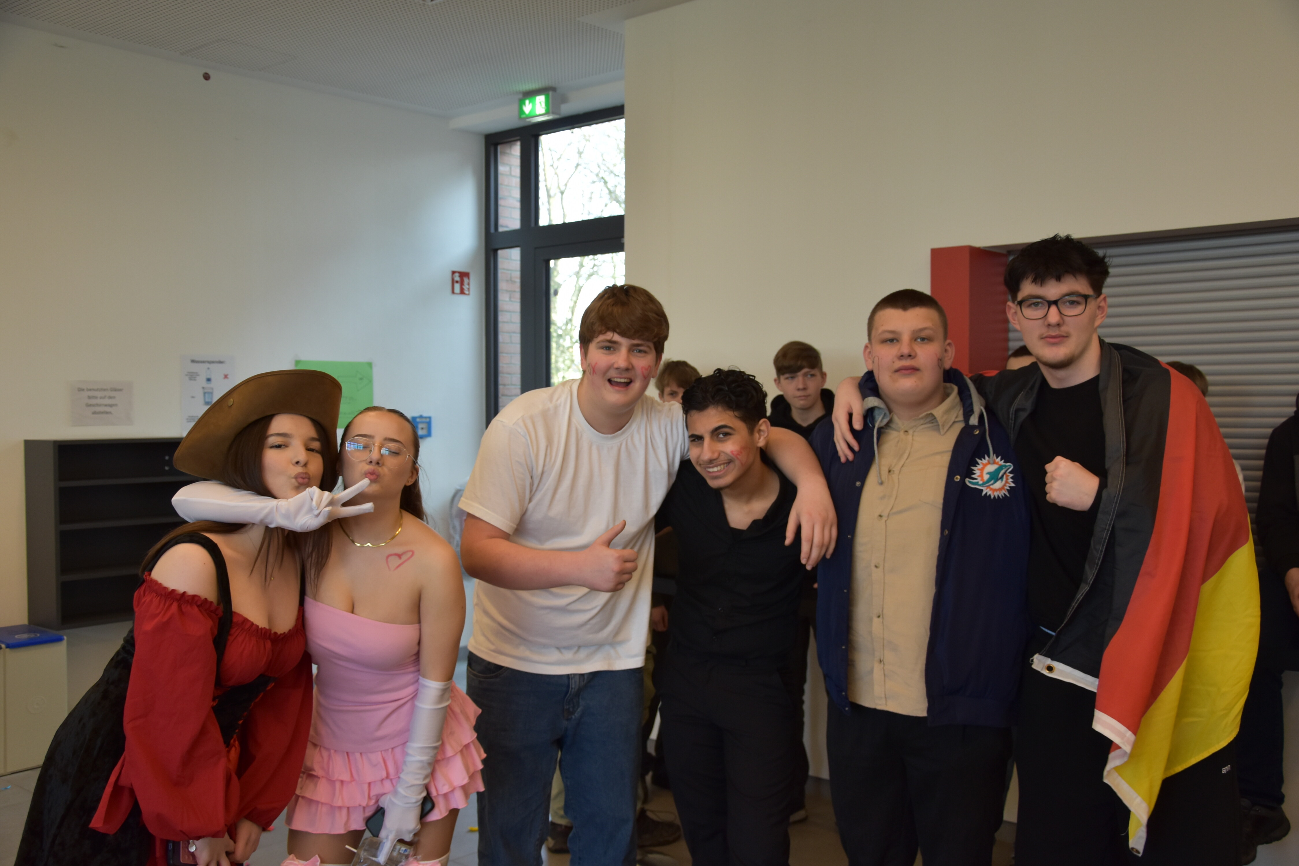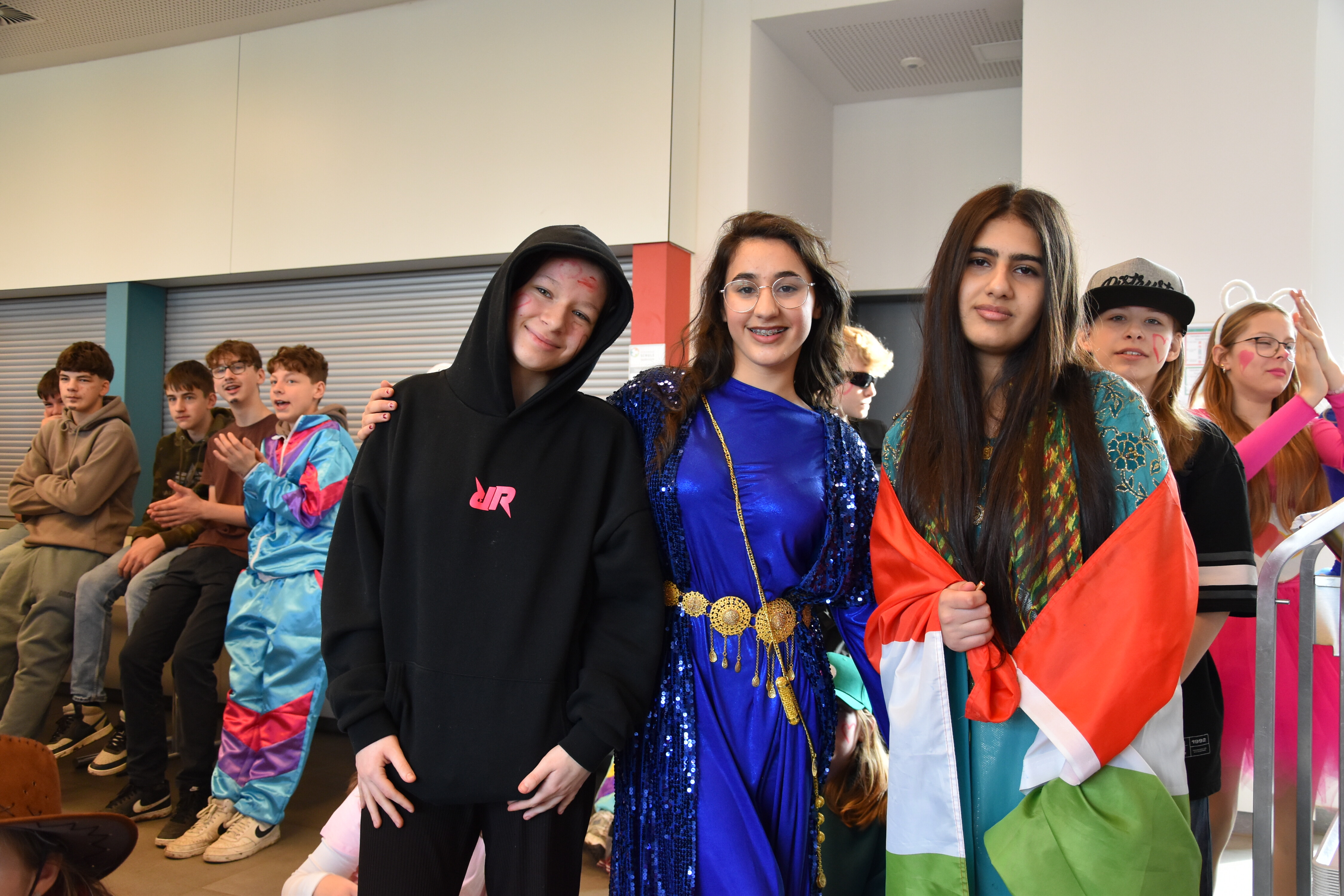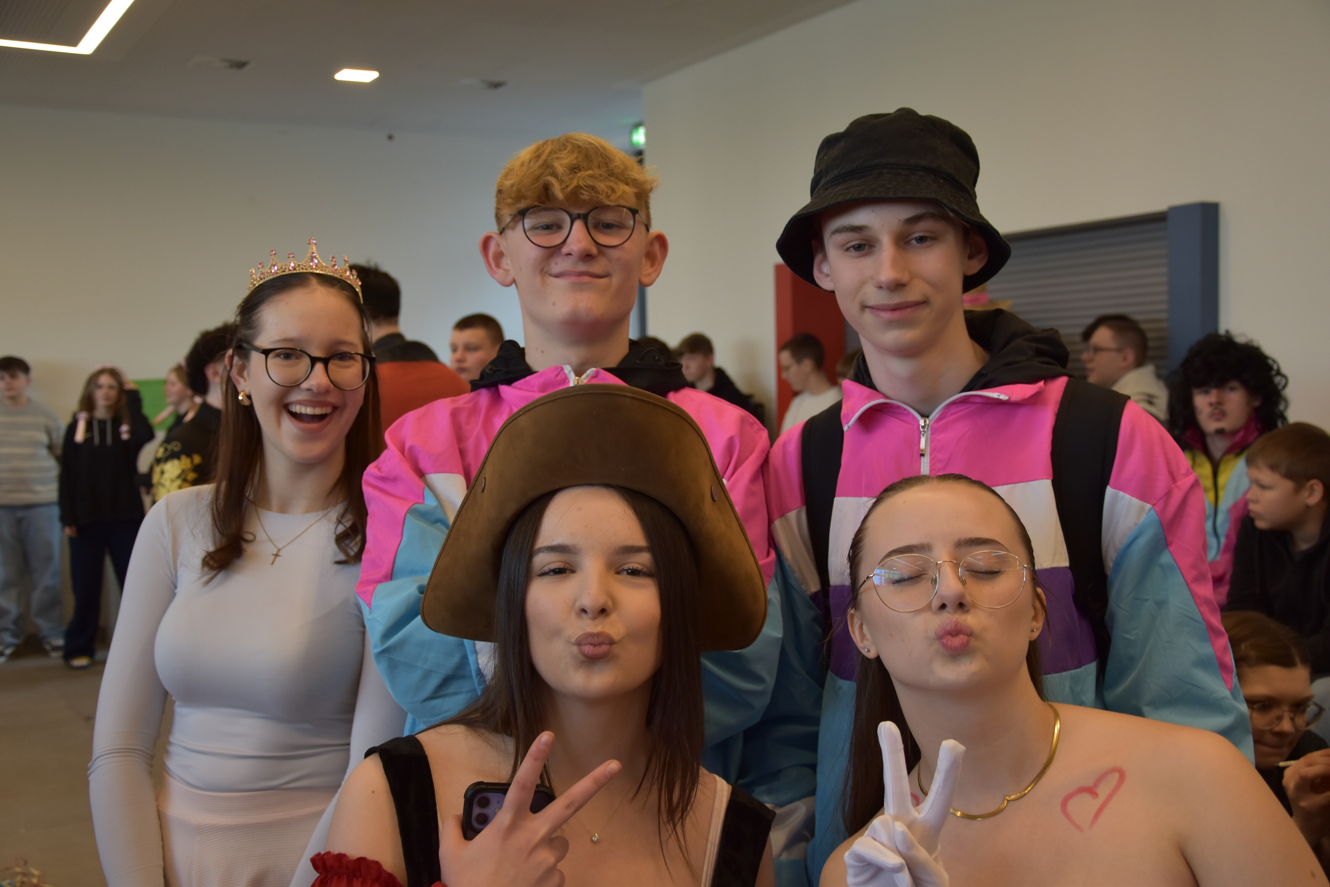 An unserer Schule gibt es so einige Traditionen, eine davon ist, dass man an Weiberfastnacht kräftig Karneval feiert. Jedes Jahr planen die 10. Klassen einen bunten Vormittag für alle Schüler und Schülerinnen mit Musik, Kostüm-Wettbewerb und allem, was man braucht, um in Karnevalsstimmung zu kommen. Auch dieses Jahr füllte sich die Mensa mit allerlei bunt verkleideten Kindern und Jugendlichen, die das Angebot der 10. Klassen gern und lautstark annahmen. Angefangen wurde der Schultag mit der Prämierung des besten Klassenkostüms. Nach der ersten Pause wurden die Schüler und Schülerinnen dann in einer nicht enden wollenden Polonaise in die Mensa geleitet, wo die Party mit Kostümprämierung und allerlei Unterhaltung dann bis zur zweiten Pause fortgesetzt wurde.