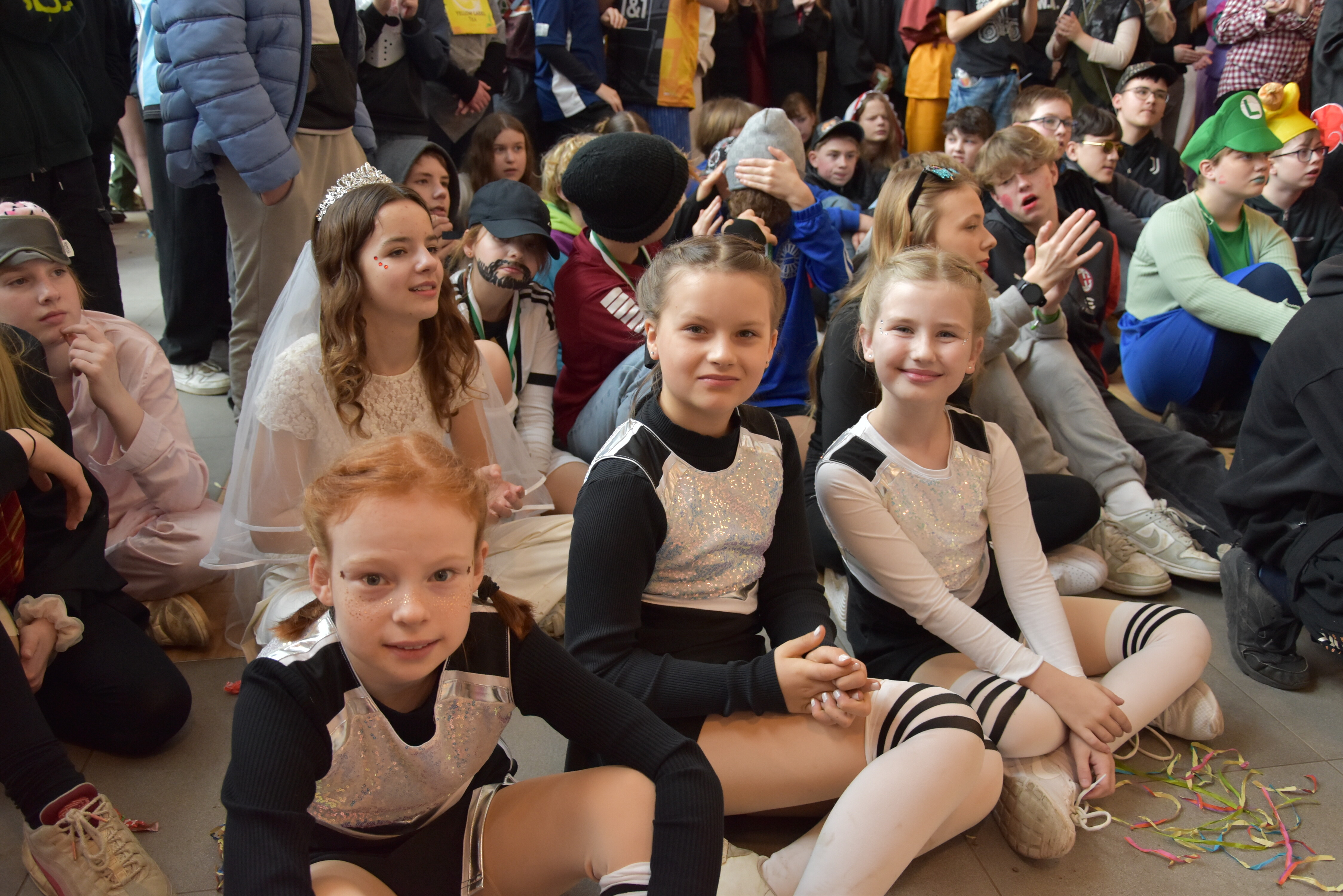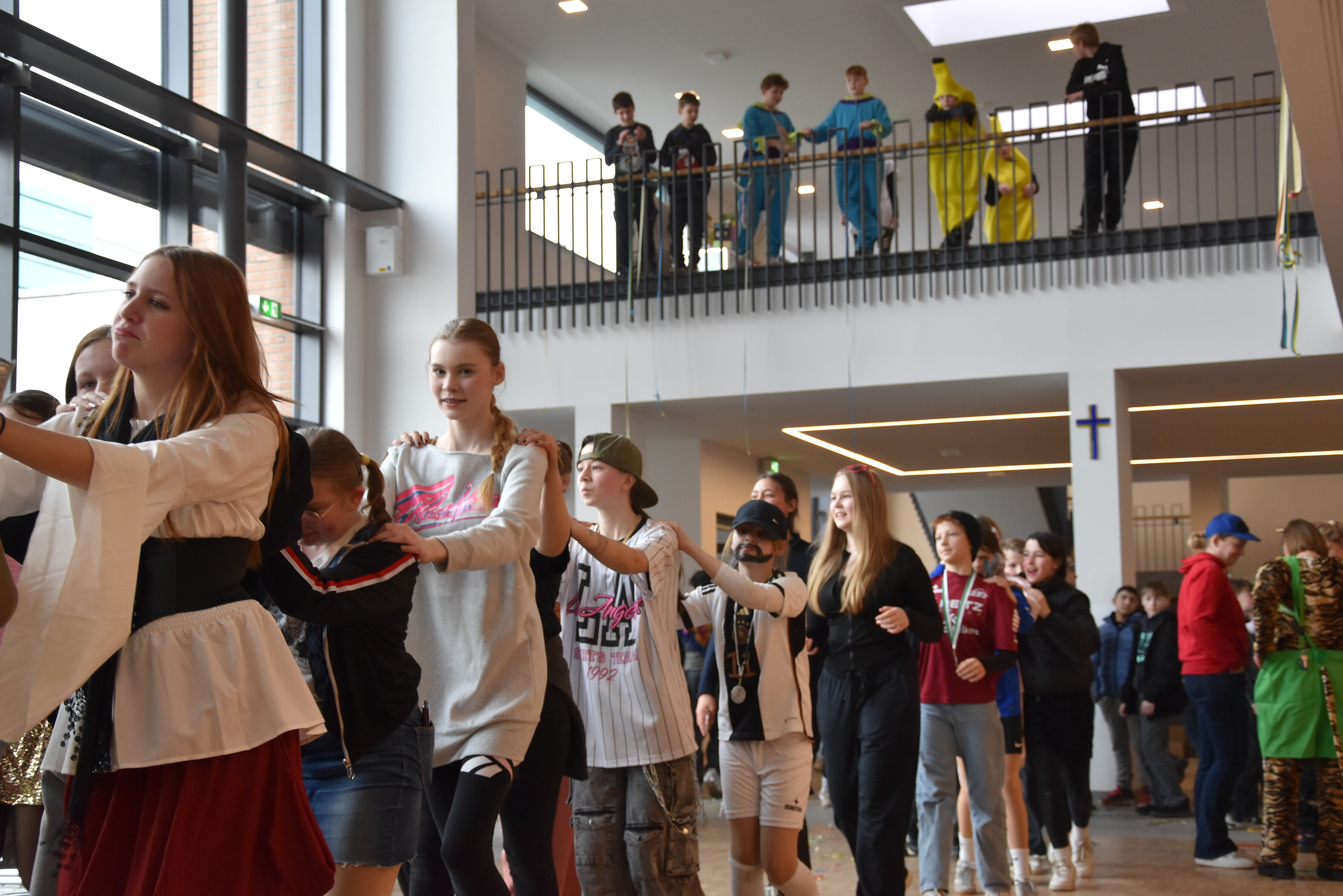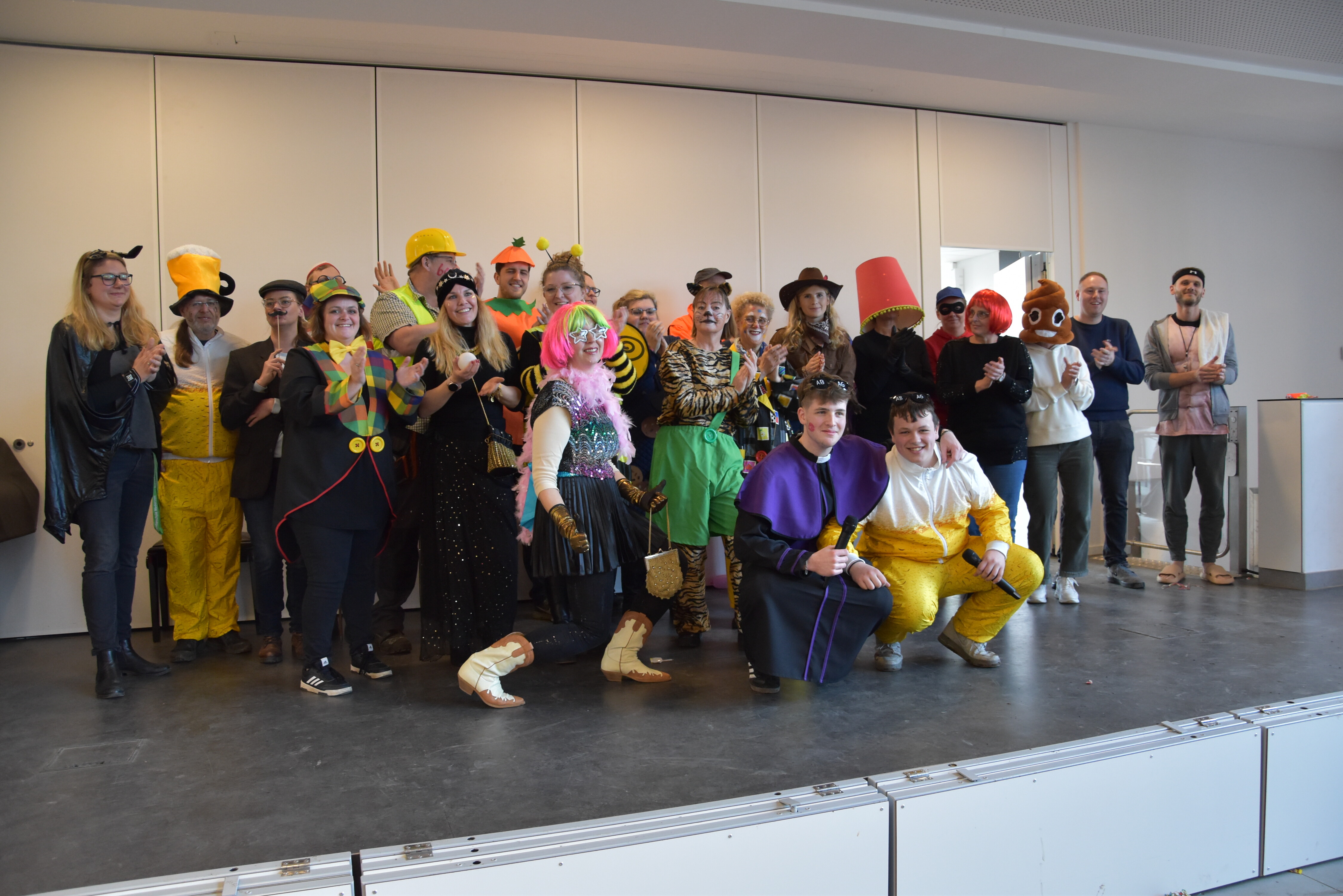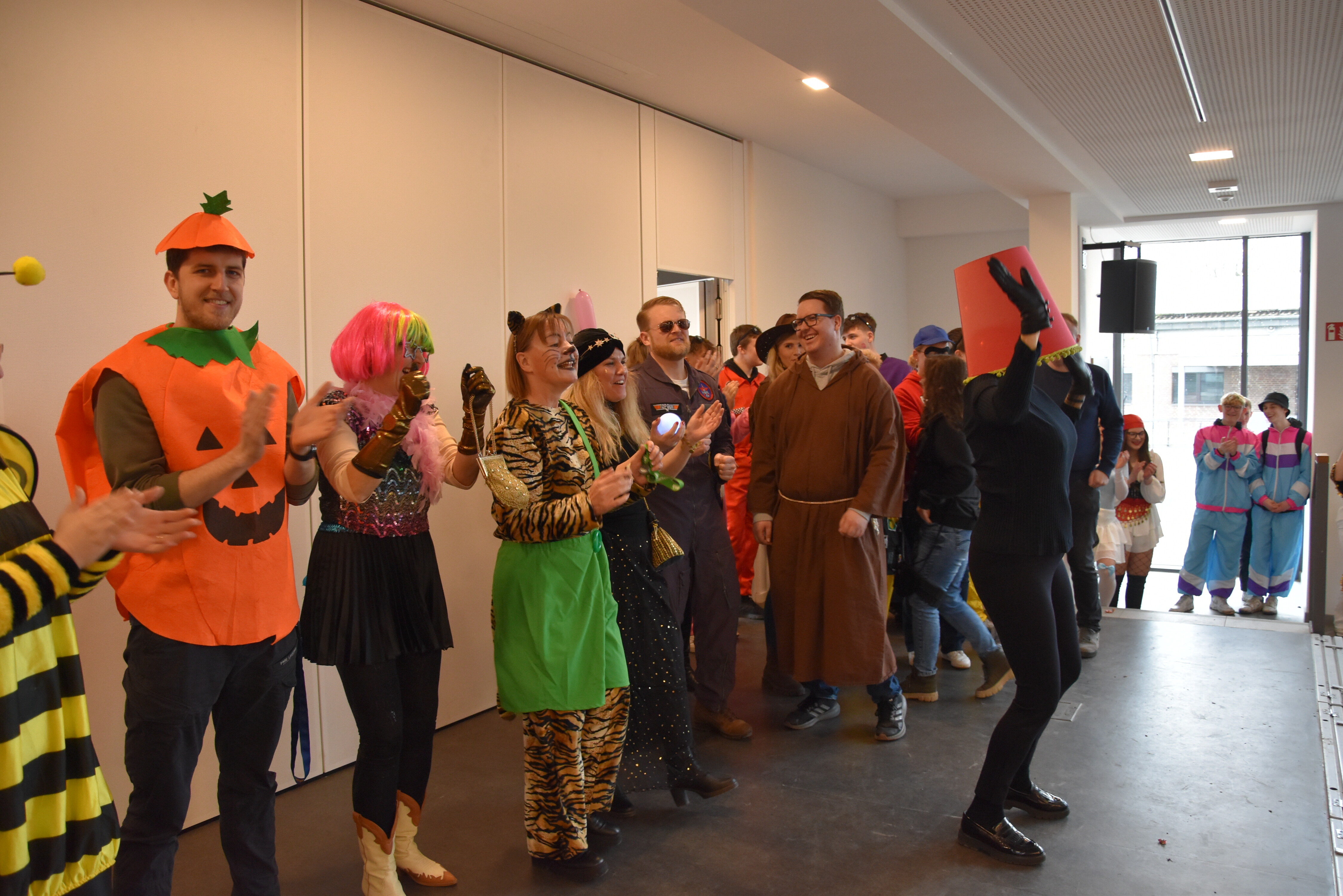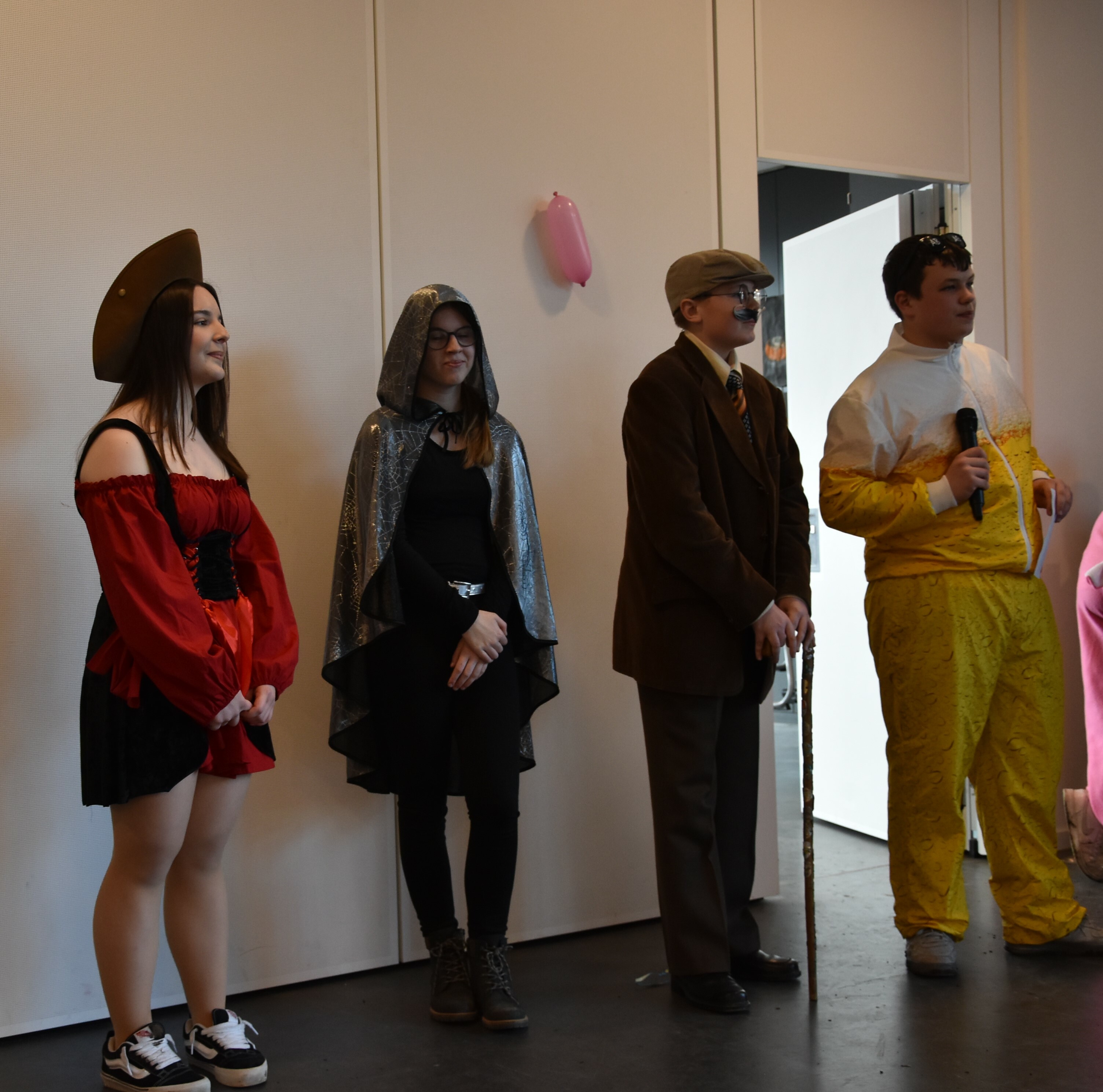 An unserer Schule gibt es so einige Traditionen, eine davon ist, dass man an Weiberfastnacht kräftig Karneval feiert. Jedes Jahr planen die 10. Klassen einen bunten Vormittag für alle Schüler und Schülerinnen mit Musik, Kostüm-Wettbewerb und allem, was man braucht, um in Karnevalsstimmung zu kommen. Auch dieses Jahr füllte sich die Mensa mit allerlei bunt verkleideten Kindern und Jugendlichen, die das Angebot der 10. Klassen gern und lautstark annahmen. Angefangen wurde der Schultag mit der Prämierung des besten Klassenkostüms. Nach der ersten Pause wurden die Schüler und Schülerinnen dann in einer nicht enden wollenden Polonaise in die Mensa geleitet, wo die Party mit Kostümprämierung und allerlei Unterhaltung dann bis zur zweiten Pause fortgesetzt wurde.