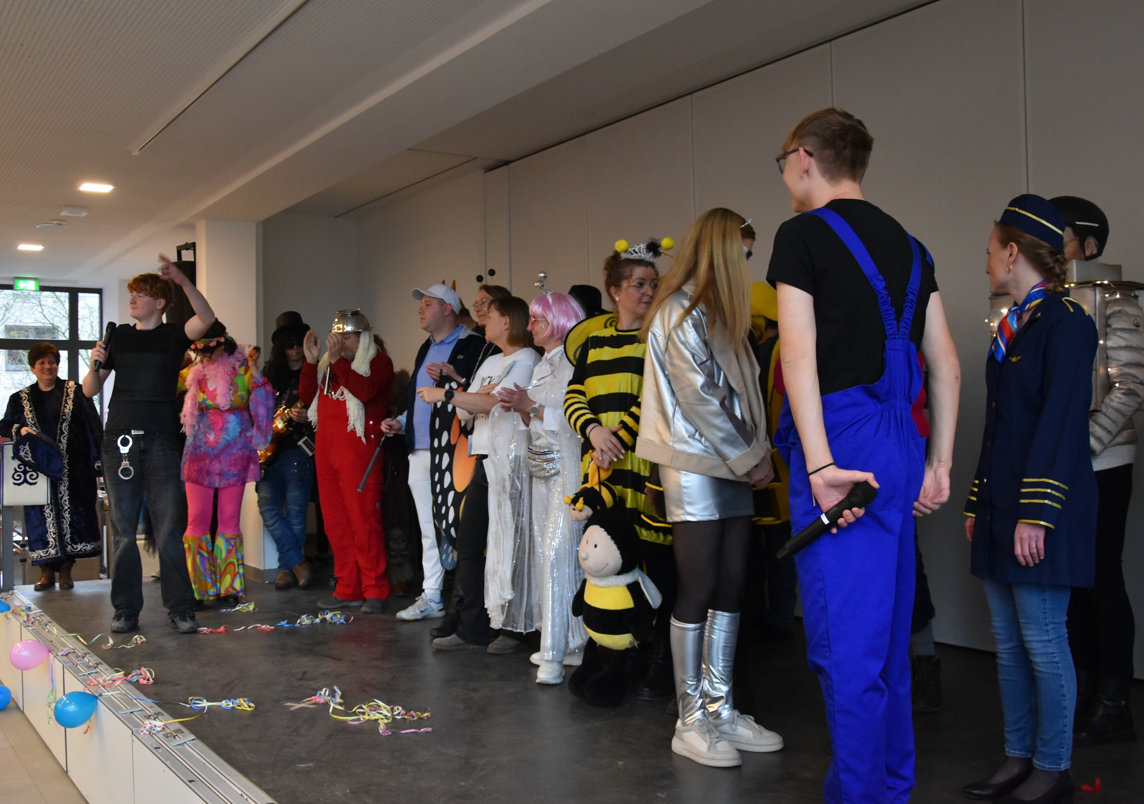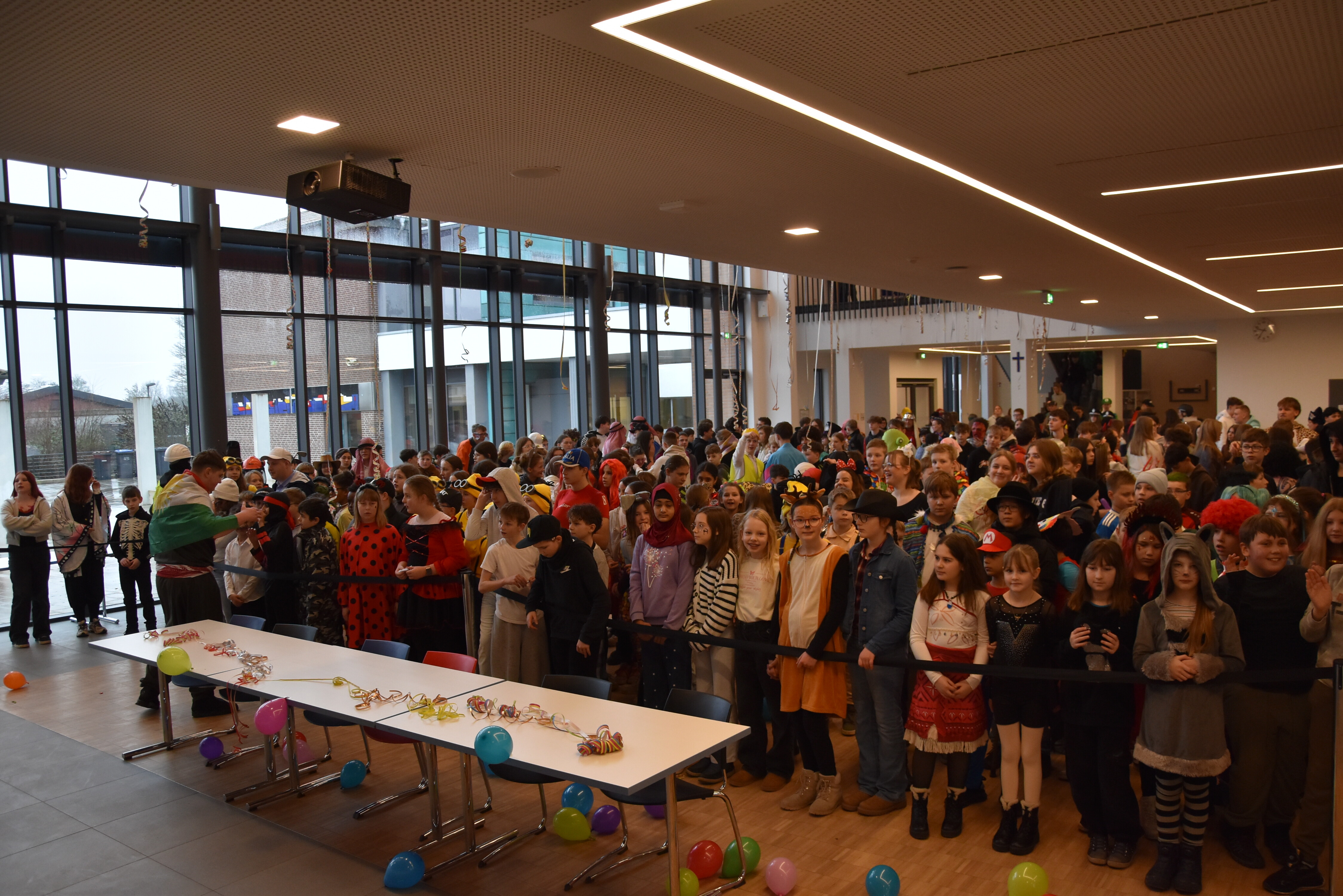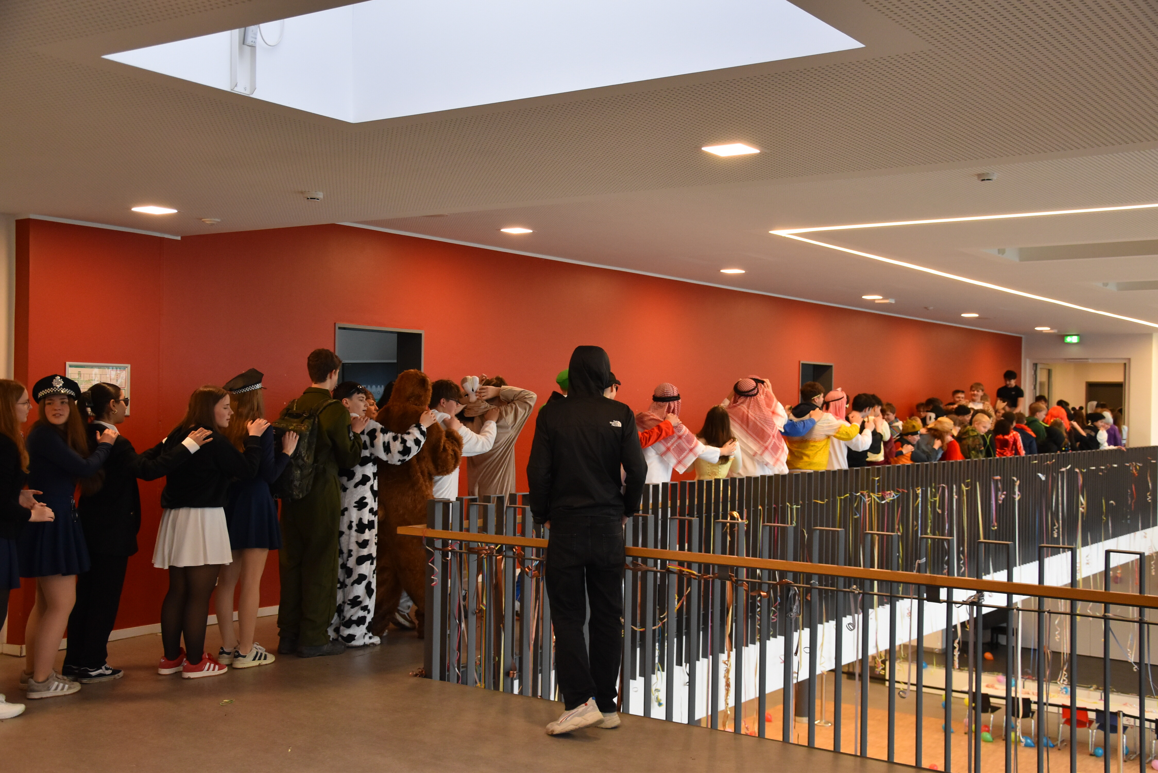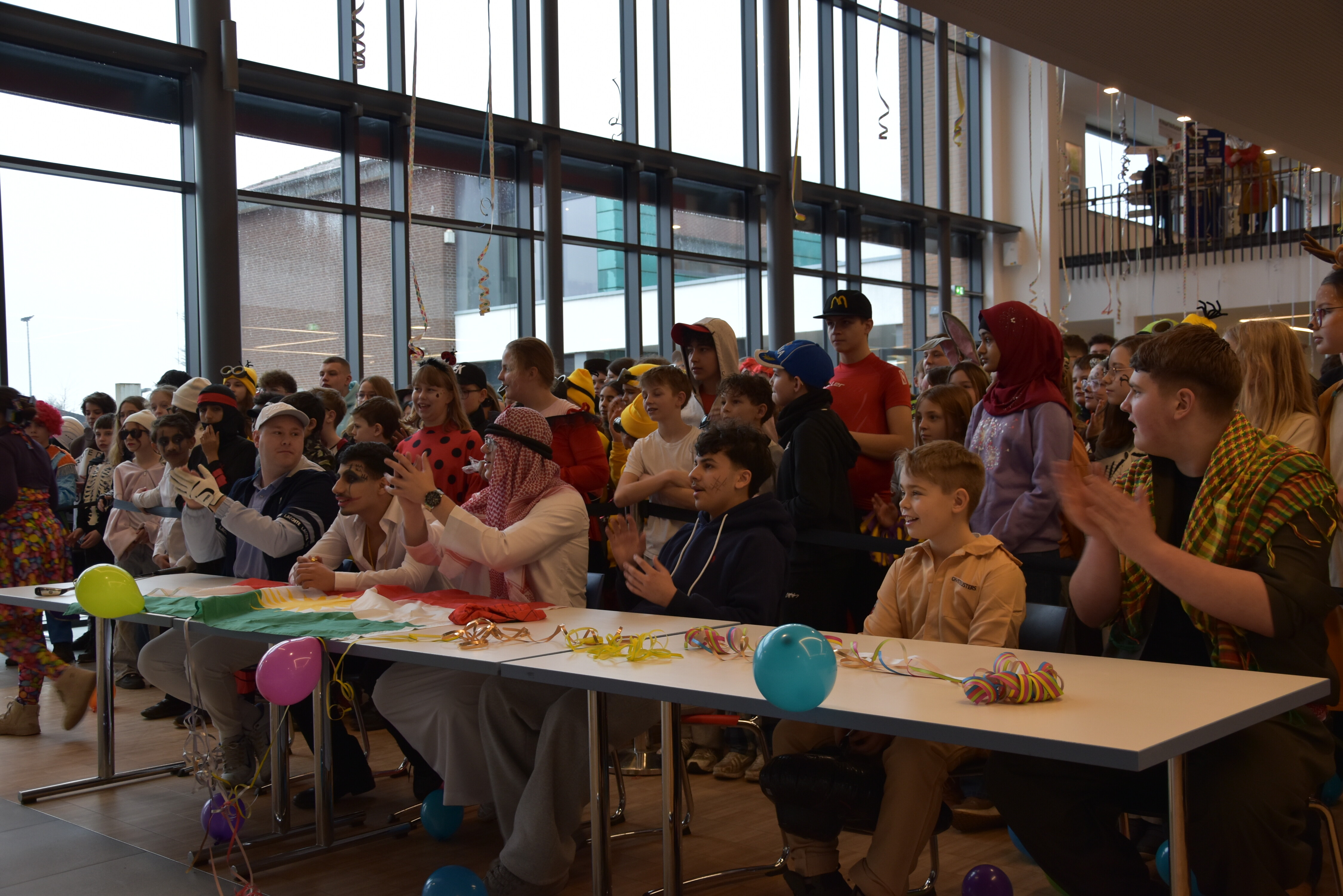 Traditionell wird an unserer Schule an Weiberfastnacht Karneval gefeiert. Hierzu übernehmen die 10er kurzzeitig die Schülerschaft, um mit ihnen in der Mensa ausgelassen zu feiern. Kostüme werden ausgezeichnet und bewundert, es wird getanzt und gelacht. Für einen kurzen Moment wird Unterricht mal hinten angestellt und die bunte Welt des Karnevals wird genossen!