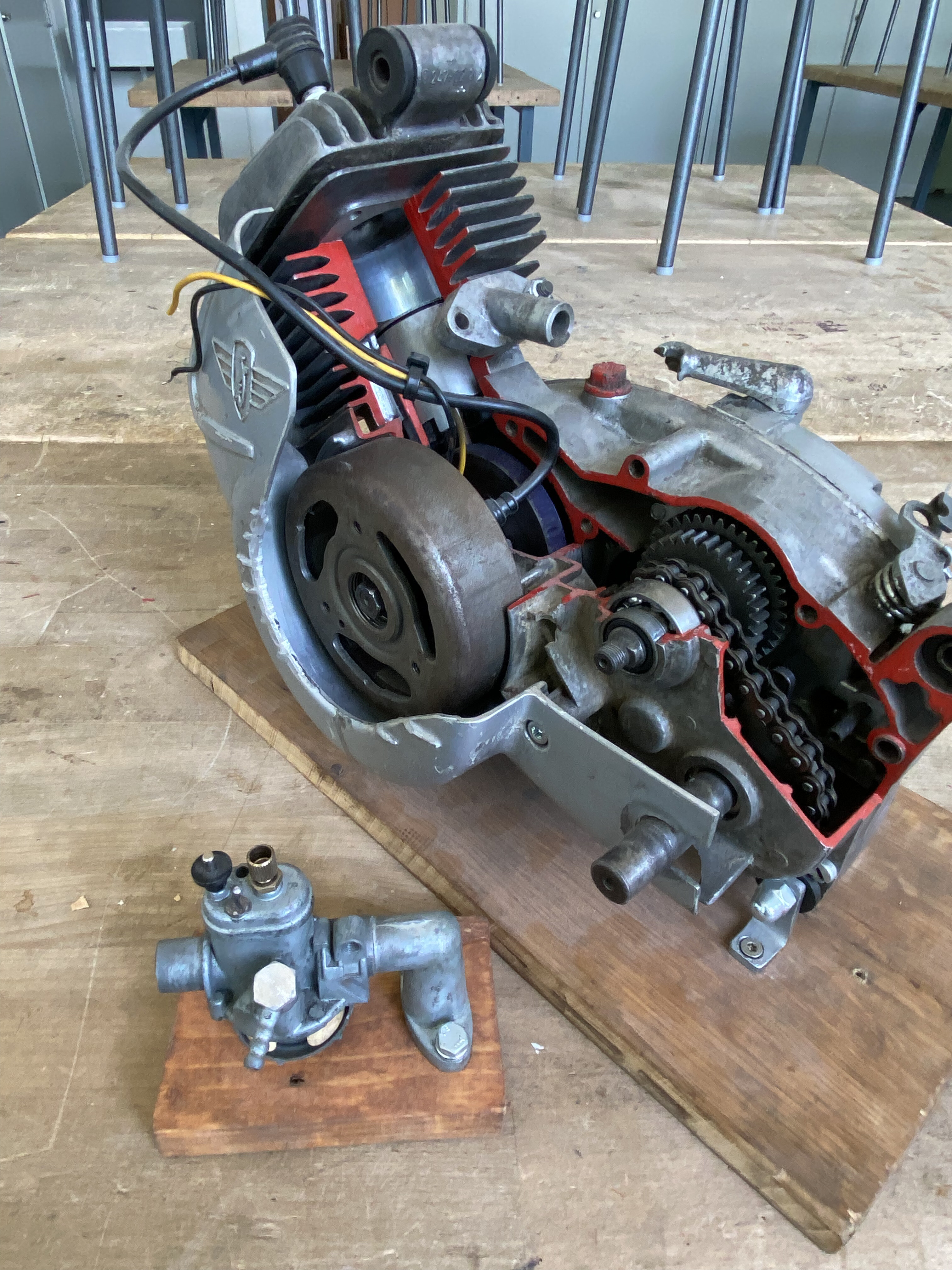 als Anschauungsobjekt für den Technikunterricht opferte er den 2-Takt-Motor aus einem Zündapp-Moped, schnitt ihn an mehreren Stellen auf und präparierte ihn aufwendig zu einem Modell, mit dem er uns dann überraschte.