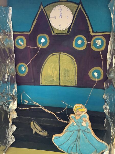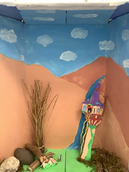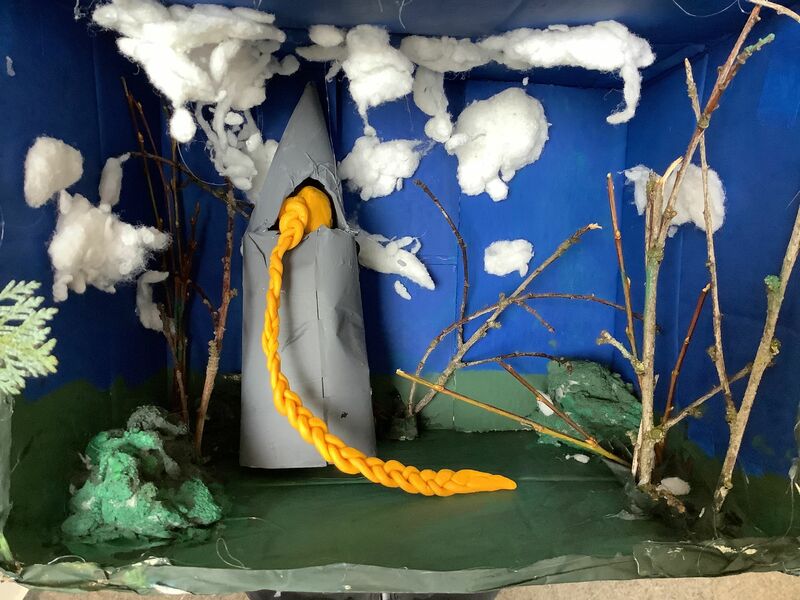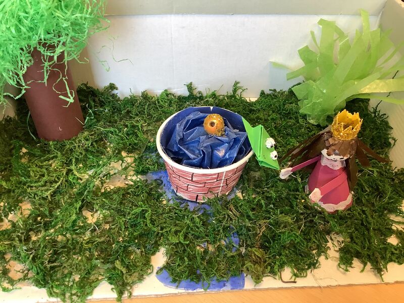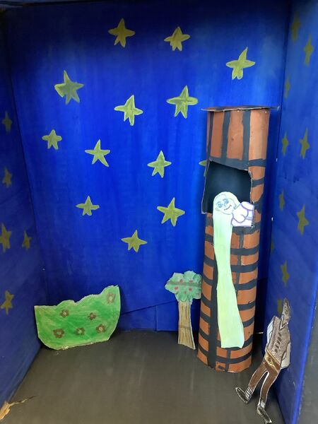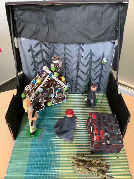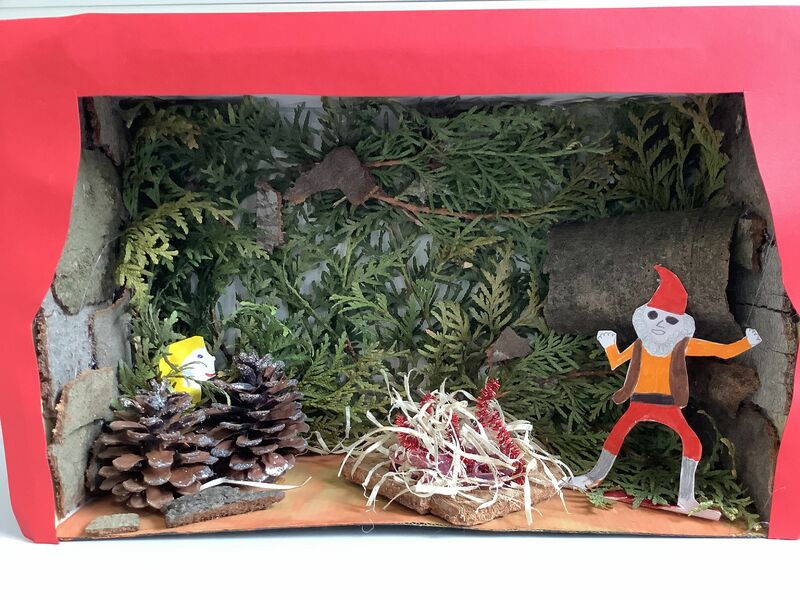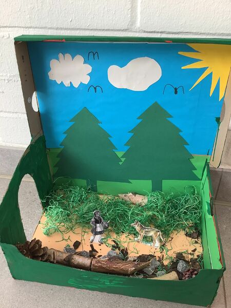 Zuerst musste ein passender Schuhkarton ausgesucht werden. Die ausgewählte Märchenszene wurde mit passenden Farben und Materialien gestaltet. Dabei war es wichtig, dass wir auch die Außenseiten des Kartons gestalteten, so dass sie nicht mehr nach Schuhkarton aussahen. Fertige Modellbauzubehör oder Spielfiguren waren nicht erlaubt. Figuren konnten wir aus Papier oder Pappe anfertigen.