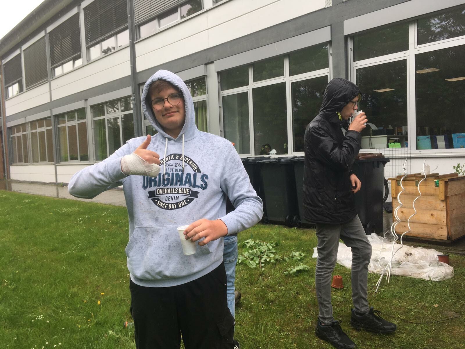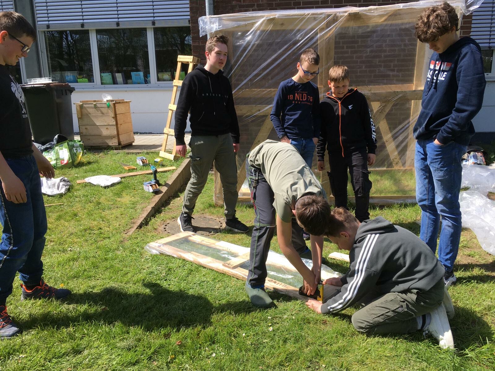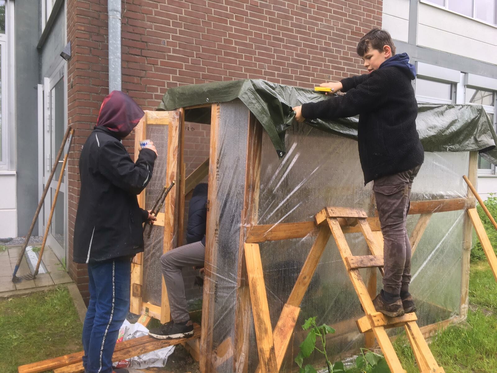 Das Richtfest für das selbst gebaute Tomatenhaus konnten wir zwar nur im Regen feiern, aber trotzdem konnten besonders die „ Bauherren" sehr stolz auf sich sein.