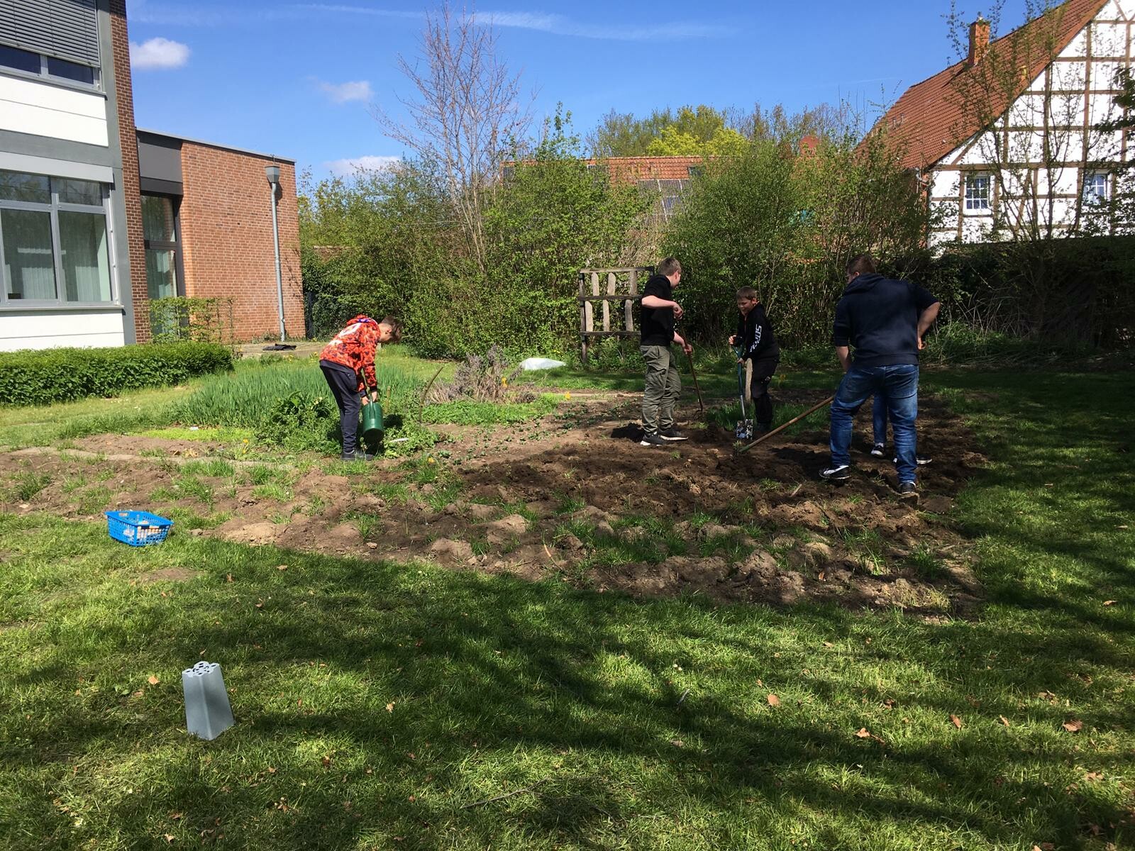 Dank auch an unseren Hausmeister für die Unterstützung mit Schlauchrolle und Schubkarre und auch Dank an die Gärtner der Gemeinde, deren Arbeit durch unseren Garten nicht leichter wird.