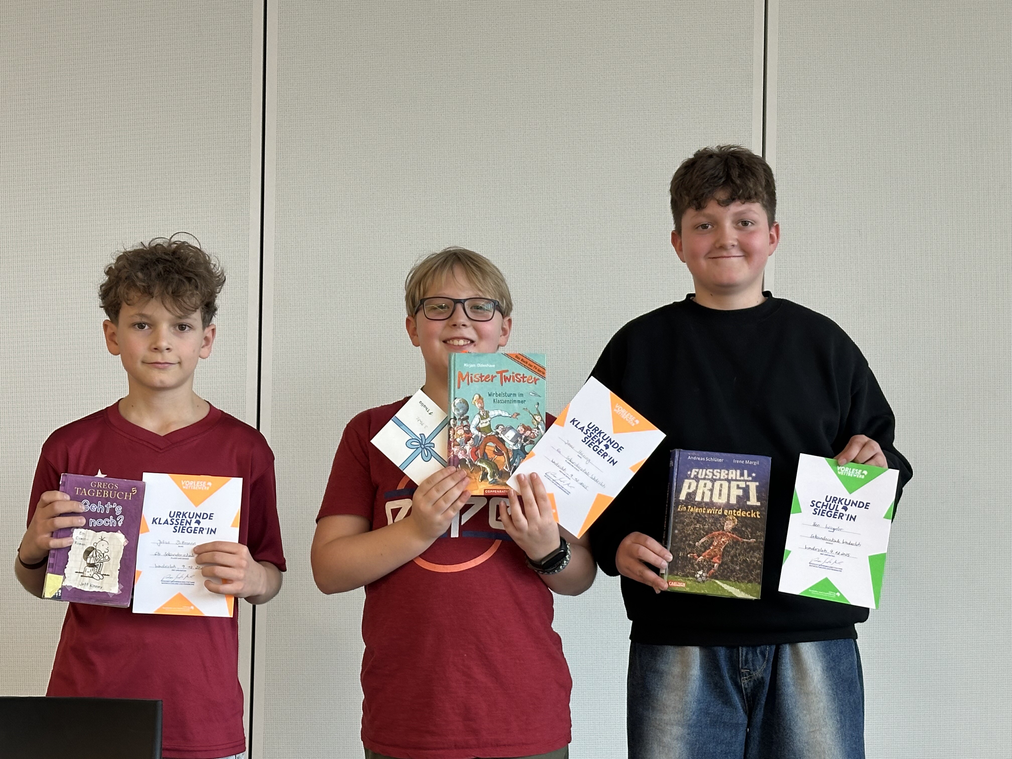 Bereits im Dezember fand der jährliche Vorlesewettbewerb der 6. Klassen statt. Den Sieg holte sich Ben Wiegeler aus der Klasse 6c. Er las aus seinem Lieblingsbuch "Fußball-Profi" vor und überzeugte die Jury damit. Julius Dittmann aus der 6b holte mit seinem Buch "Gregs Tagebuch 5" den zweiten und Jonas Höring aus der 6a mit "Mister Twister" den dritten Platz. Die drei Jungen waren als Klassensieger aus der Vorauswahl hervor gegangen.